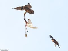 Probably the most action packed afternoon I've ever seen at Torrey Pines. There was some routine sparring, but then Mom brought in a snowy egret carcass. One juvenile snagged it and the others went back to screaming and sparring. Dad showed up in the middle of that to do a food transfer with Mom, who then gave it to one of the juveniles. A short while later, he brought another kill, and a tug of war ensued between the juveniles. They dropped the food and Mom scooped it up and transfered it back to one of the kids...