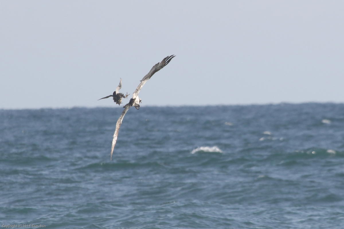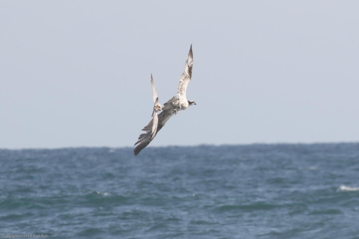 The parents are leaving the nest unattended for long periods of time (an hour or more). Among the more interesting events of the day, a young sea lion beached itself and sat on a rock for a while. Around 5pm, mom came in with what must have been a large dinner - she spent ~30 minutes feeding the juveniles. Not long after, the male came in with another kill and they did a mid-air exchange.