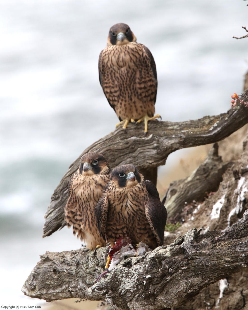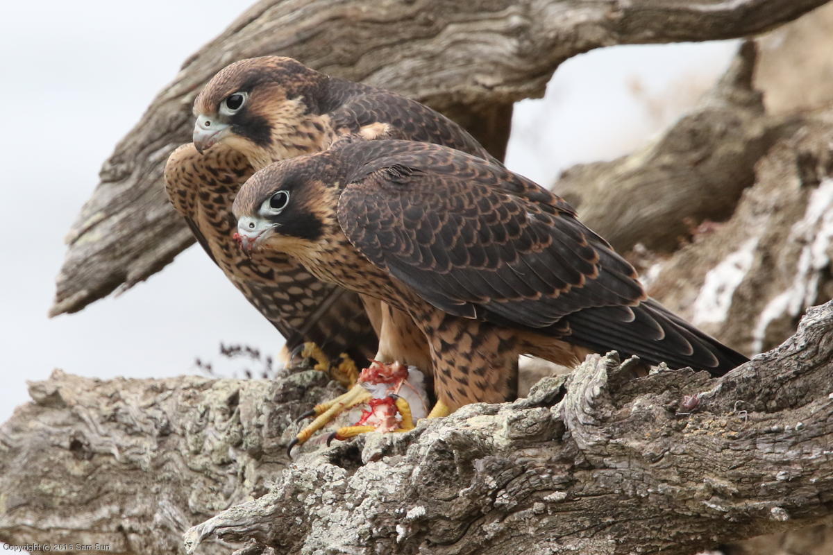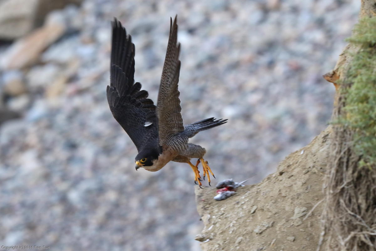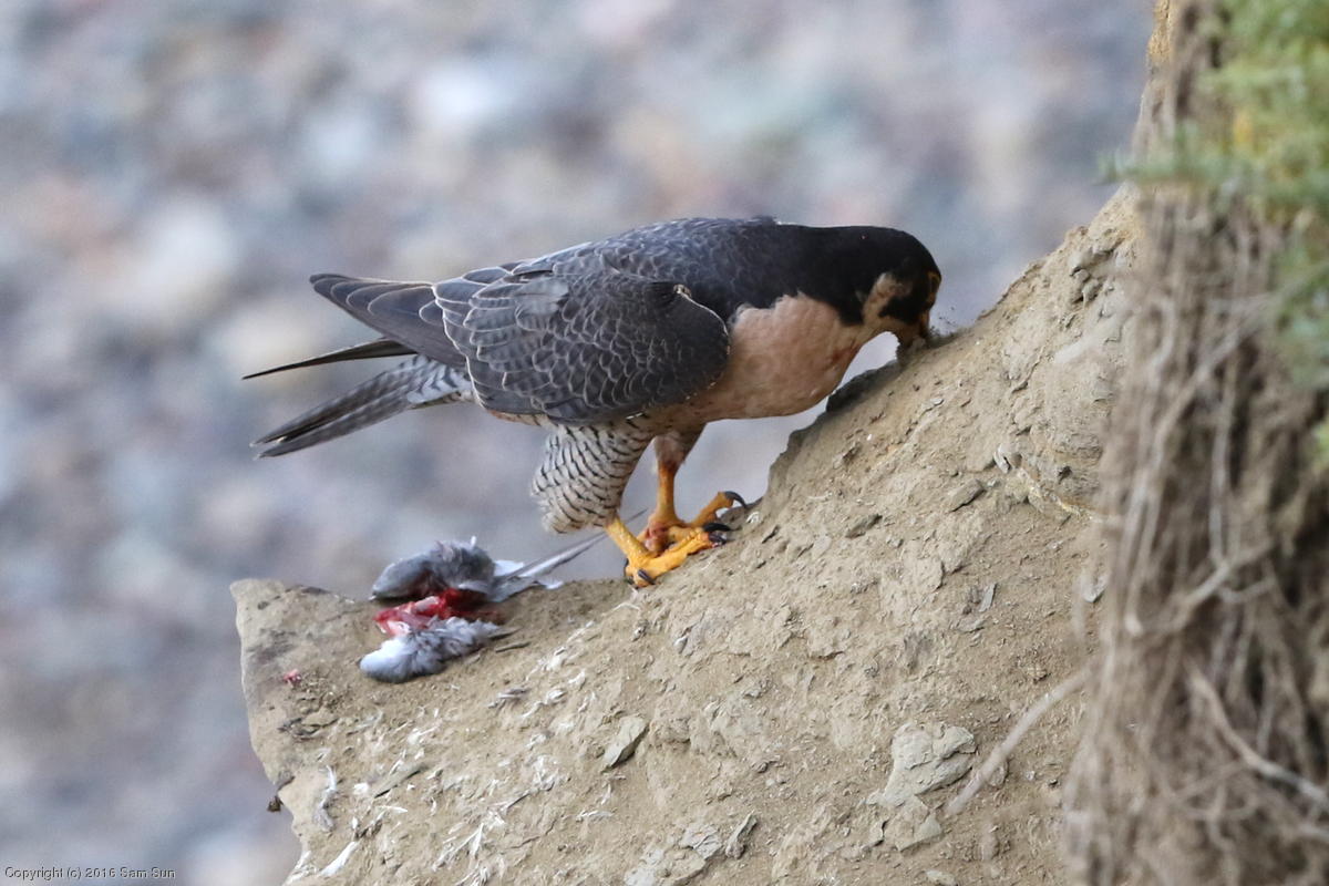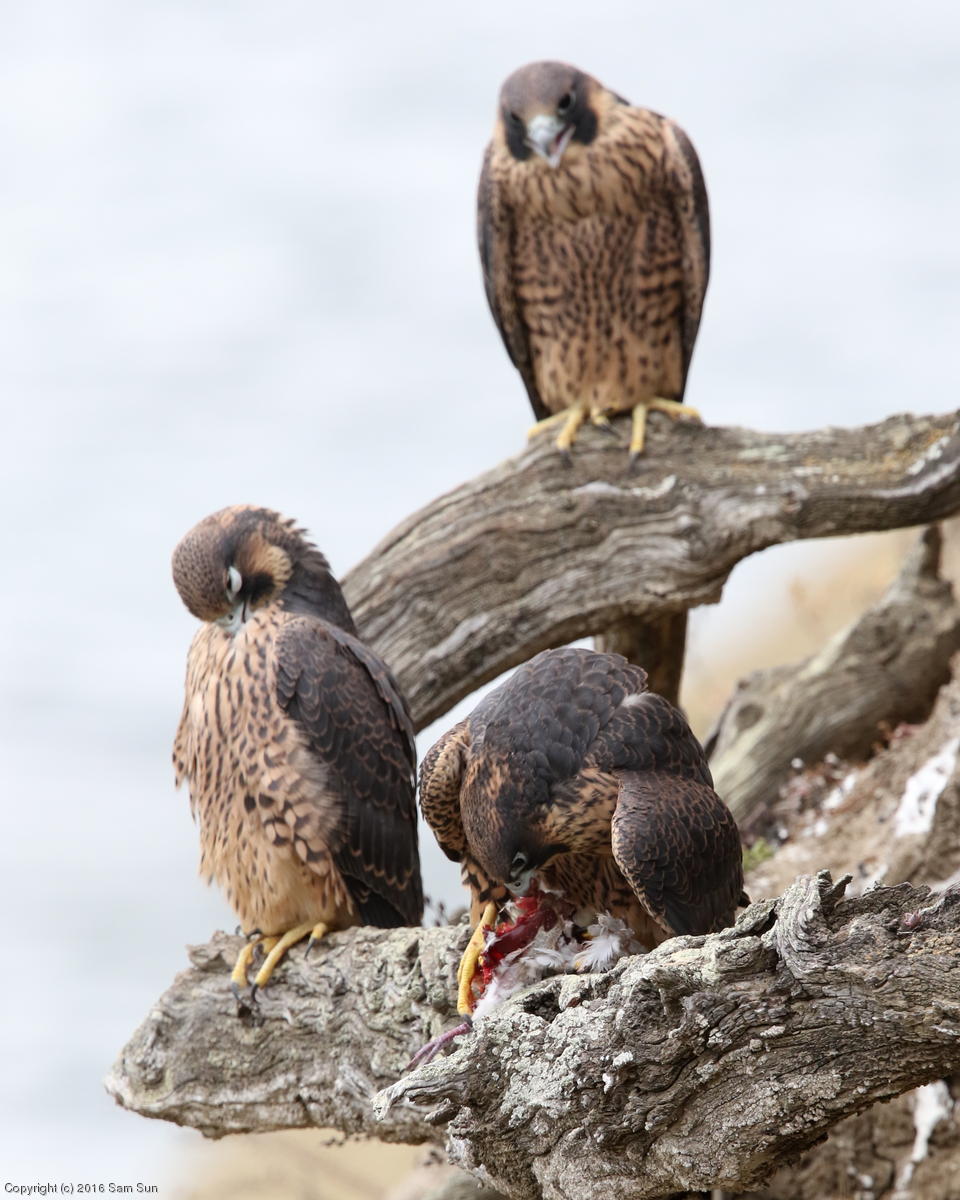 A good look at some up close activity today. Mom went hunting just below me on the cliff and came up with a dove, which she plucked about 100 feet away. Later in the morning, all three juveniles posed on the branches by the photo landing.