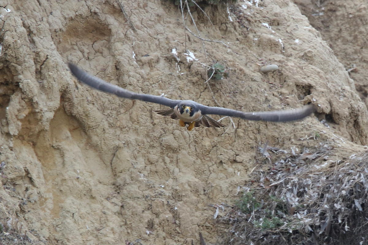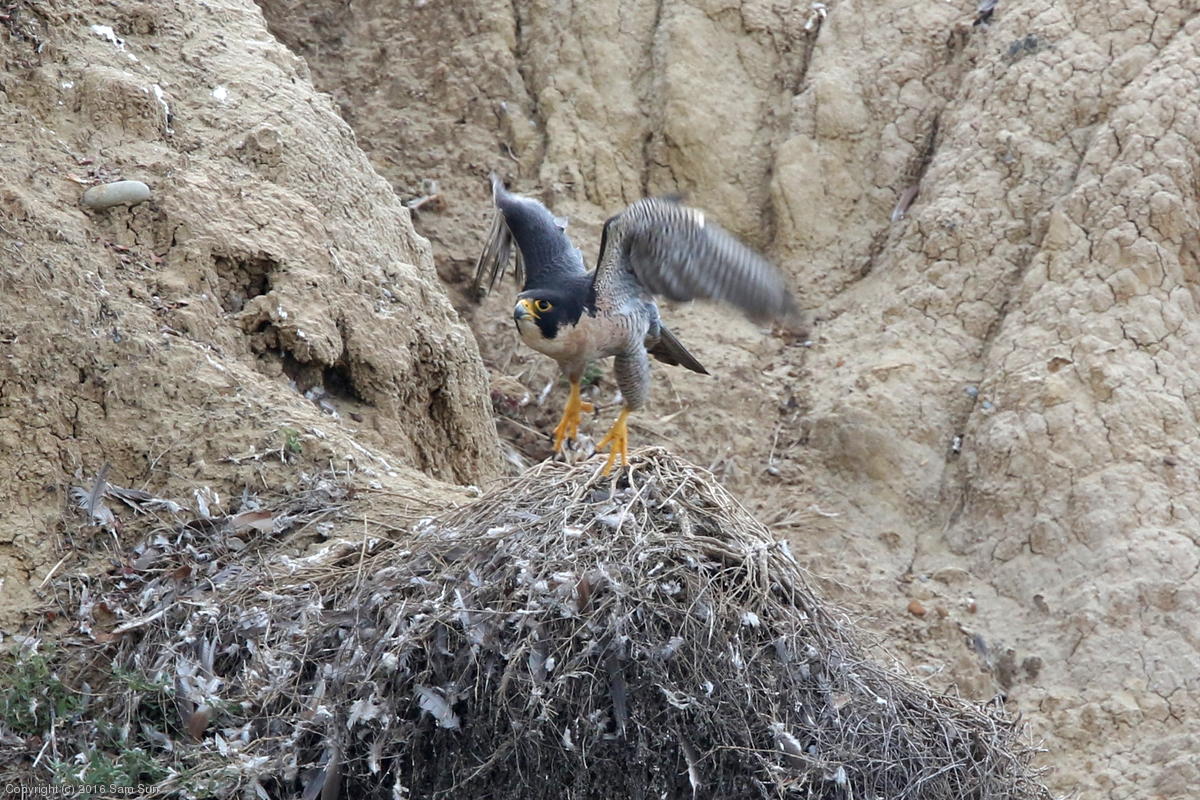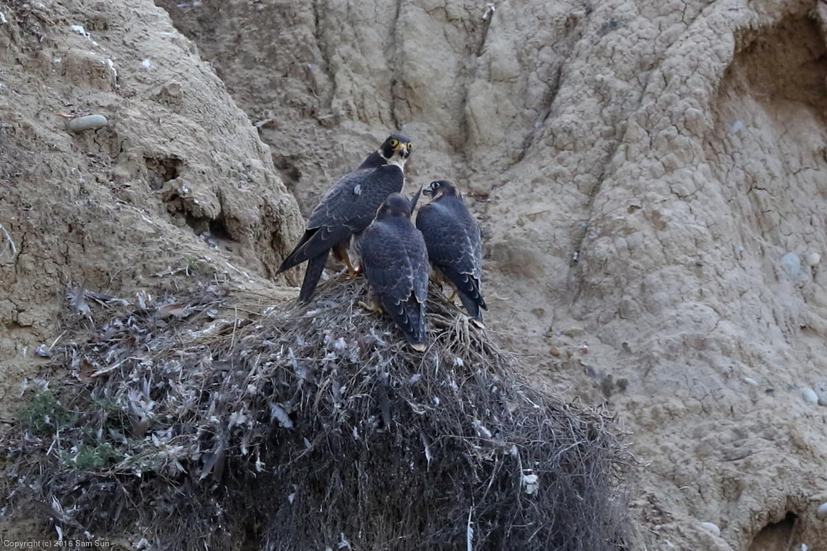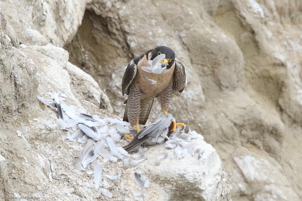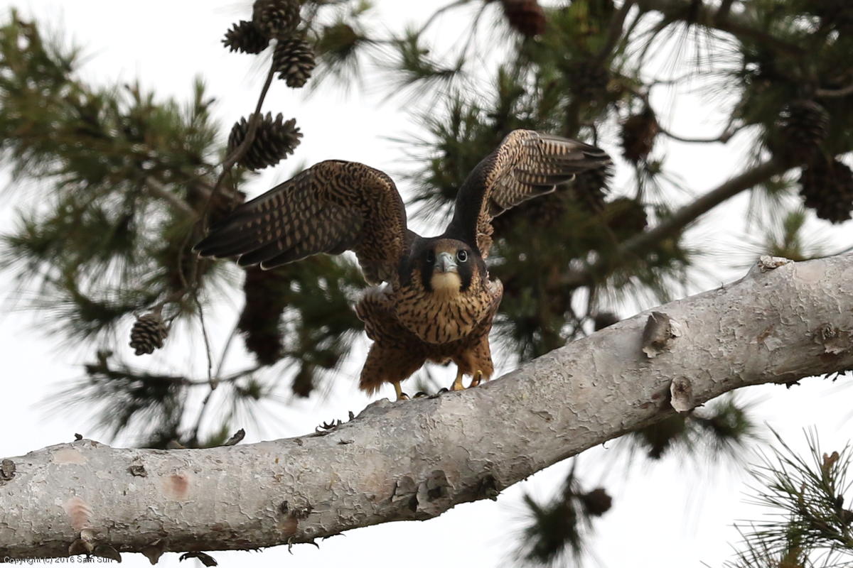 A good look at some up close activity today. Mom went hunting just below me on the cliff and came up with a dove, which she plucked about 100 feet away. Later in the morning, all three juveniles posed on the branches by the photo landing.