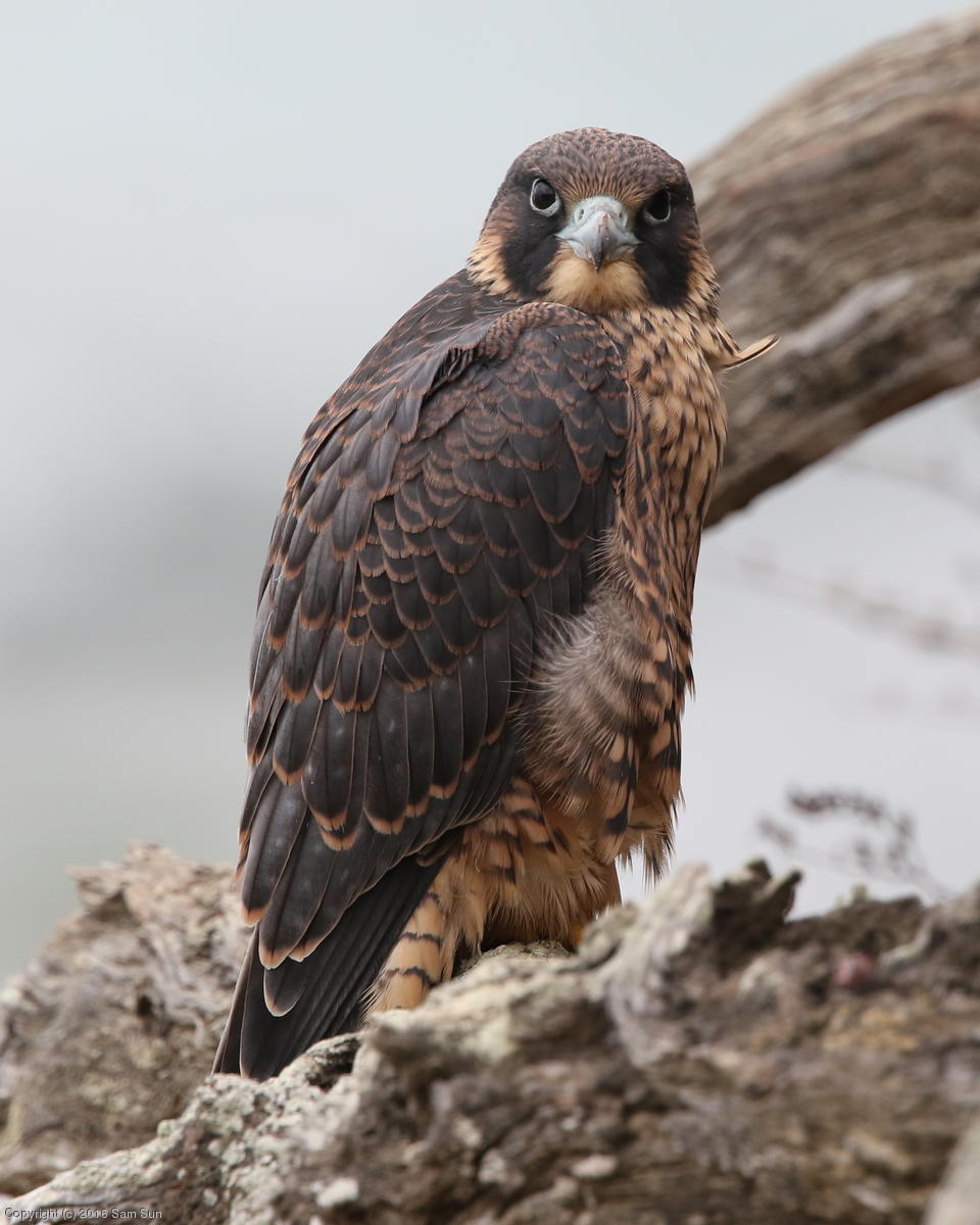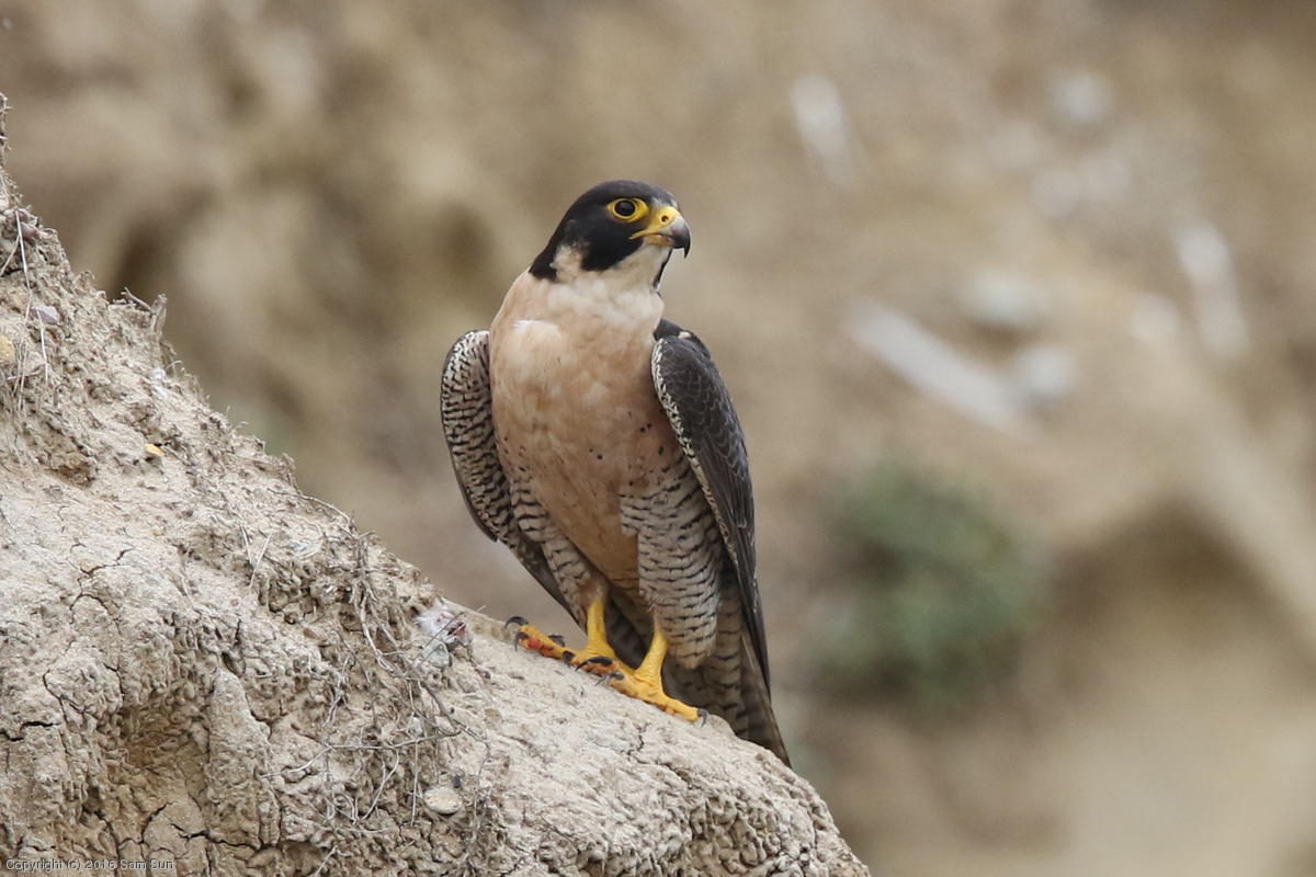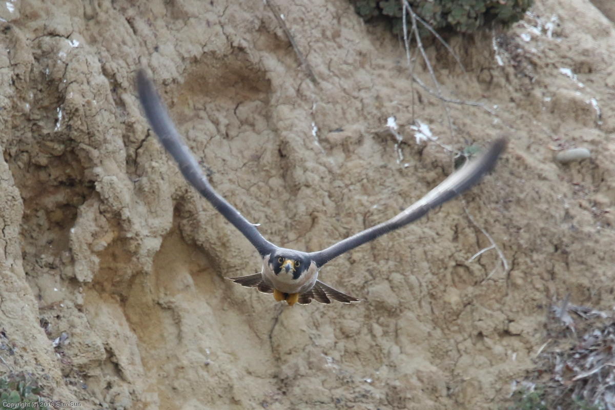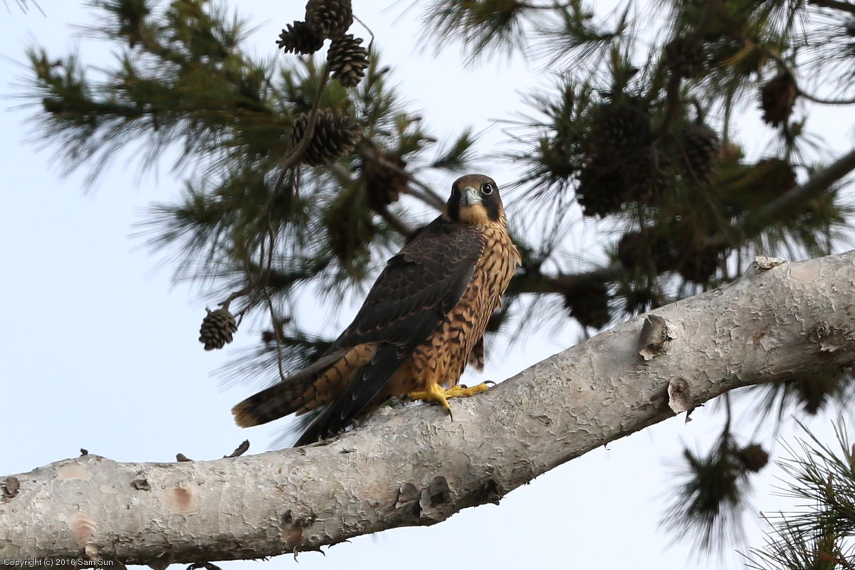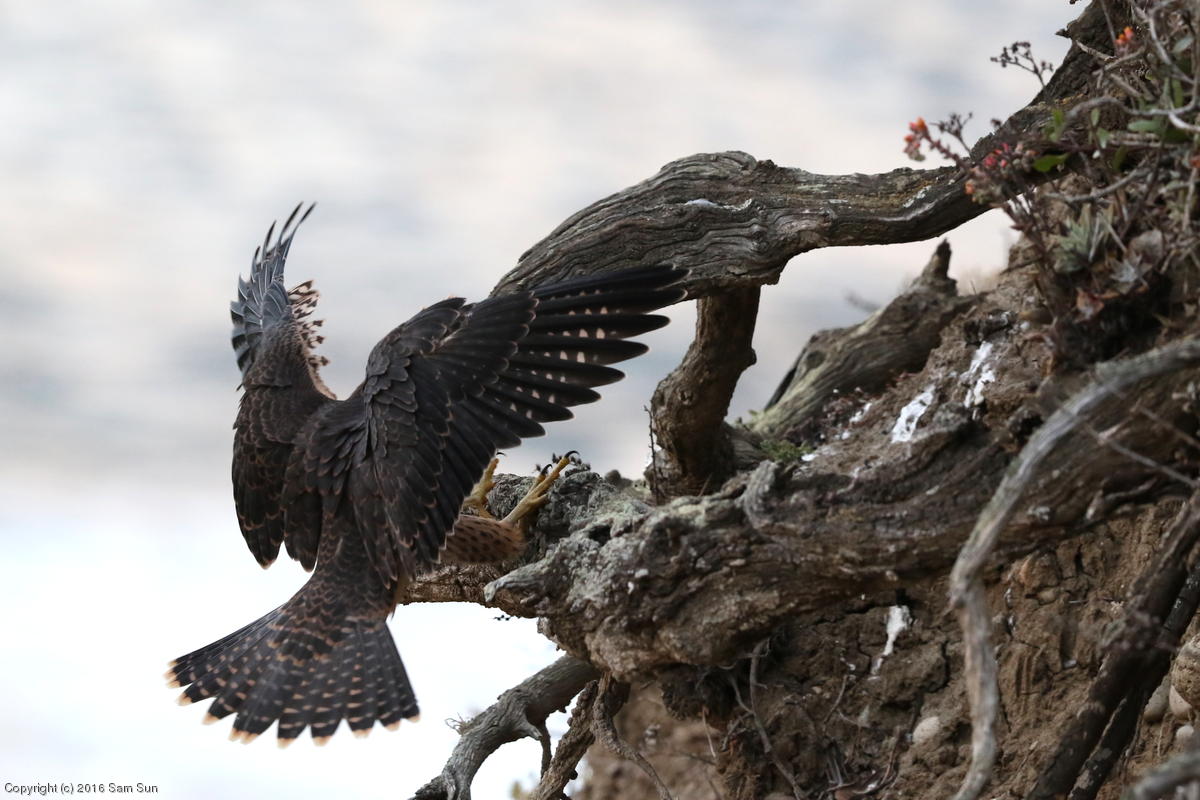 A good look at some up close activity today. Mom went hunting just below me on the cliff and came up with a dove, which she plucked about 100 feet away. Later in the morning, all three juveniles posed on the branches by the photo landing.