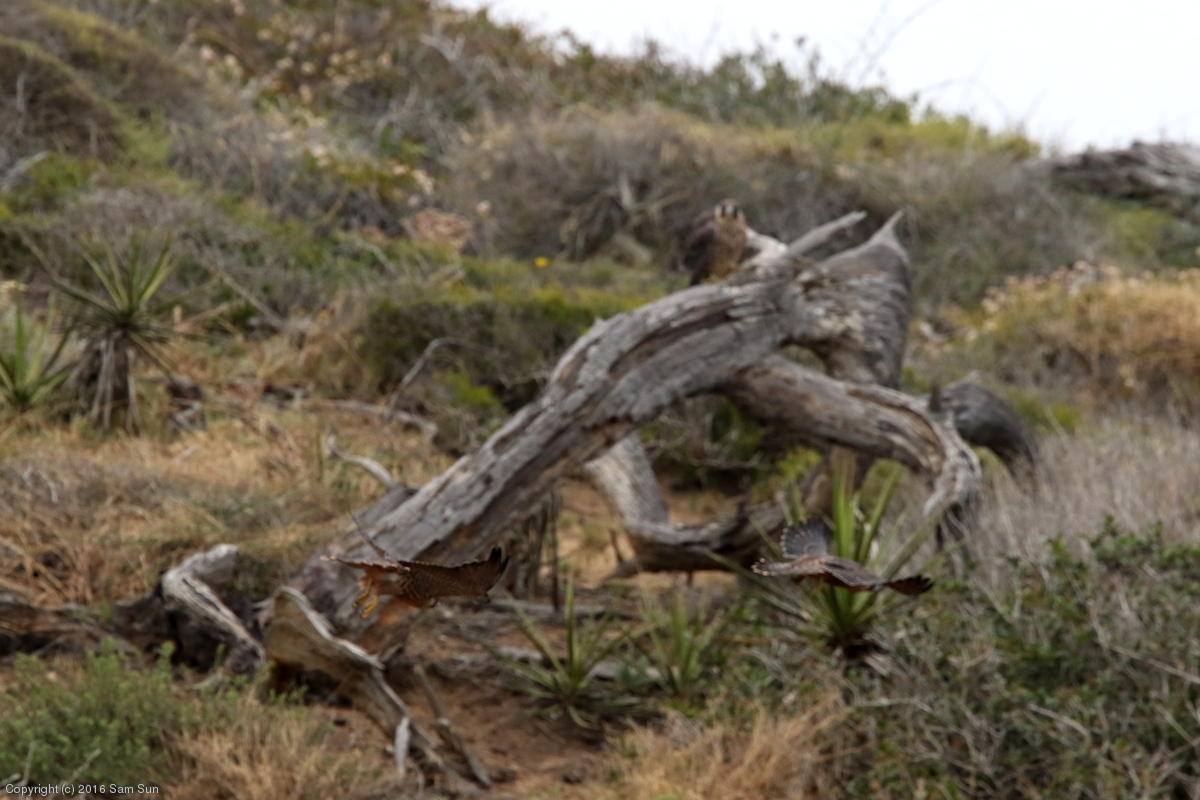 I wound up staying at Torrey Pines most of the day. Another photographer reported a food transfer about 7:45a, just before I arrived. The morning was slow, but the sun was out in the afternoon, and all three juveniles started zooming around the length of the trail.