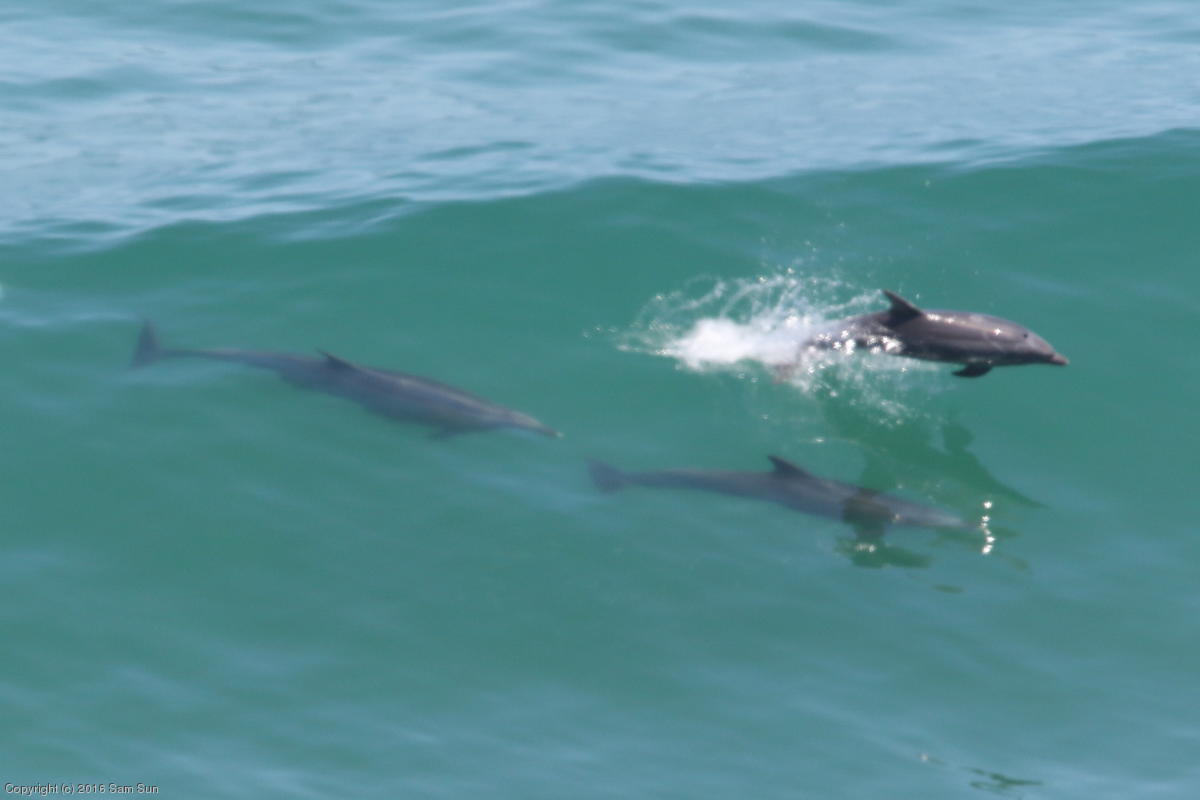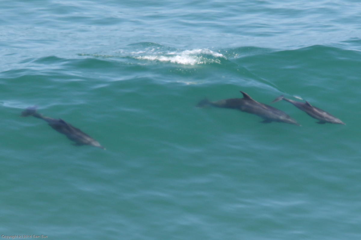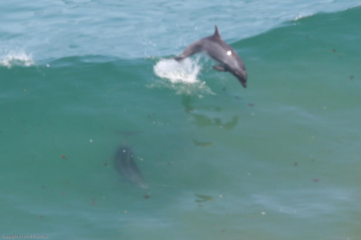 Some dolphins were riding the surf offshore
