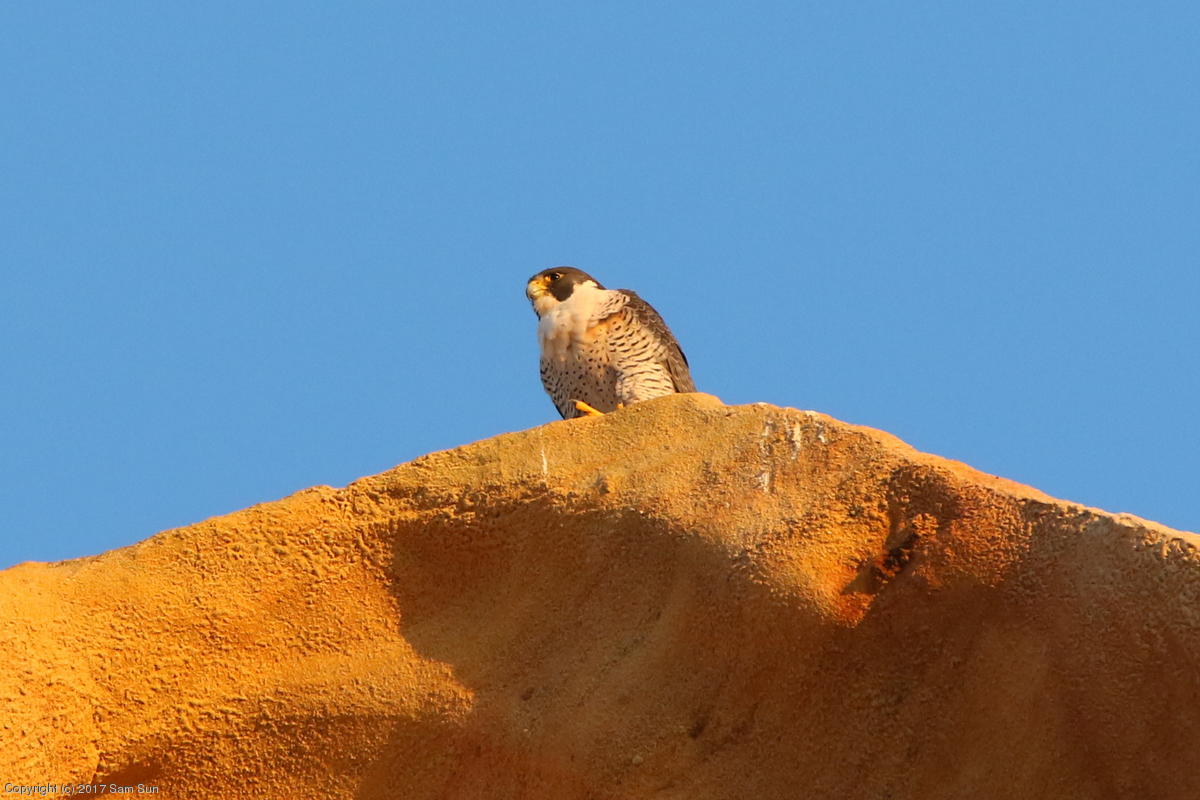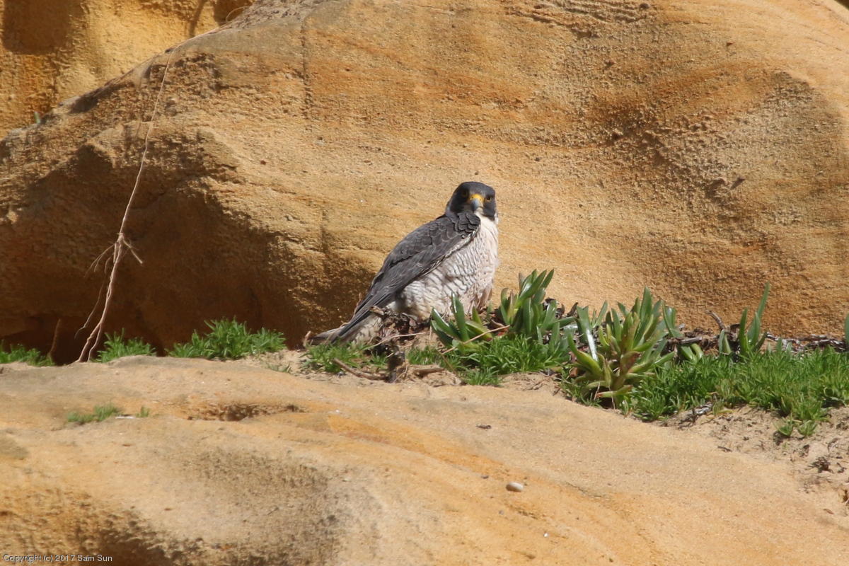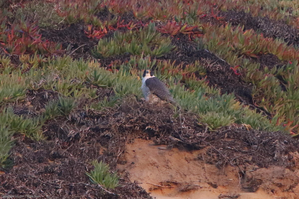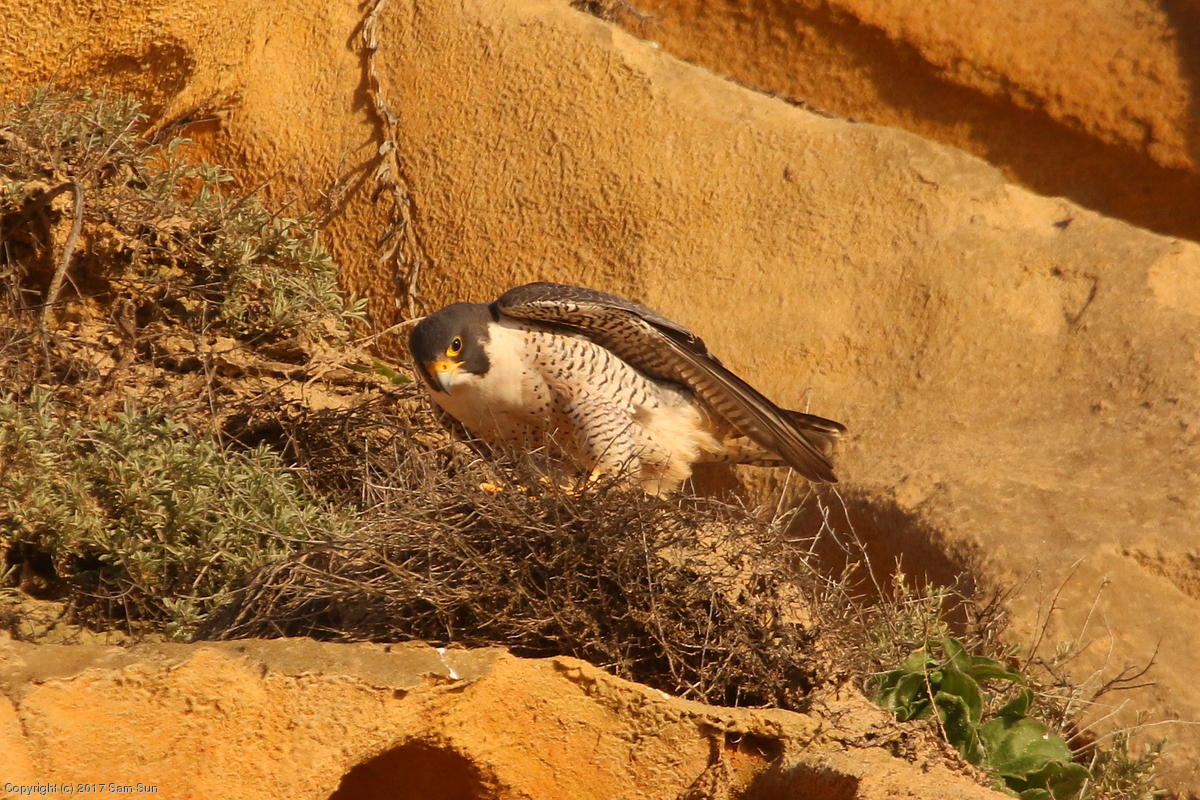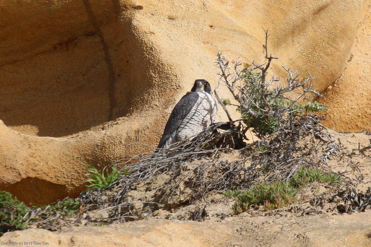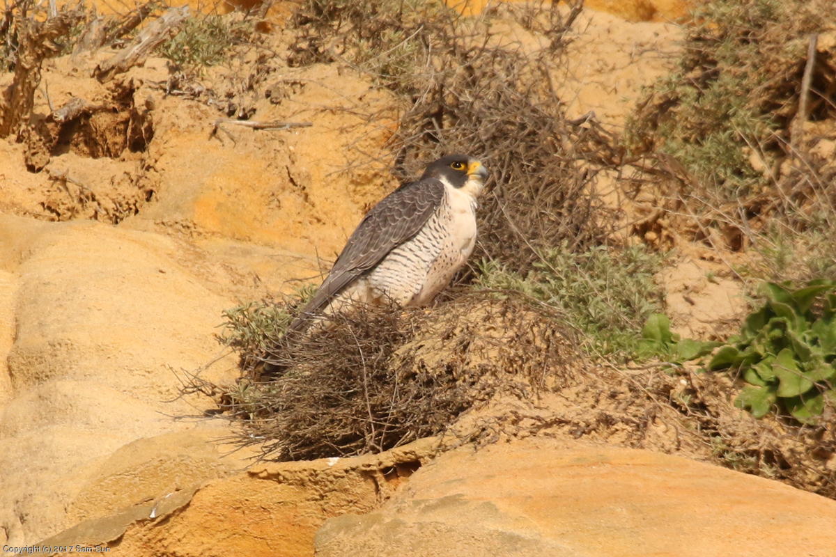 The female was perched near the nest all afternoon. The male made one flyby, with the female calling to him, but he went off towards the lagoon and didn't return before sunset. Herb Knufken reported the male's band number in September - it's a 3 year old from Lassen County.