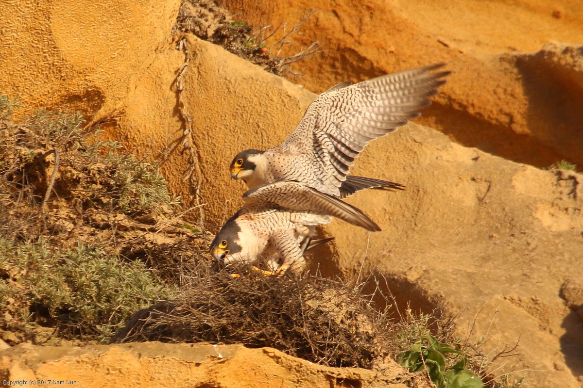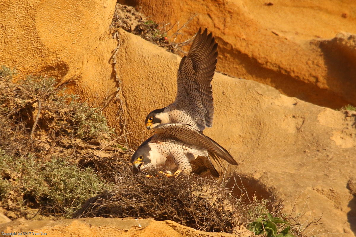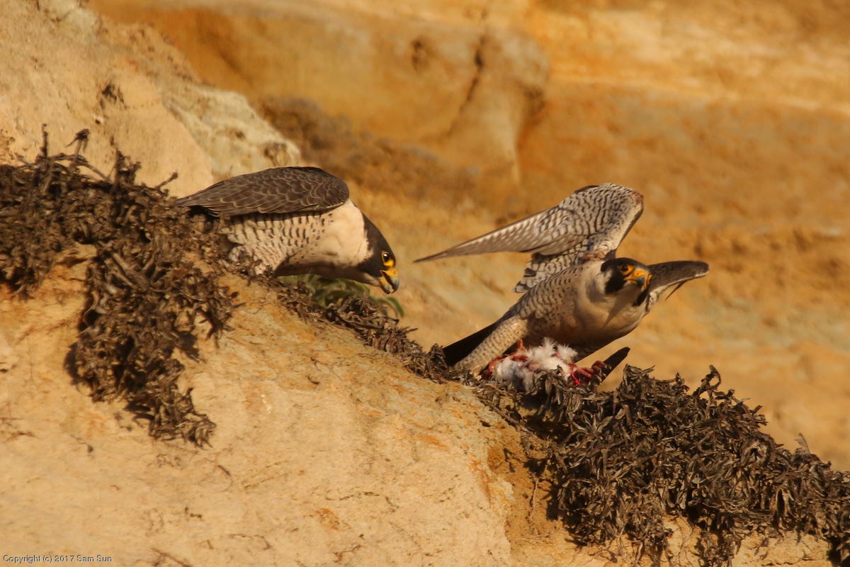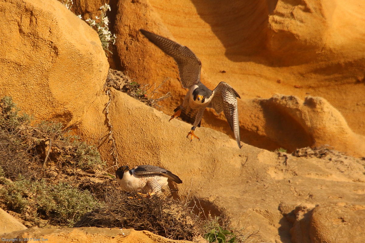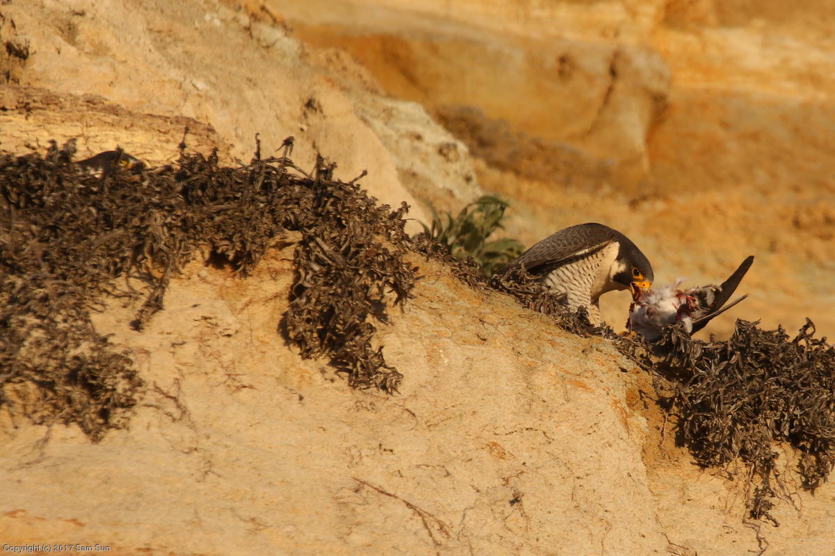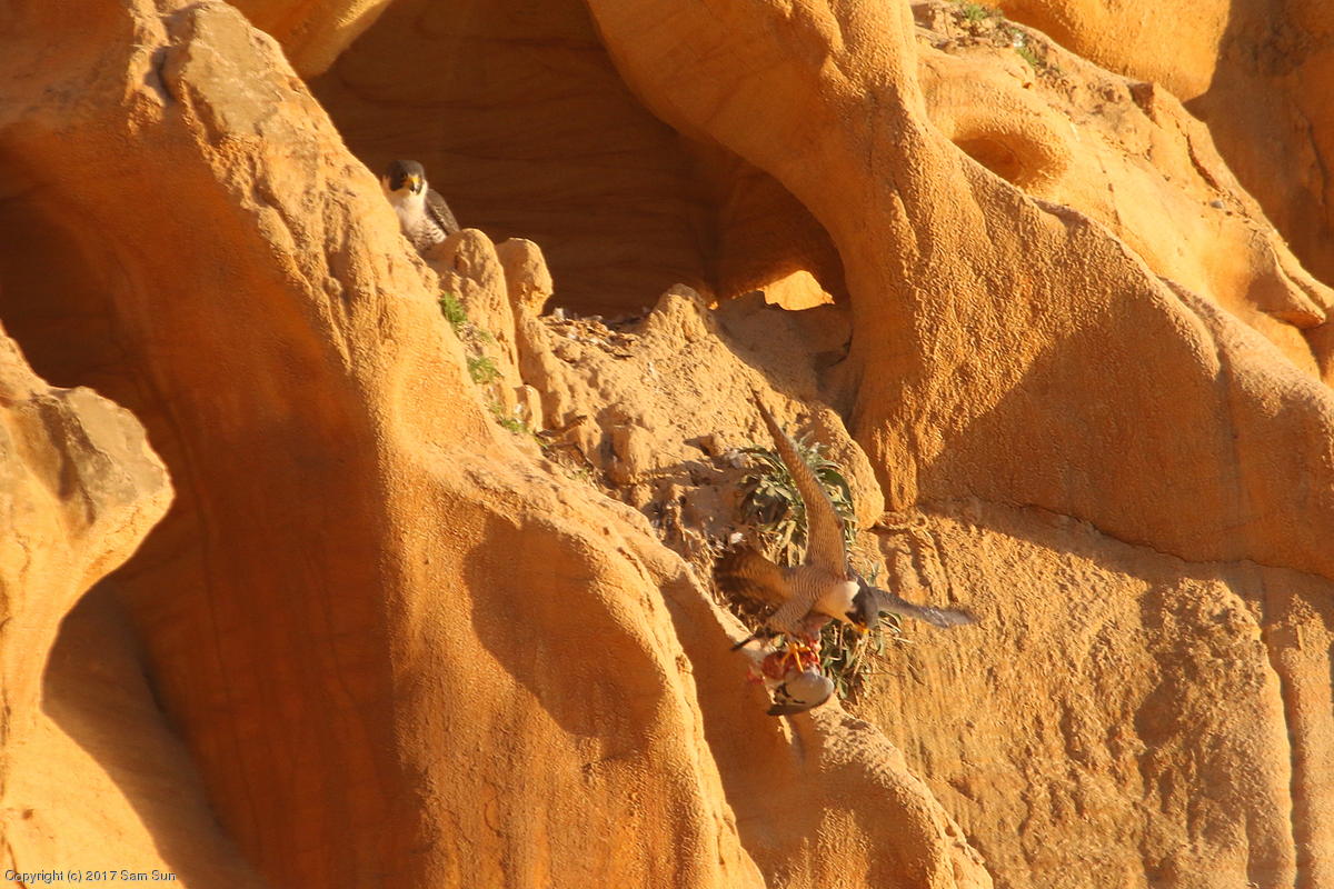 For a while, it seemed like nothing was going to happen again today. After sitting around for an hour, the female flew in the nest cave and called to the male, but he ignored her. They finally mated half an hour later, after which the male retrieved a pigeon and refused to share it.