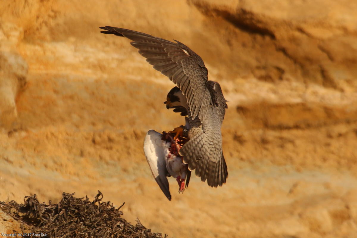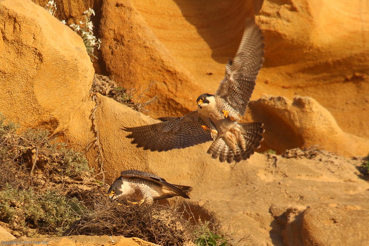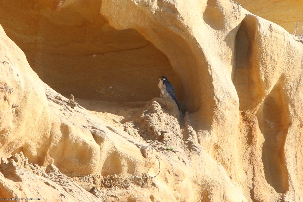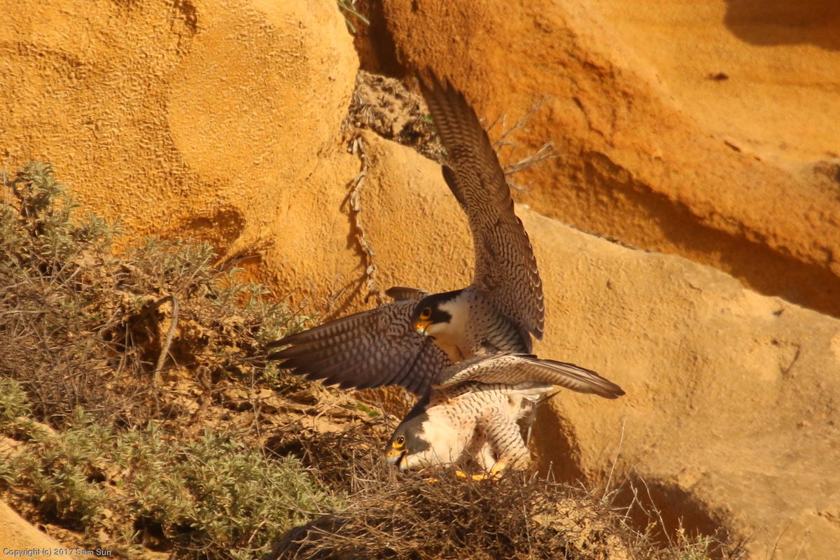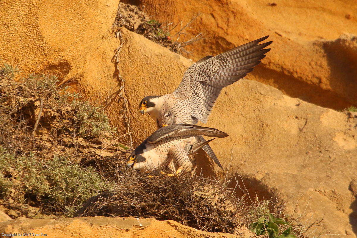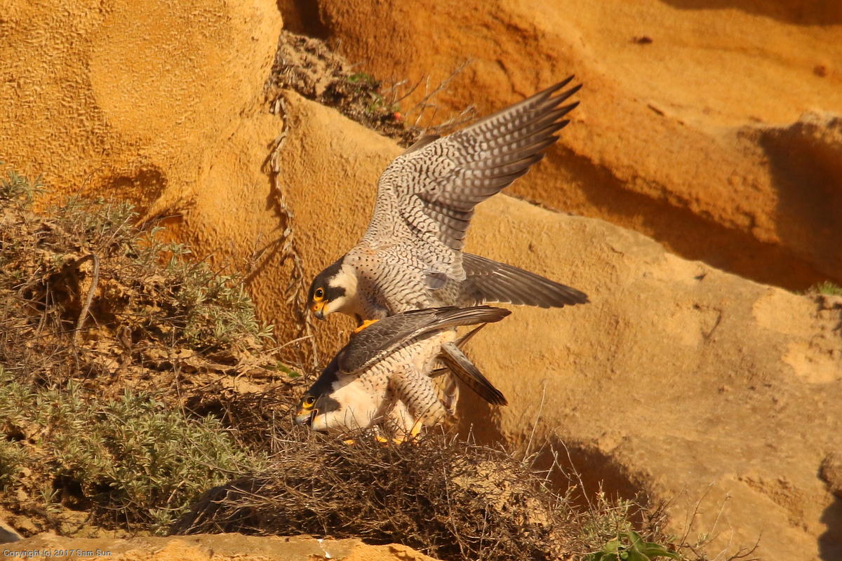 For a while, it seemed like nothing was going to happen again today. After sitting around for an hour, the female flew in the nest cave and called to the male, but he ignored her. They finally mated half an hour later, after which the male retrieved a pigeon and refused to share it.