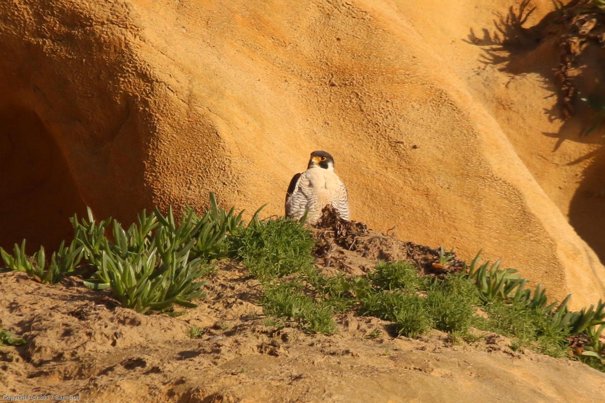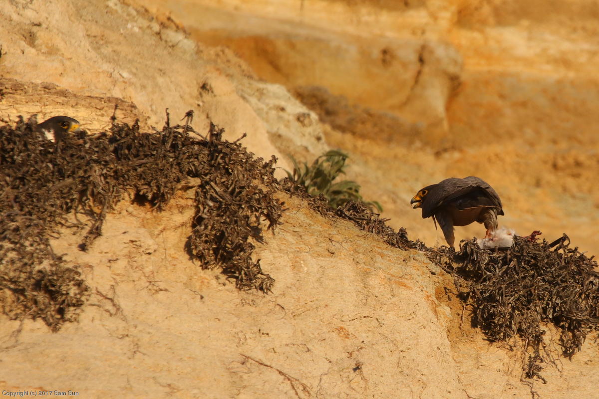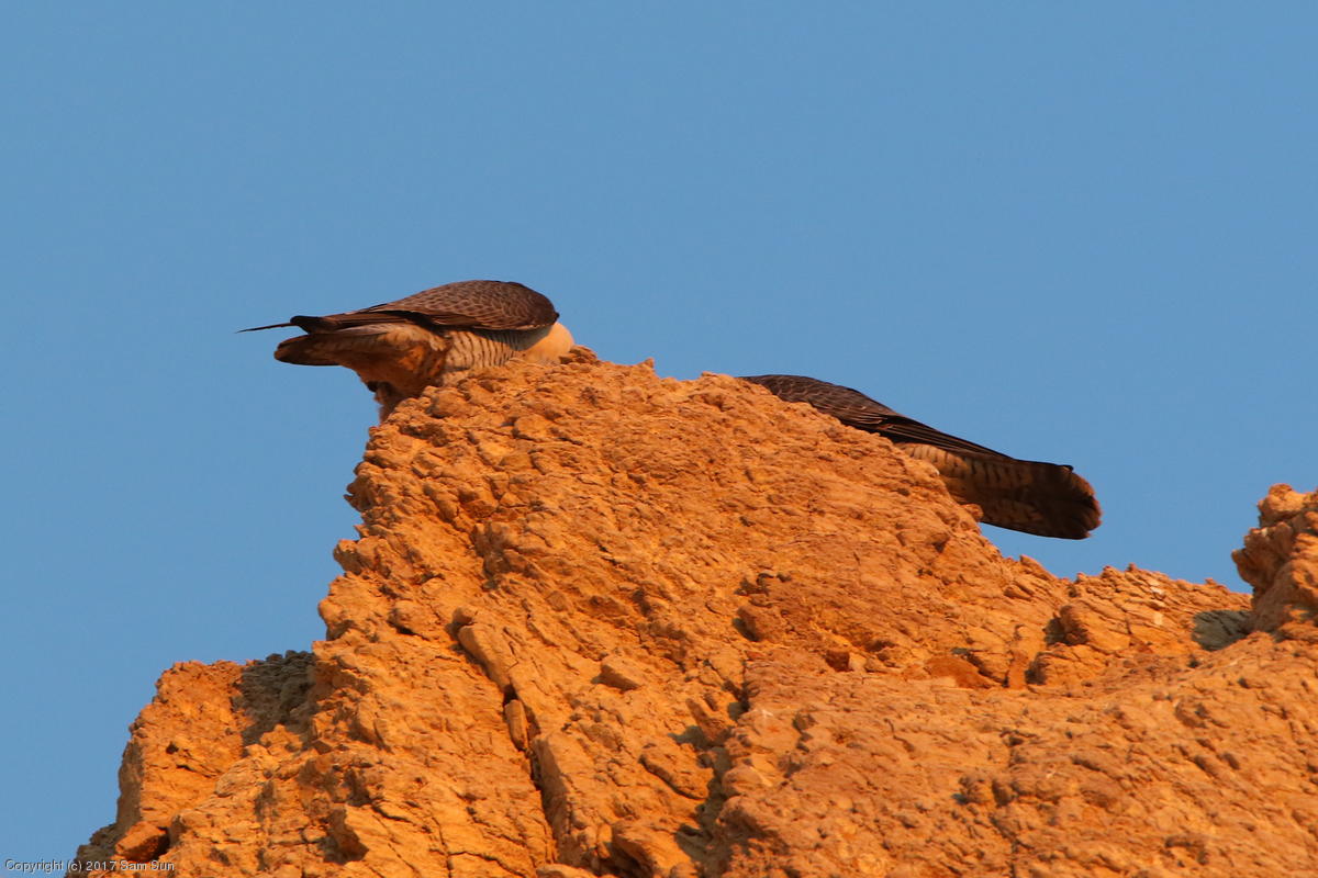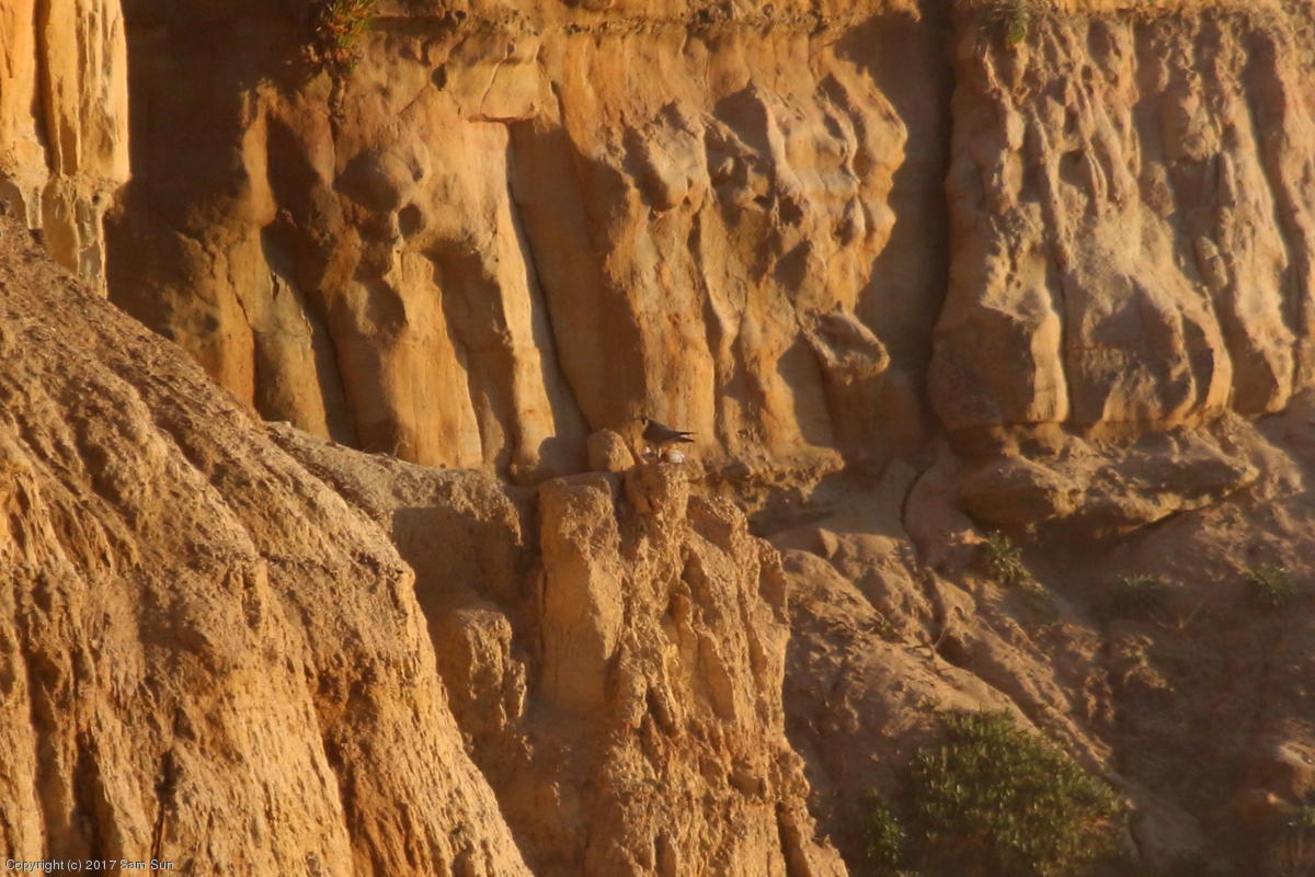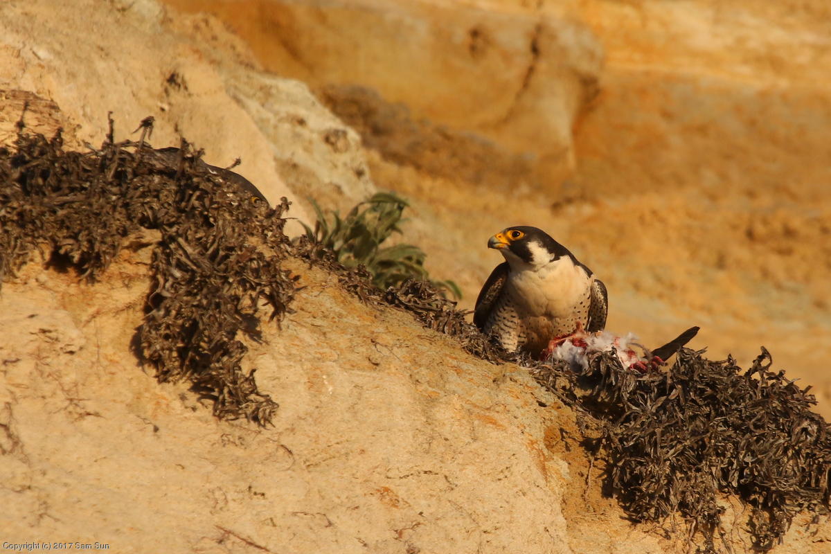 For a while, it seemed like nothing was going to happen again today. After sitting around for an hour, the female flew in the nest cave and called to the male, but he ignored her. They finally mated half an hour later, after which the male retrieved a pigeon and refused to share it.