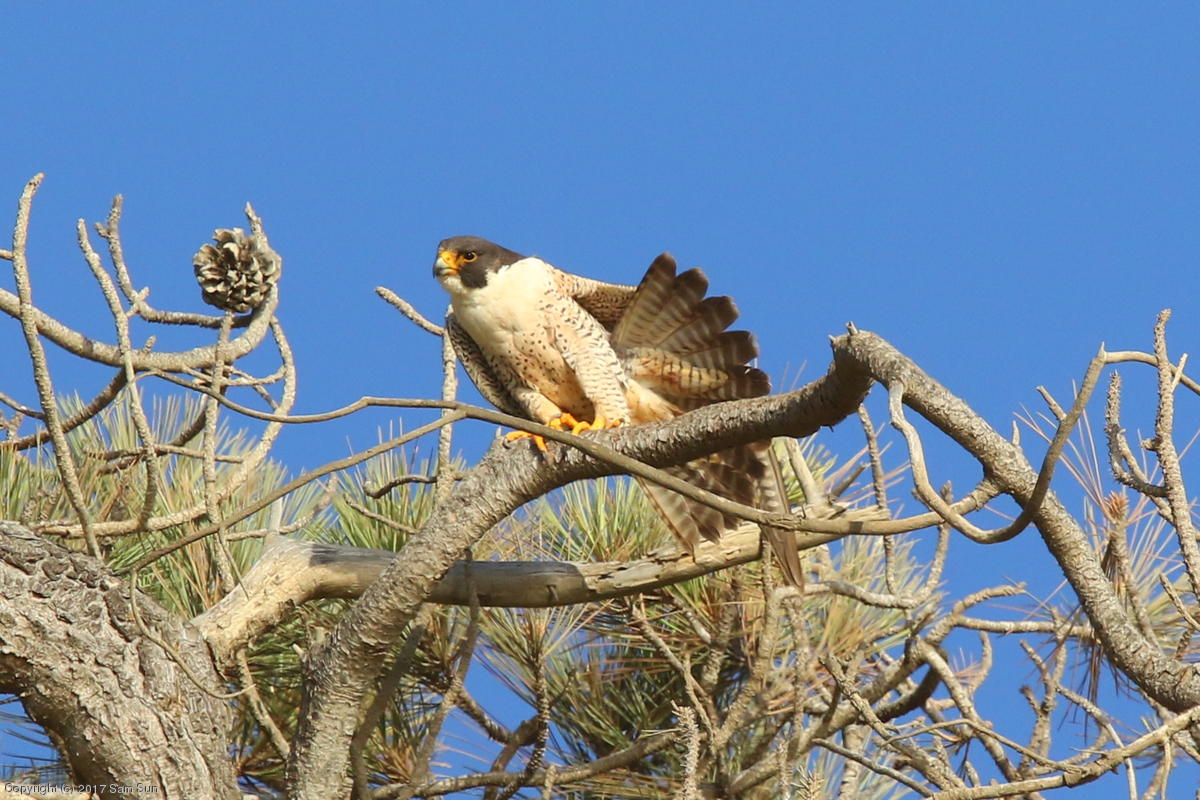 A nice afternoon. The male came in with food just as I was arriving. He brought in another kill later on and took it south to pluck/eat. Eventually the female went to fetch it and got an aerial food exchange.