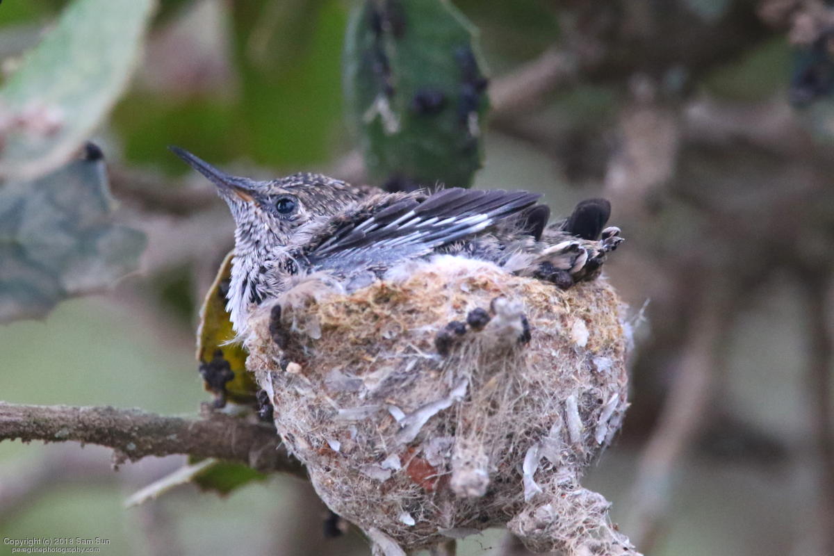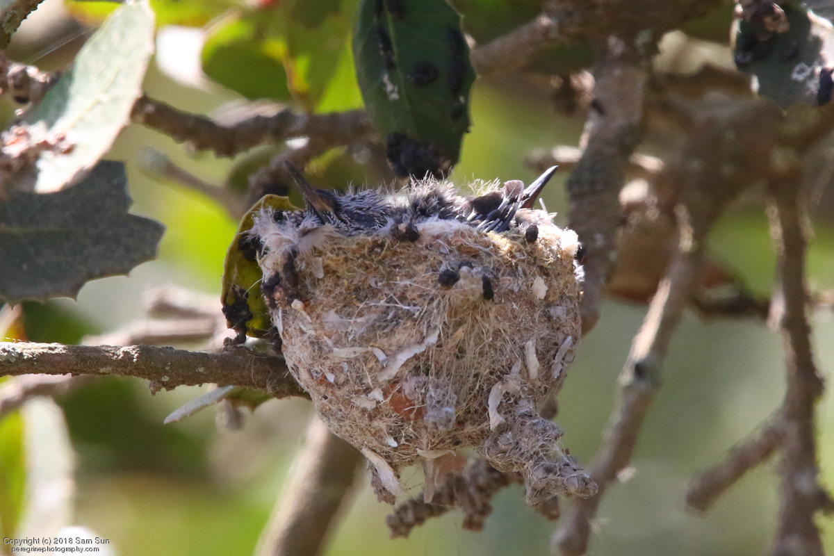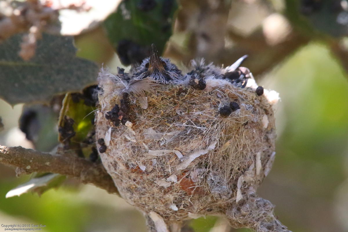 Not a lot of activity this morning - a botched food exchange and a juvenile taking a bath. A hummingbird nest with chicks was a good diversion while waiting.