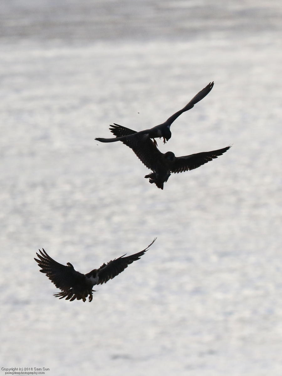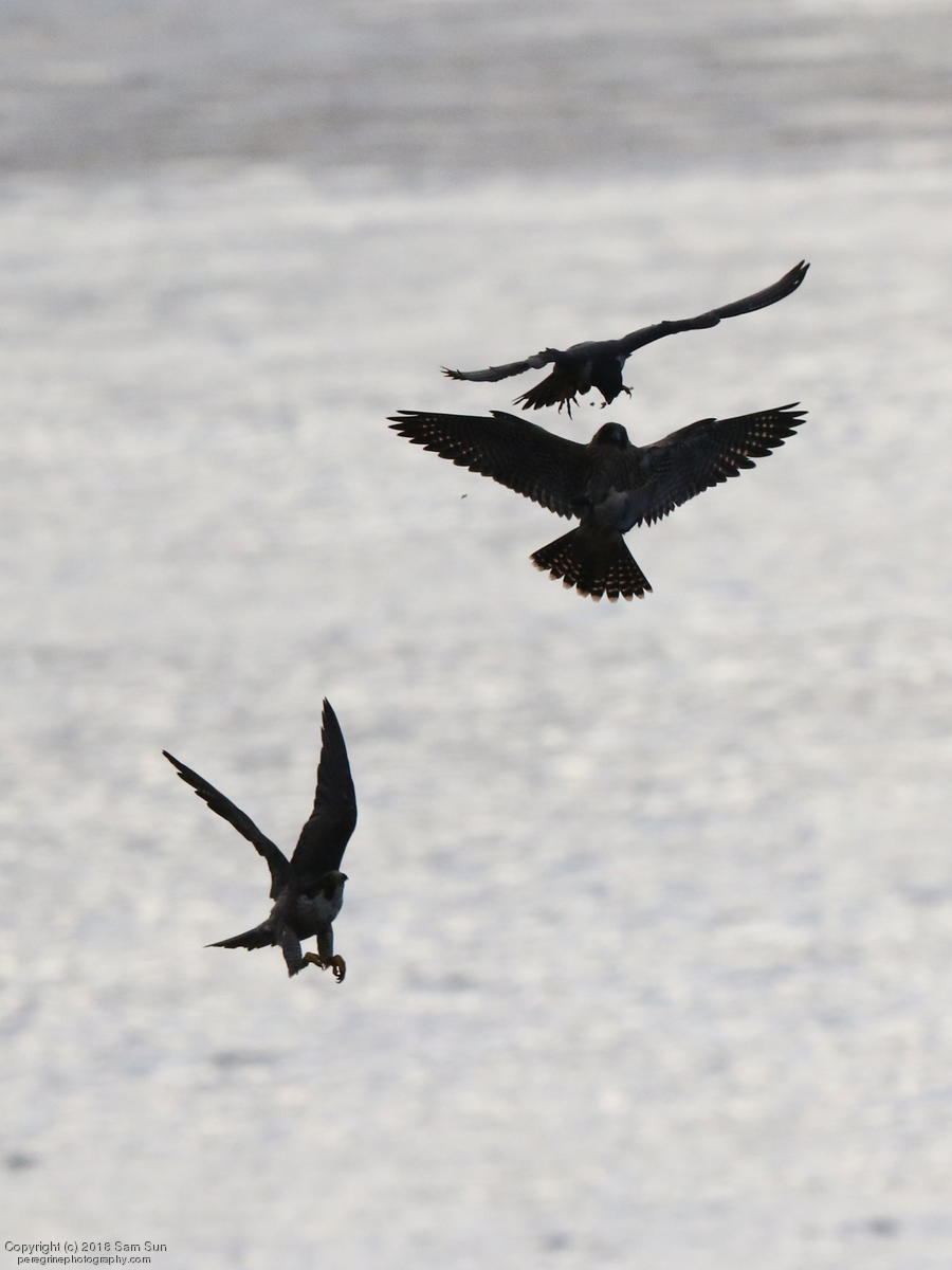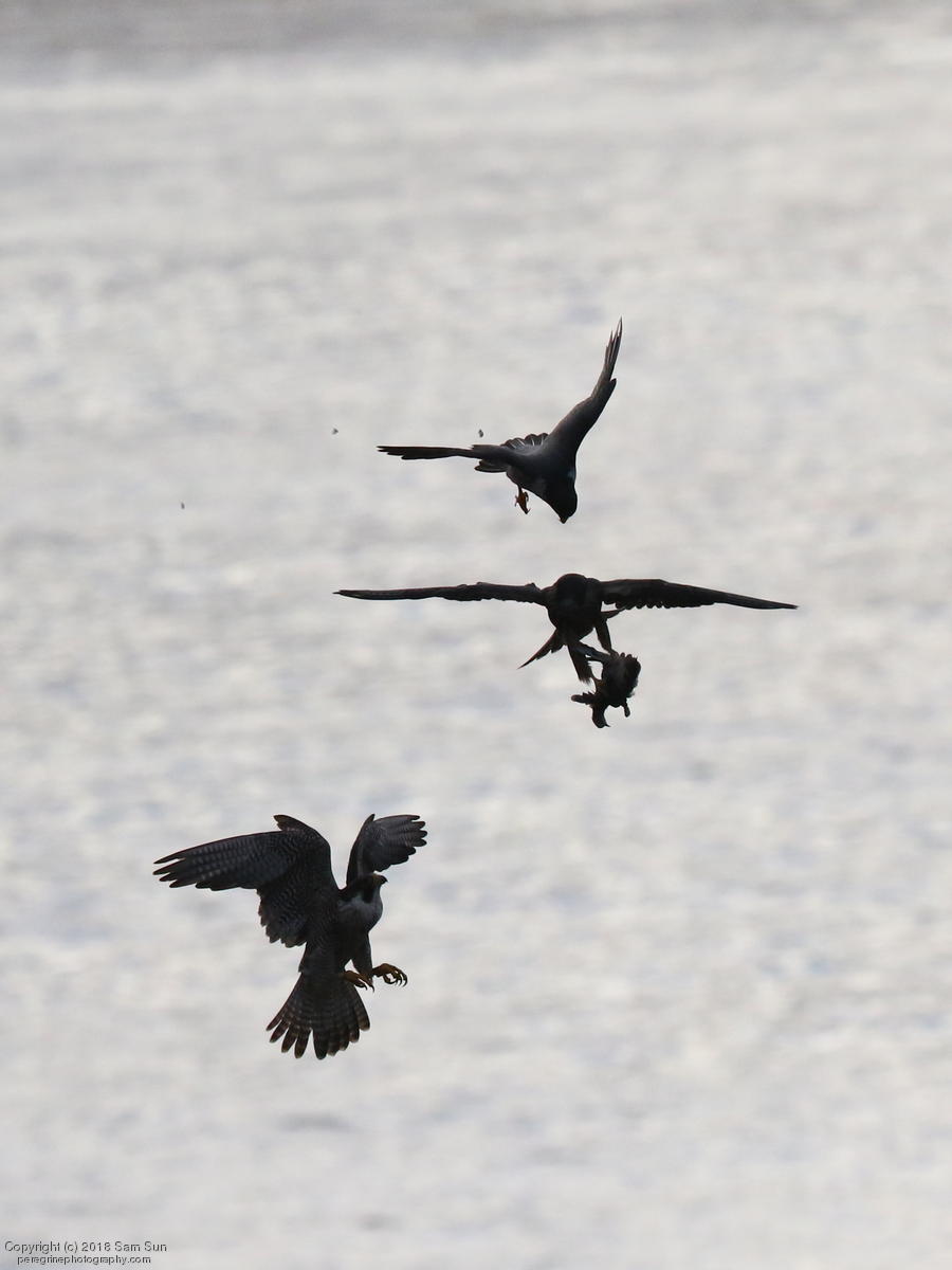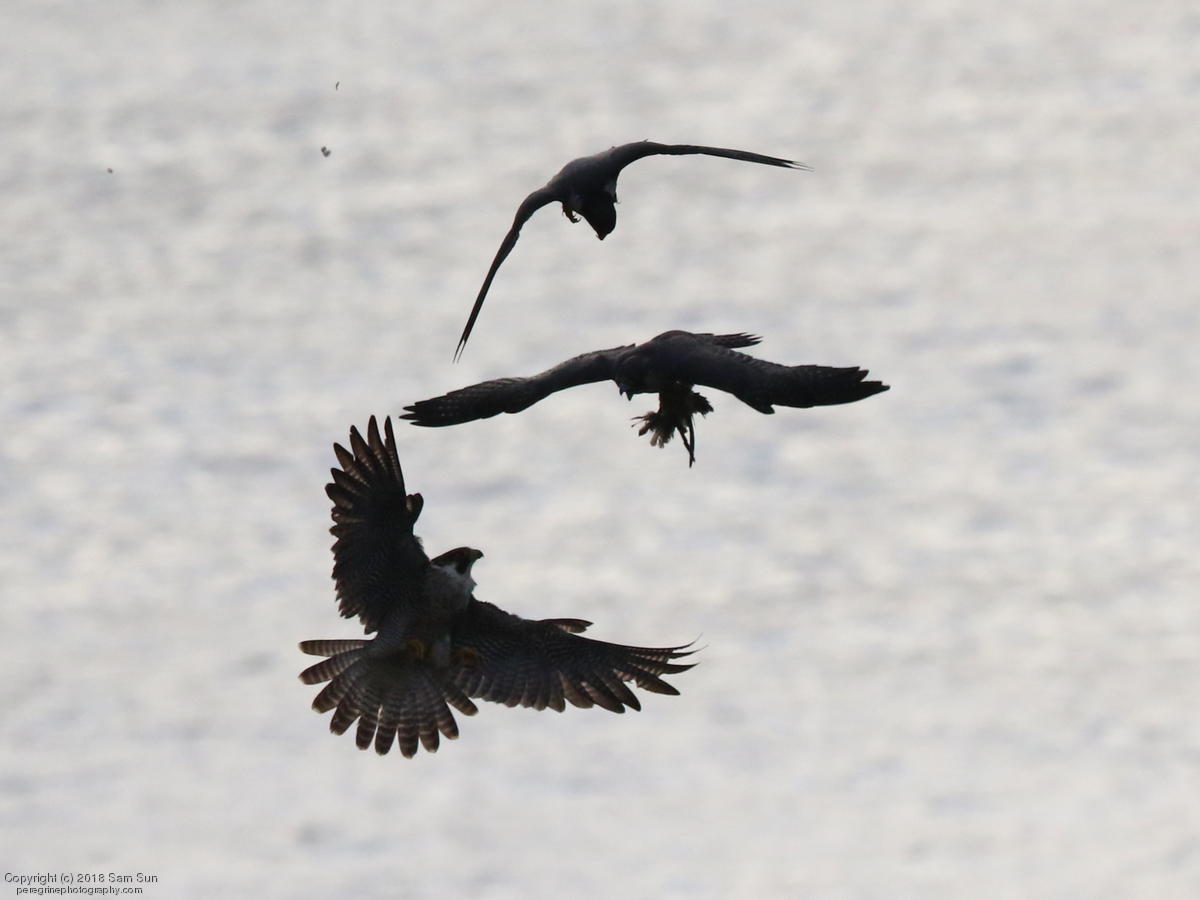 The juveniles flew a little, but no dogfighting. A juvenile took a food transfer, then got chased around a little before finding a quiet place to eat.