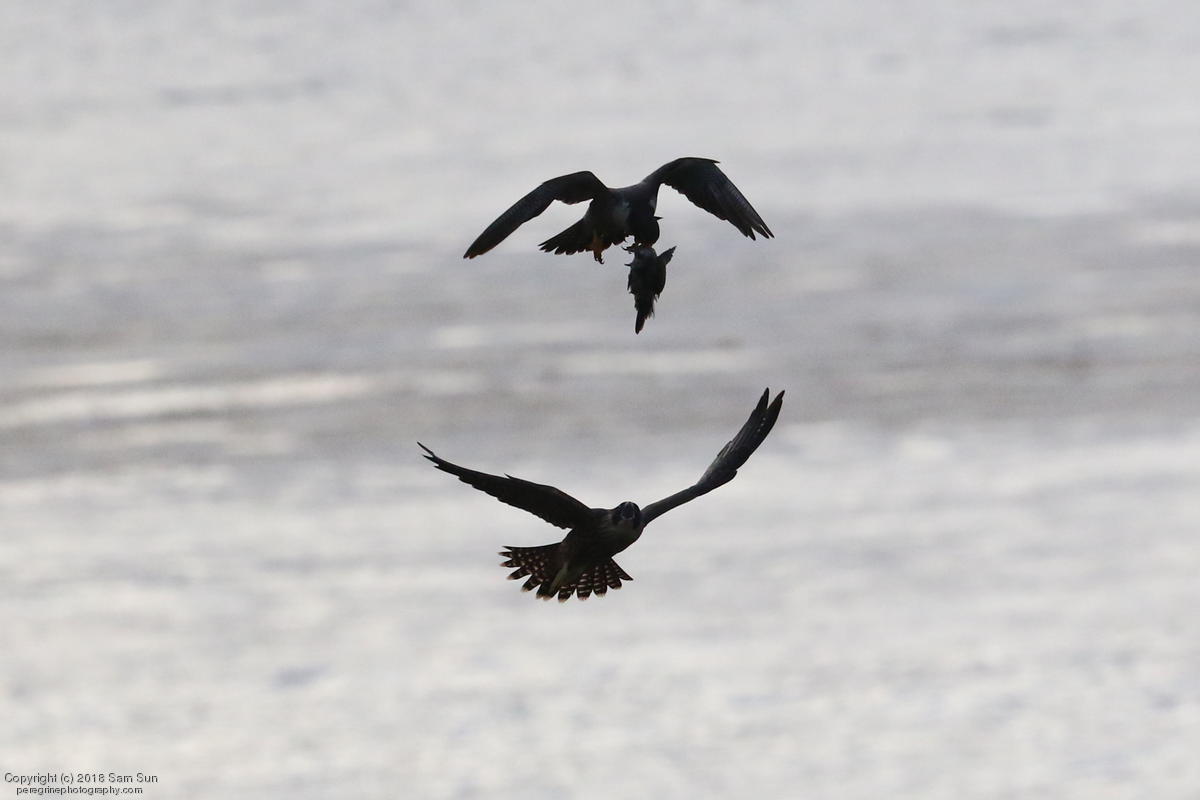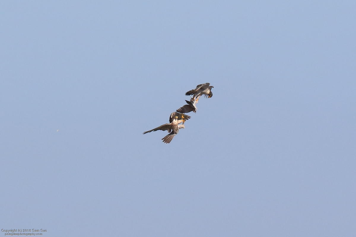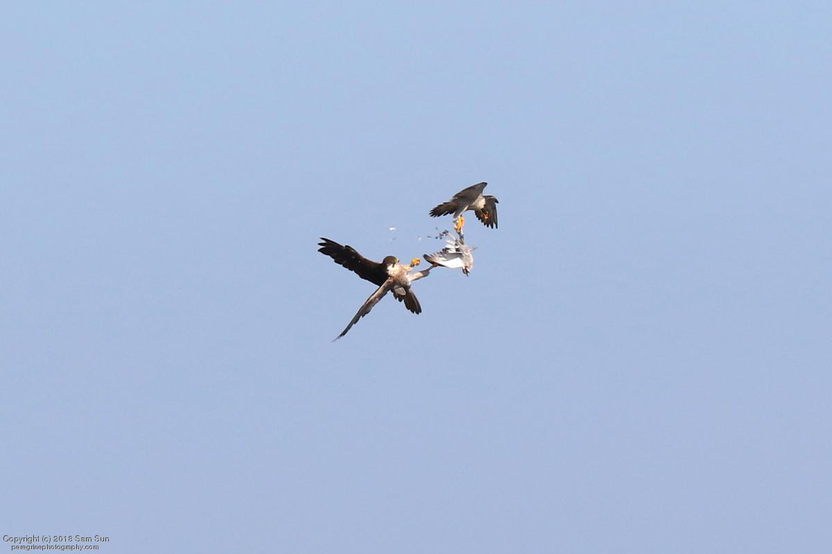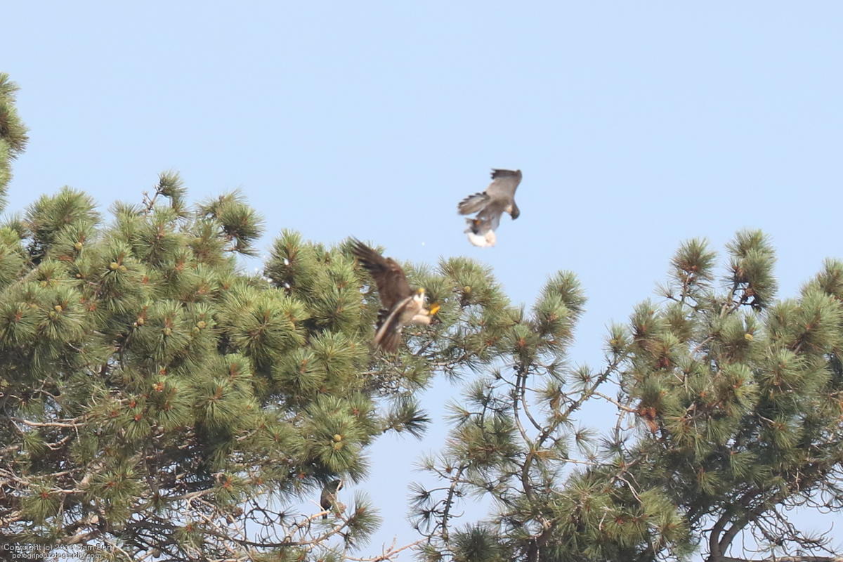 The juveniles flew a little, but no dogfighting. A juvenile took a food transfer, then got chased around a little before finding a quiet place to eat.