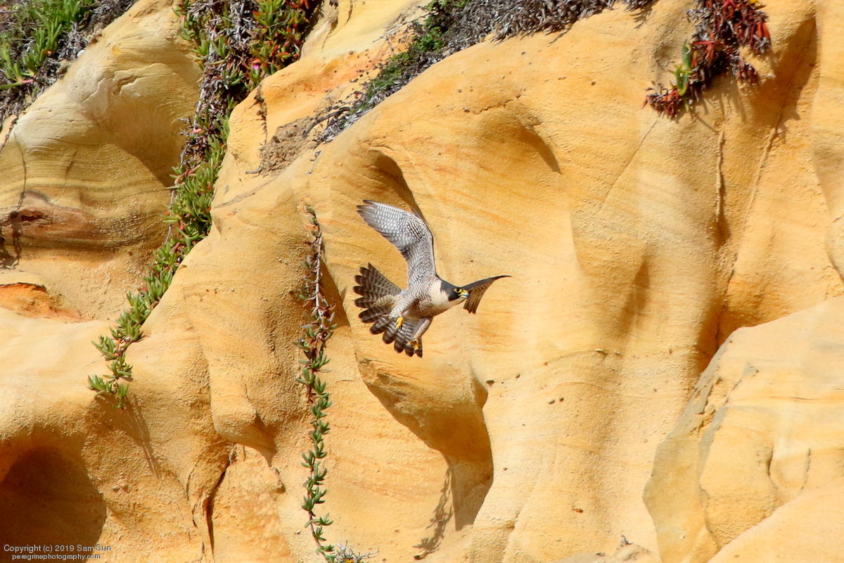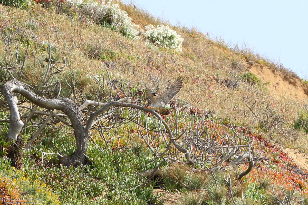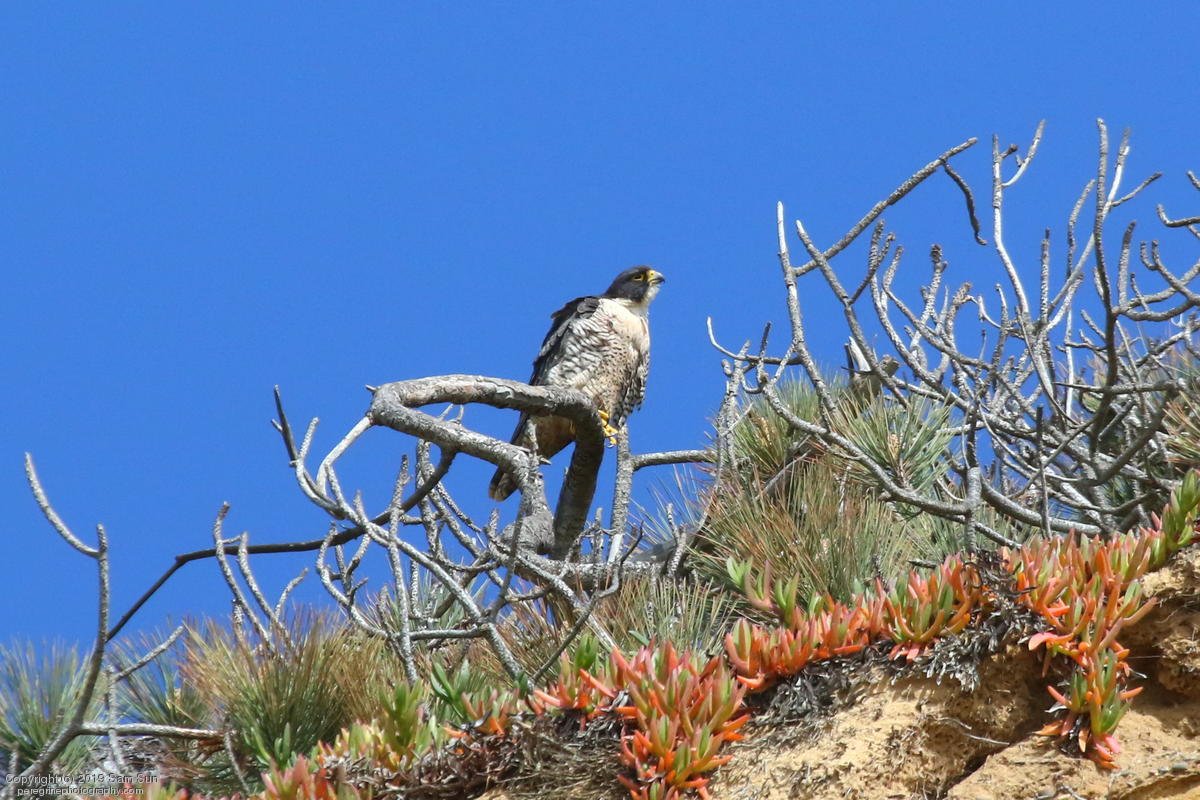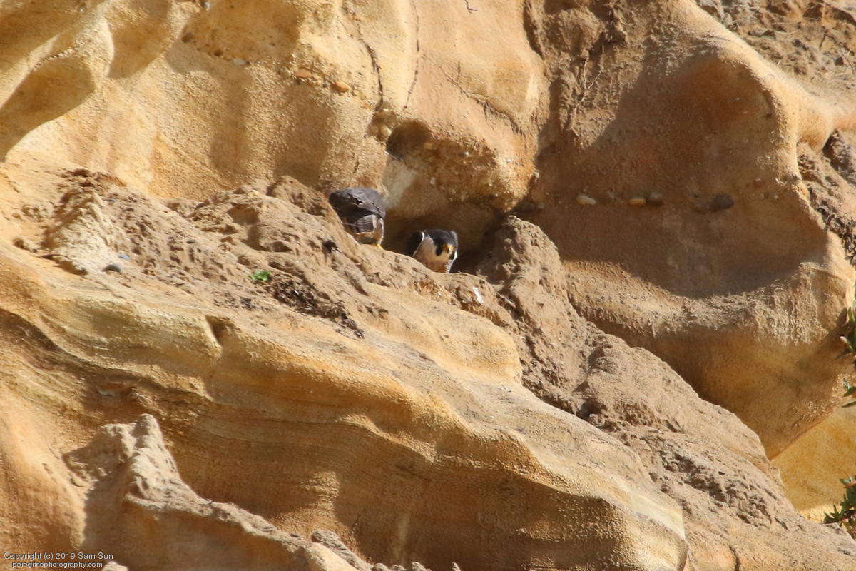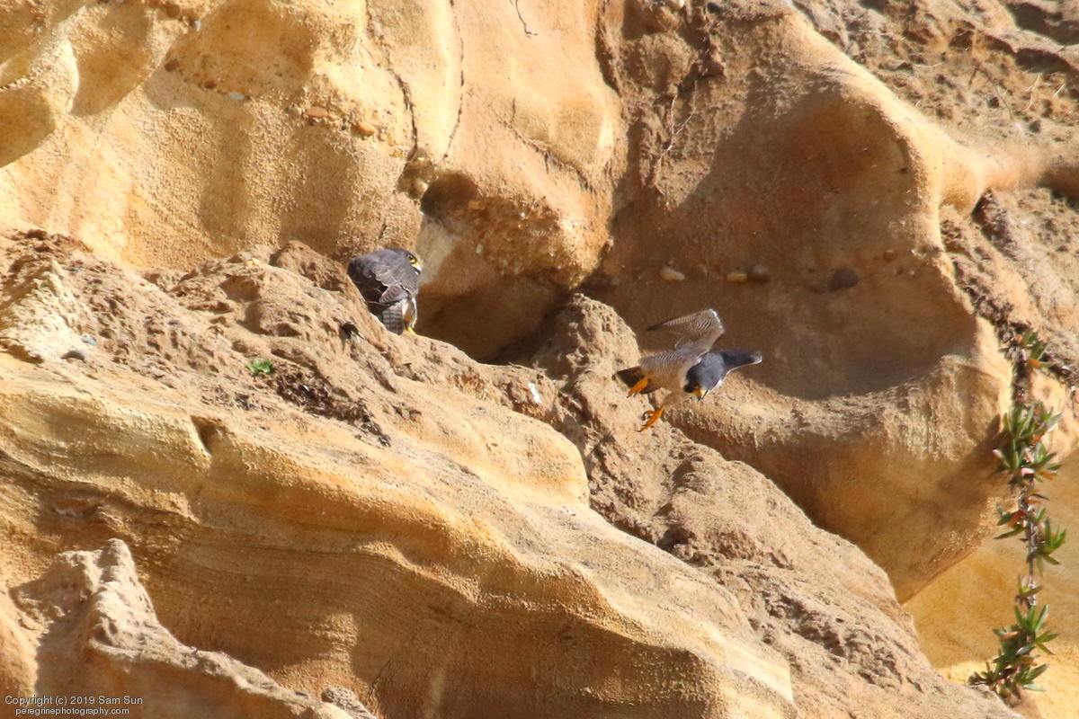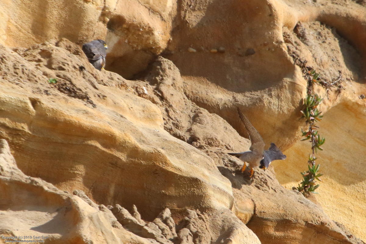 It looks like 16AC has a new, unbanded mate. It also looks like the nest site may have moved further down the beach, as they repeatedly visited a particular ledge. A third falcon showed up and there was much chasing around.