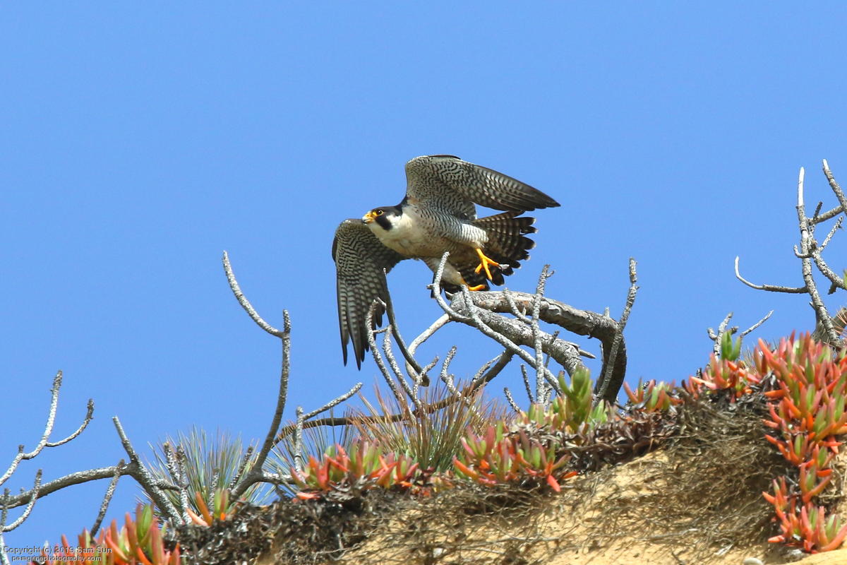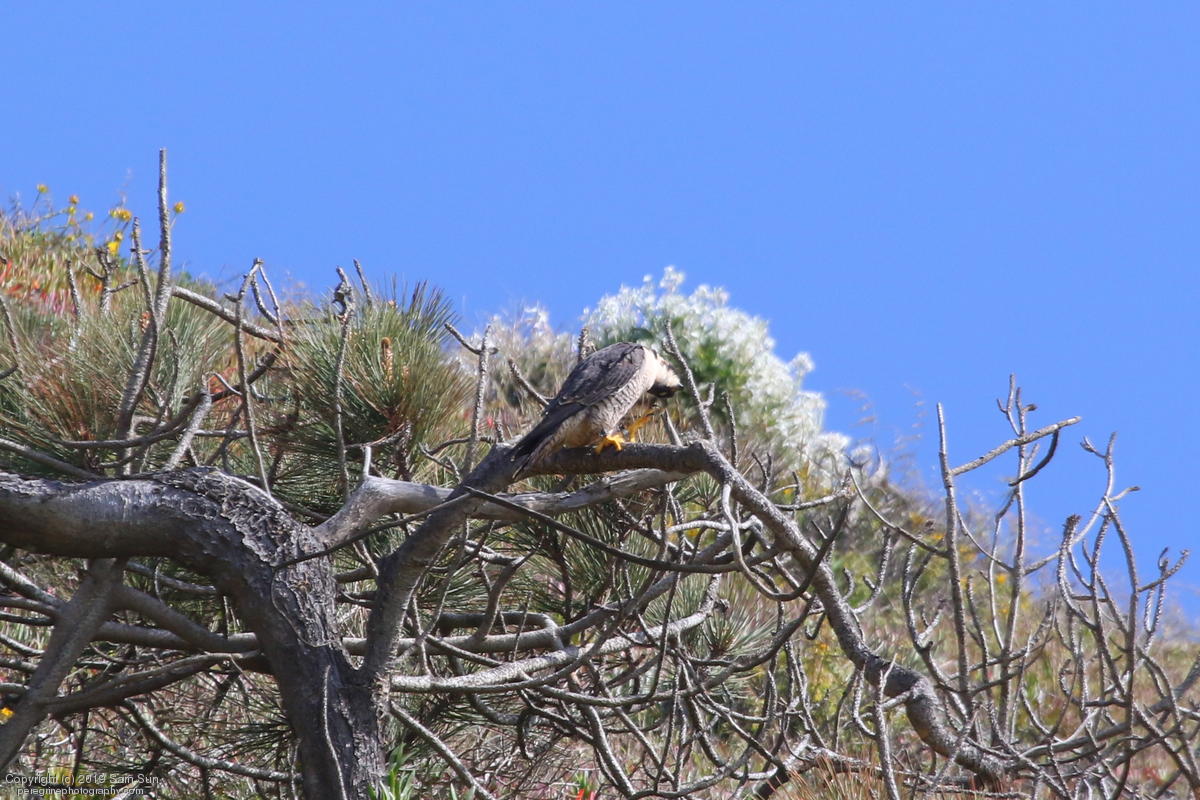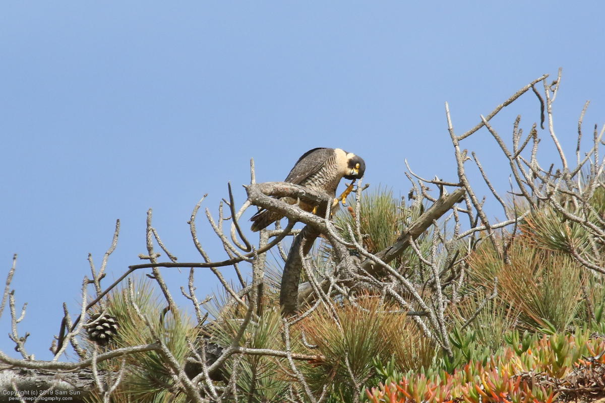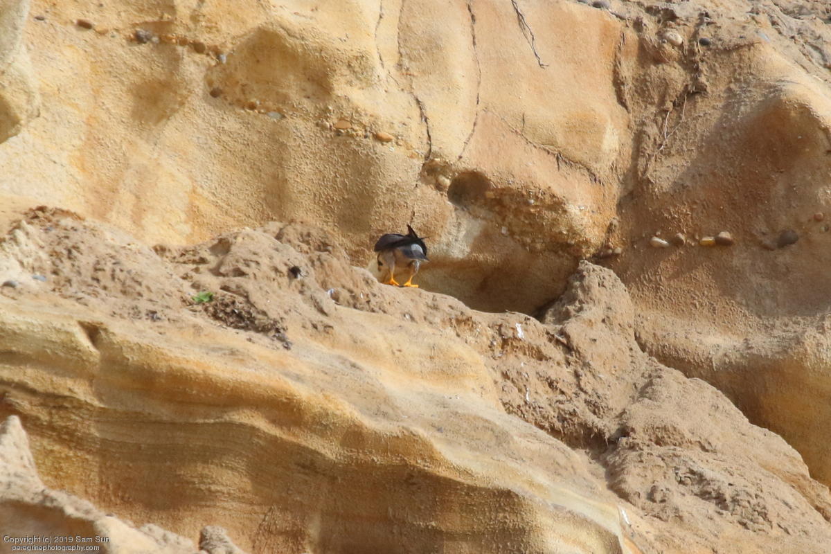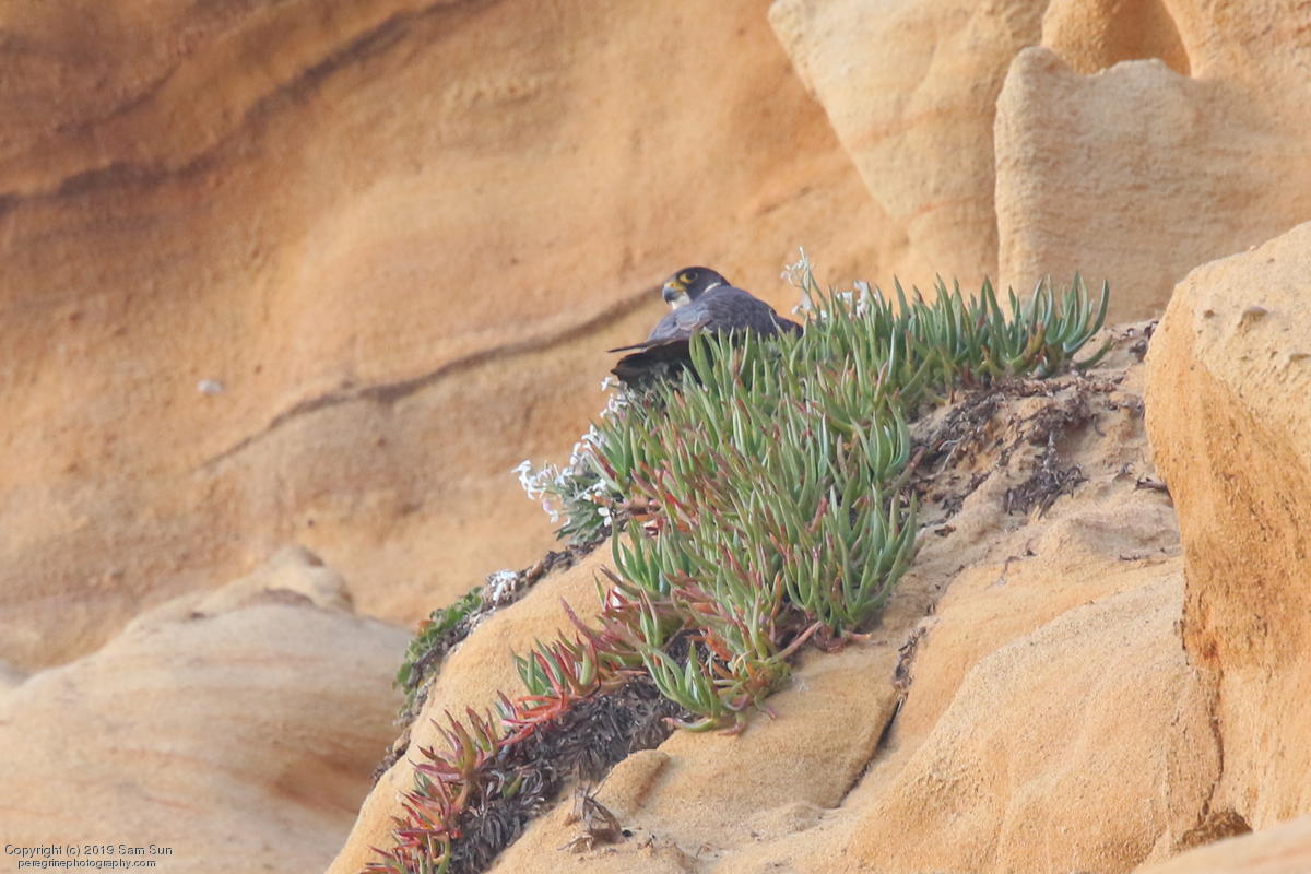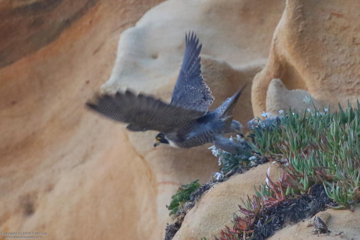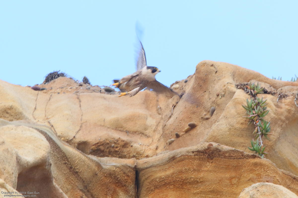 It looks like 16AC has a new, unbanded mate. It also looks like the nest site may have moved further down the beach, as they repeatedly visited a particular ledge. A third falcon showed up and there was much chasing around.