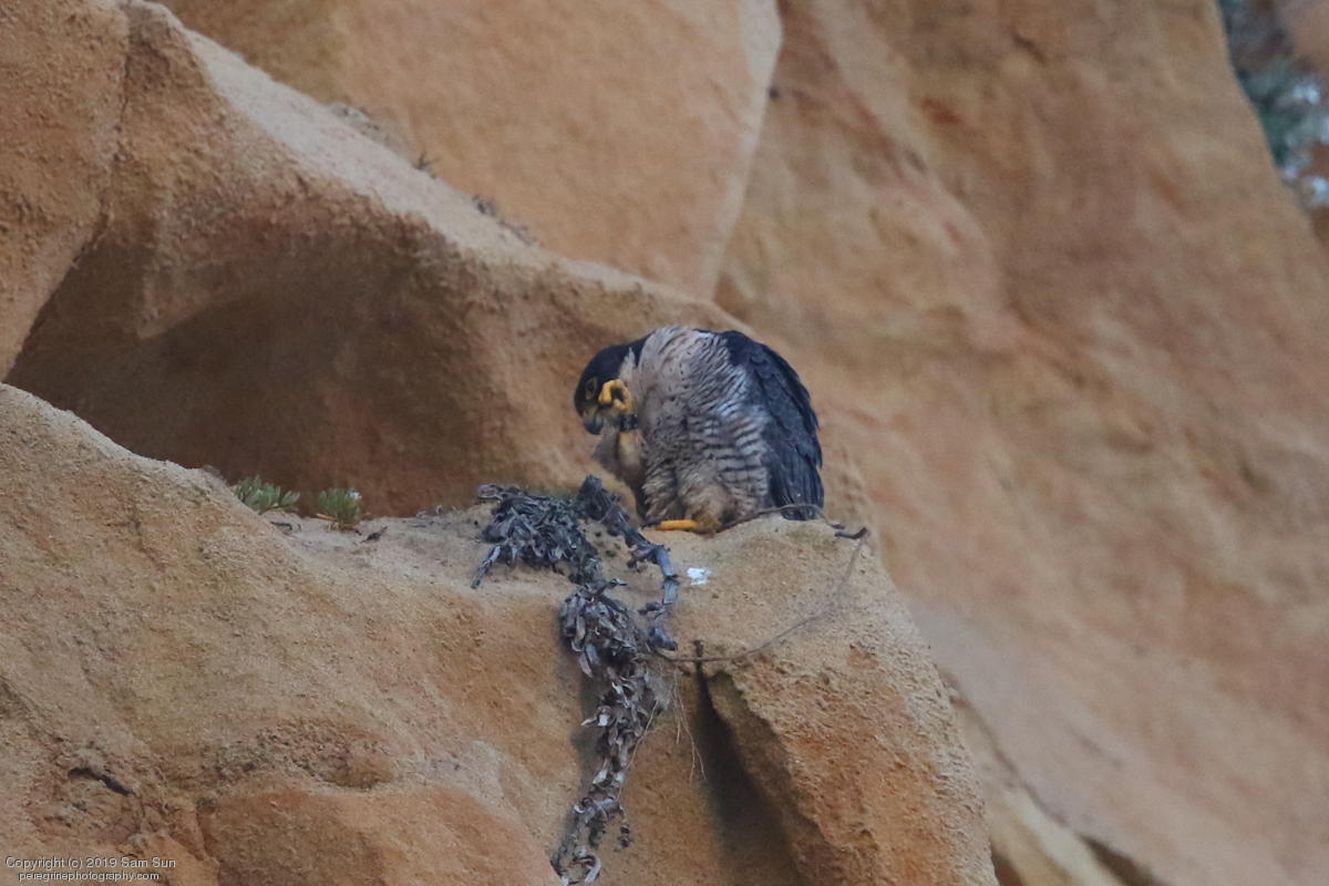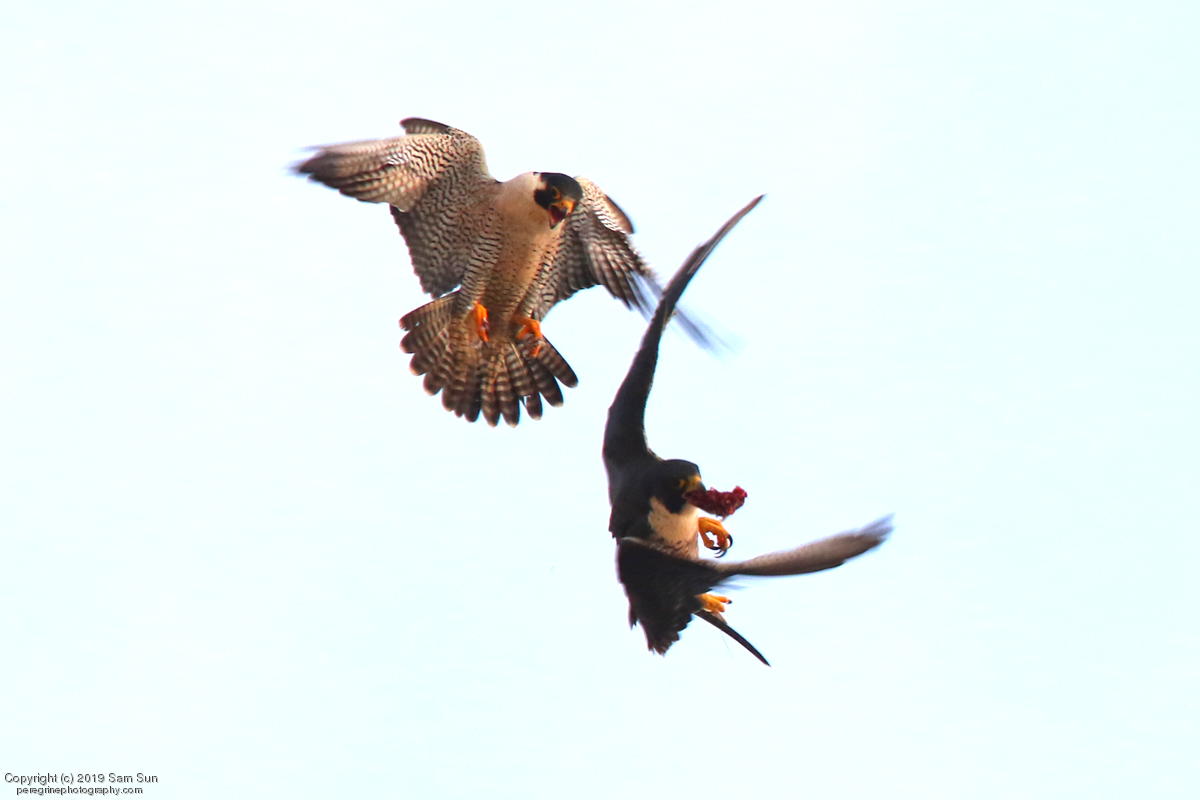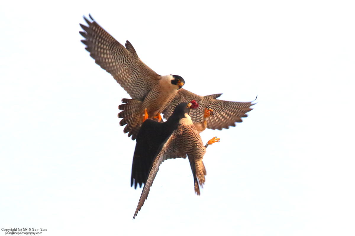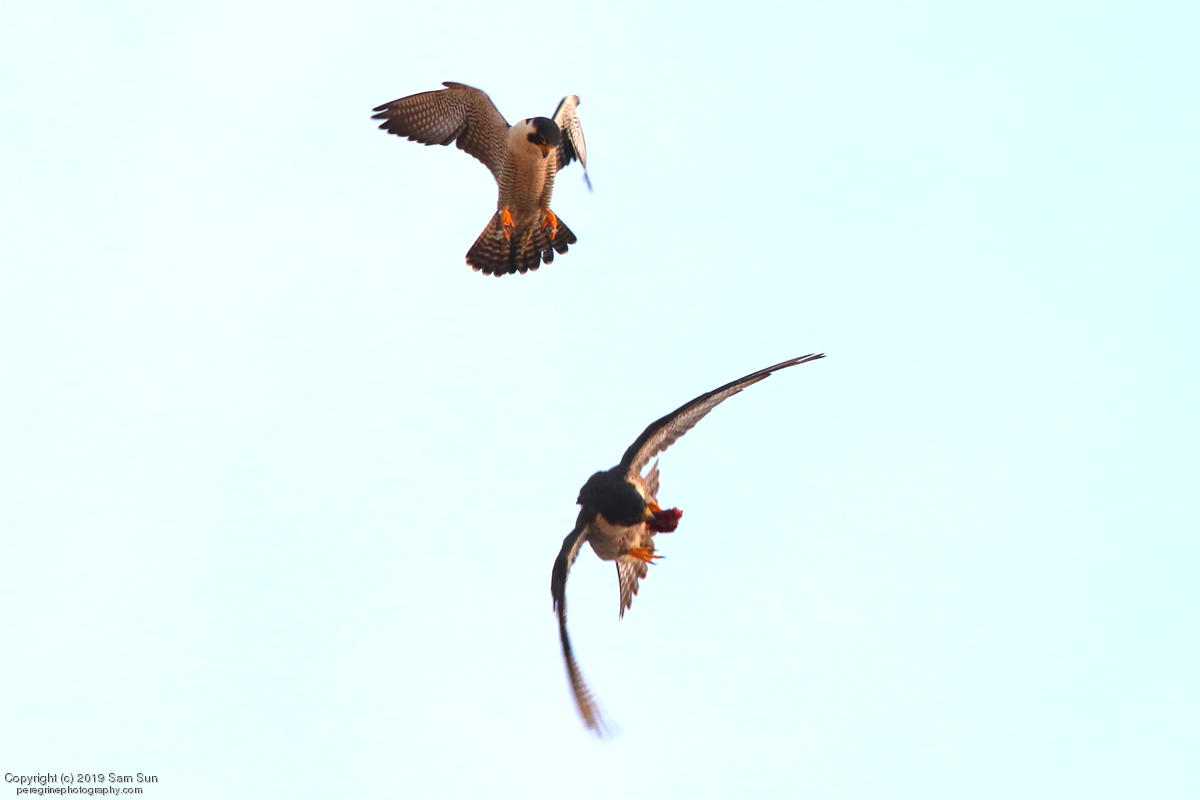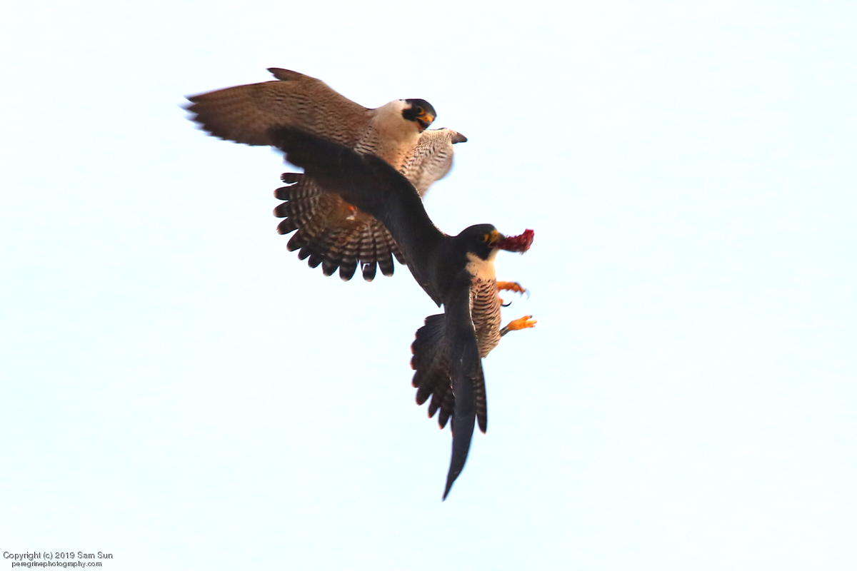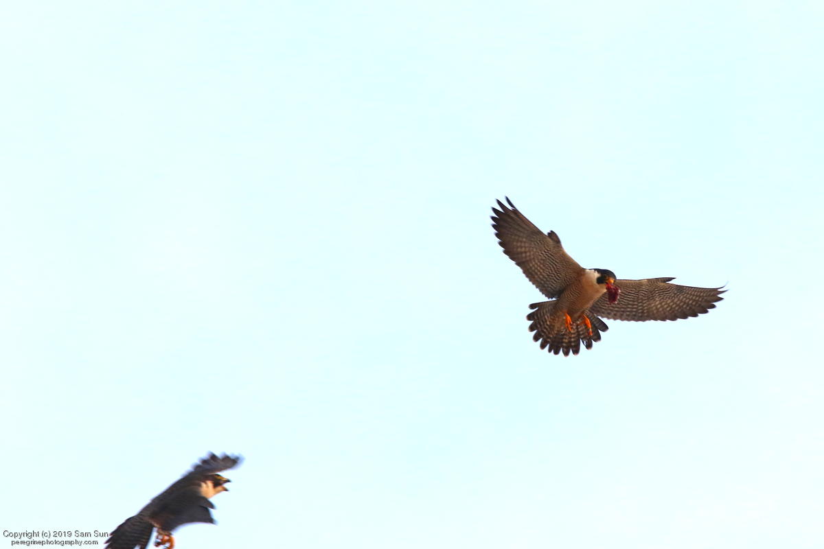 It was a long wait this afternoon. Both adults flew briefly as I arrived. It looked like the female disappeared into the new suspected nest ledge, so I staked it out. Three hours later, the male came by with food and they did an exchange right overhead! Unfortunately, my autofocus decided to lose the handoff shot.