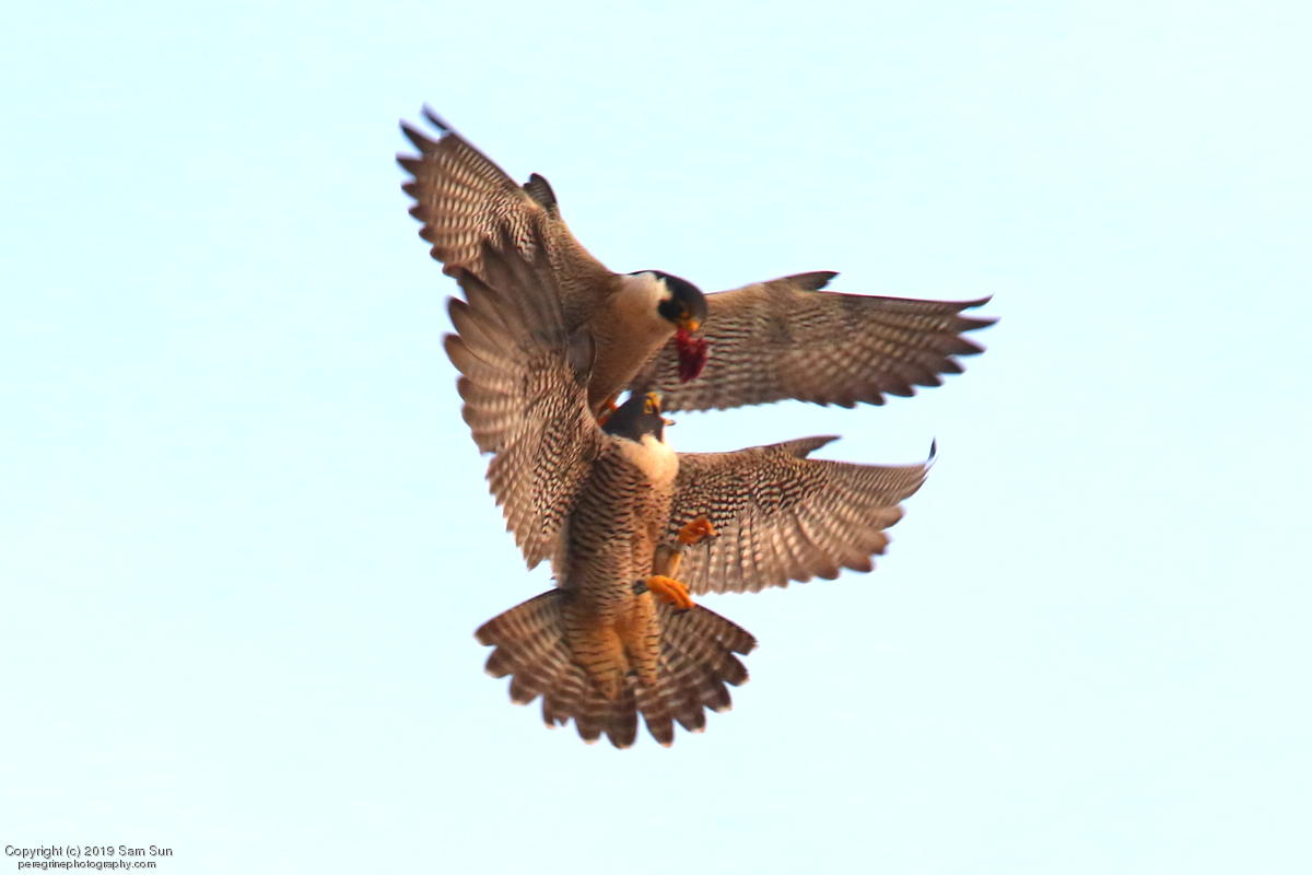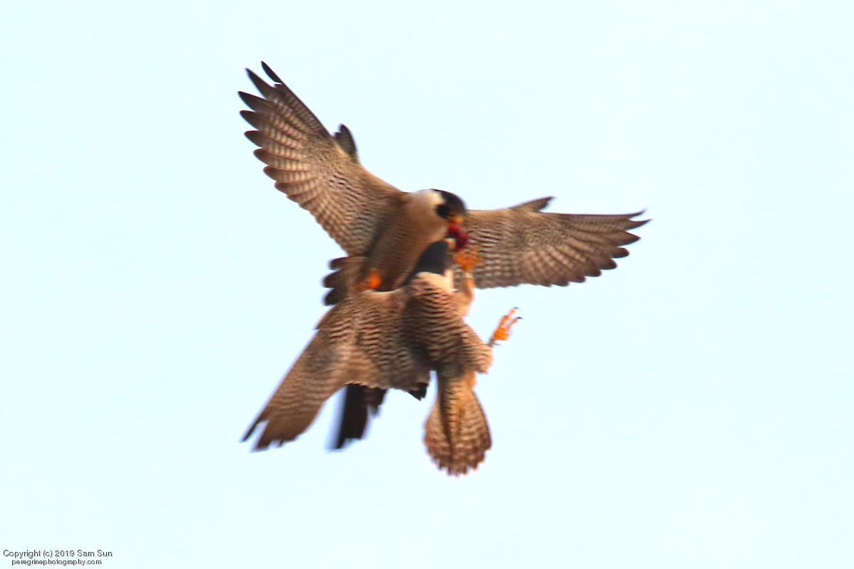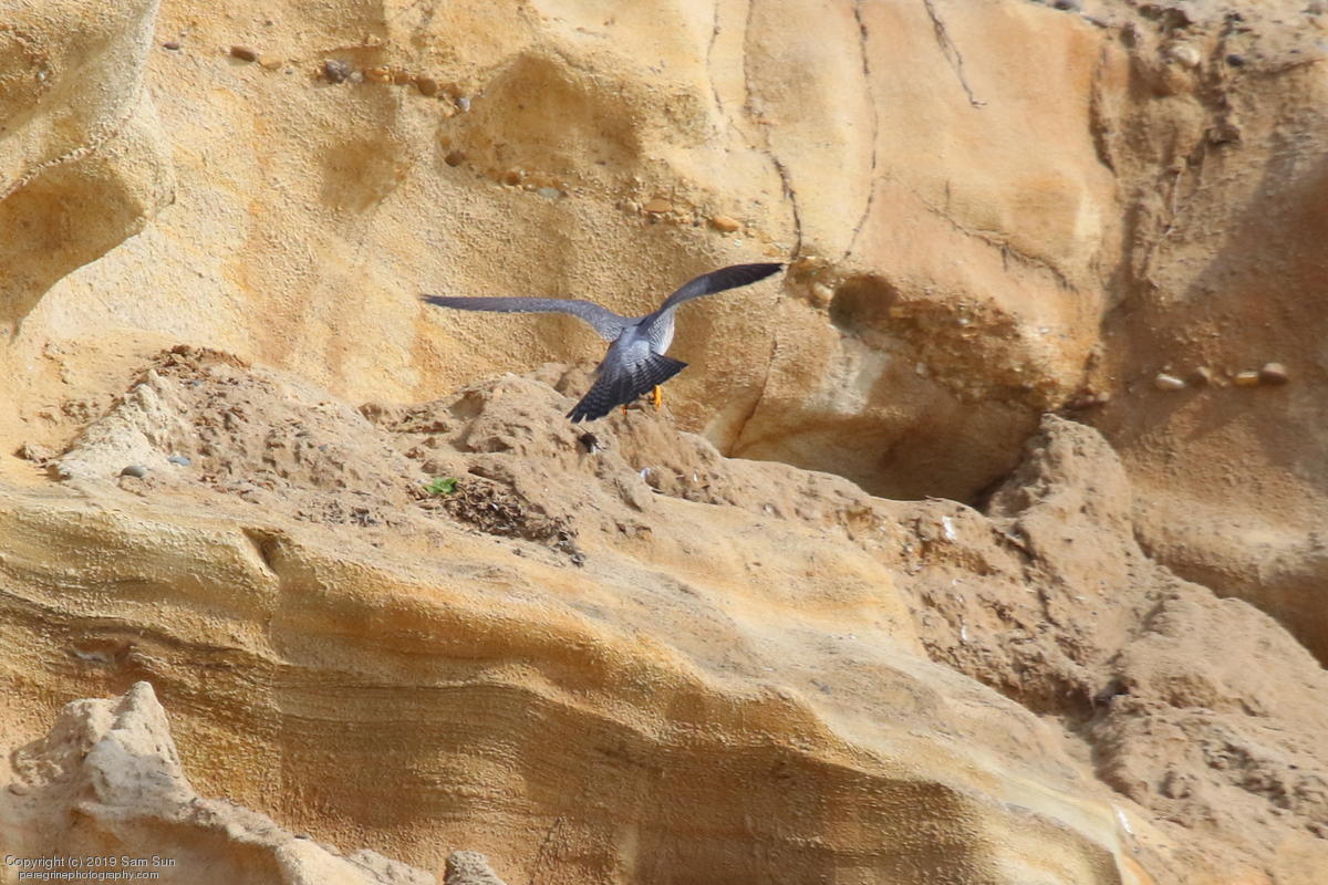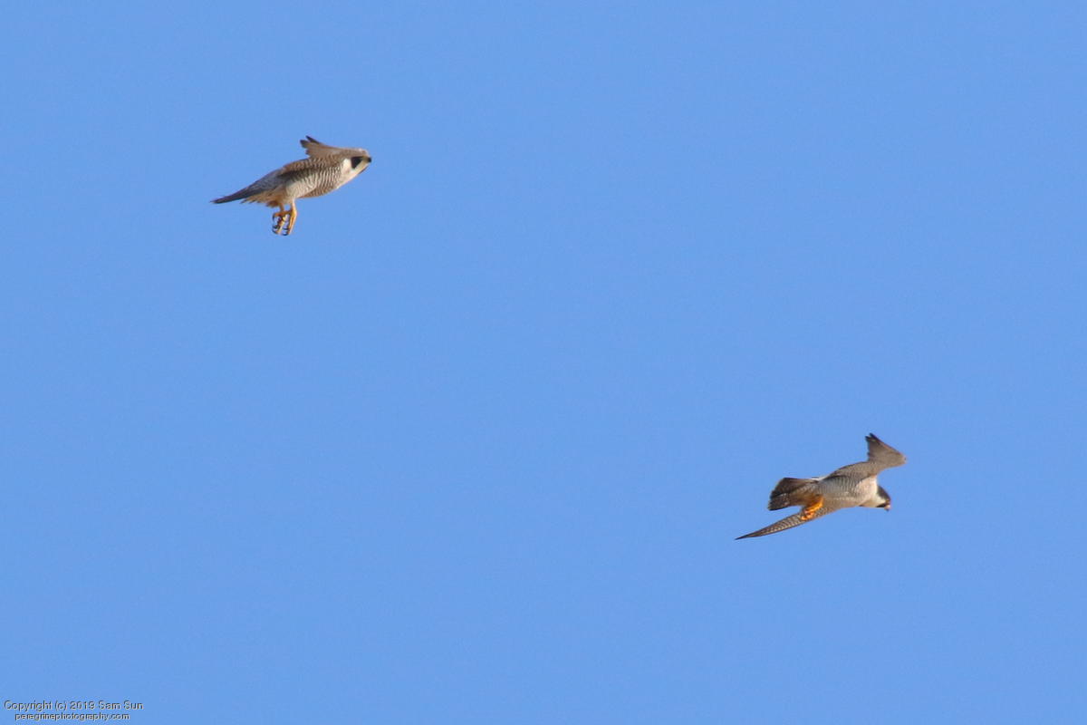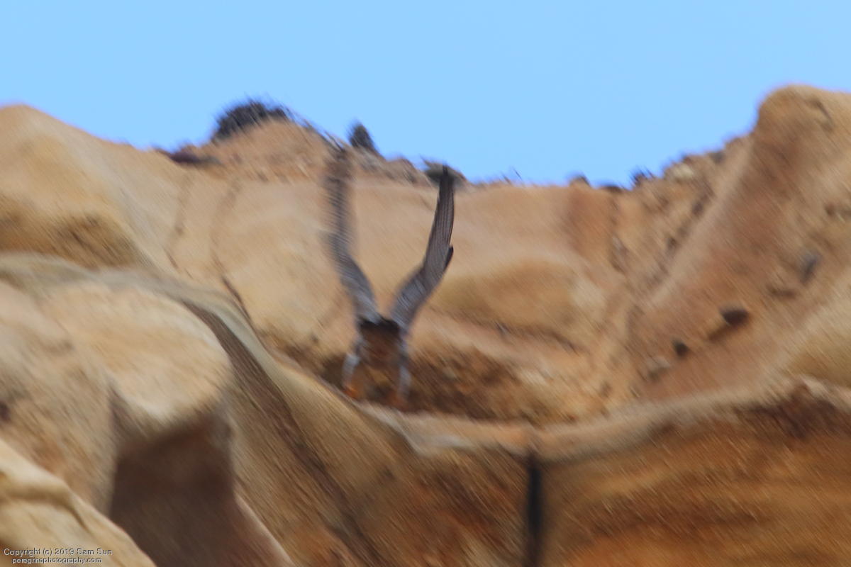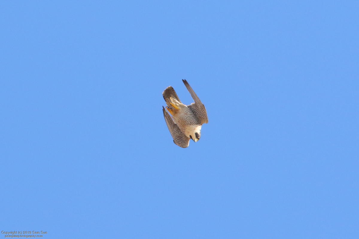 It was a long wait this afternoon. Both adults flew briefly as I arrived. It looked like the female disappeared into the new suspected nest ledge, so I staked it out. Three hours later, the male came by with food and they did an exchange right overhead! Unfortunately, my autofocus decided to lose the handoff shot.
