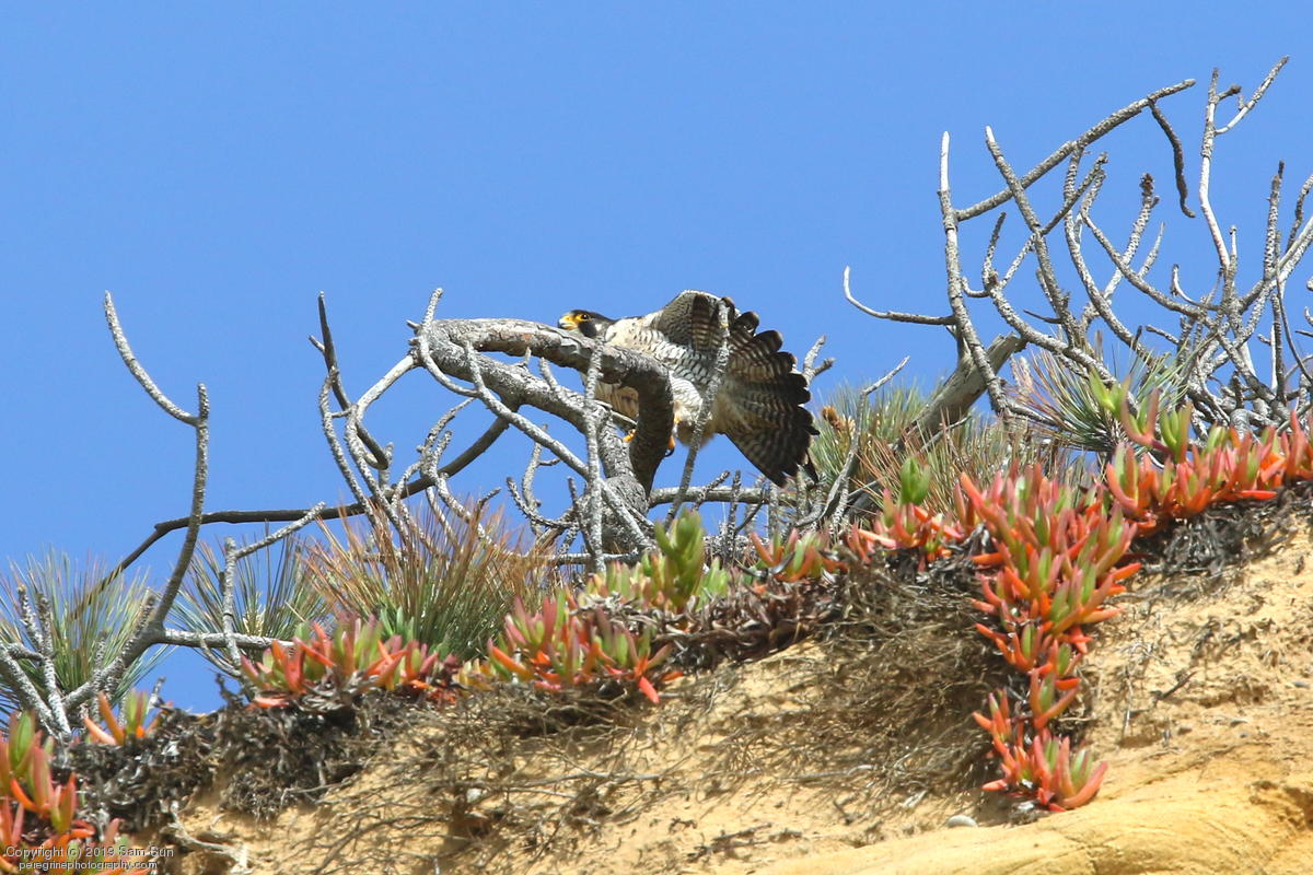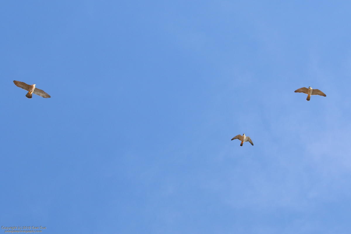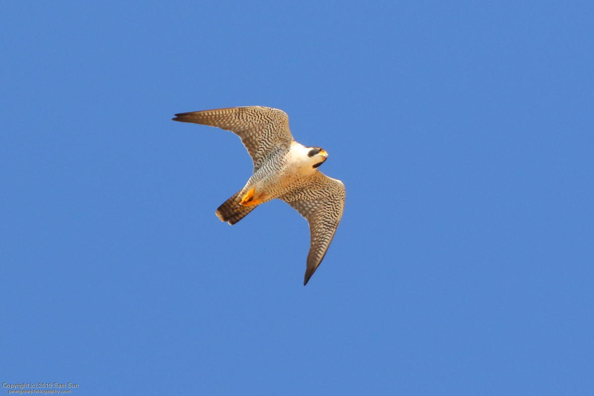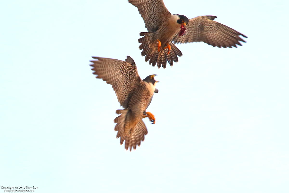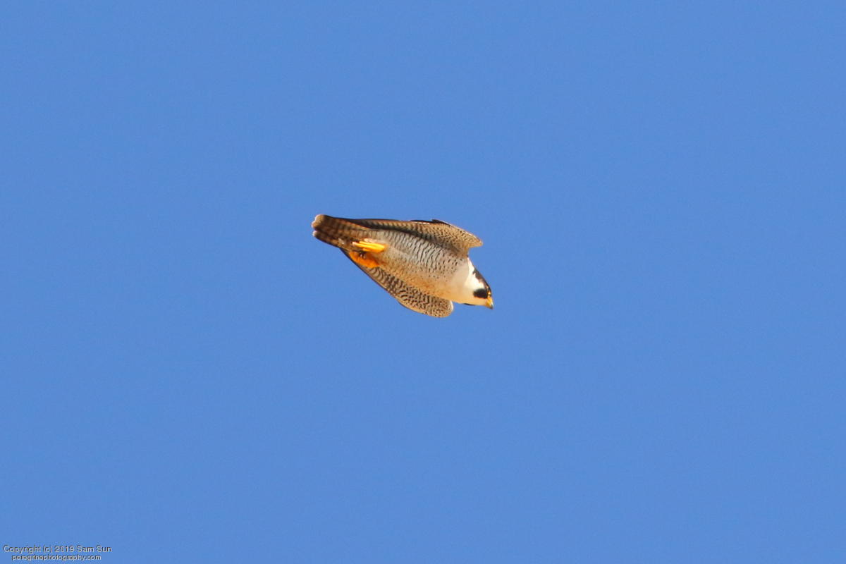 It was a long wait this afternoon. Both adults flew briefly as I arrived. It looked like the female disappeared into the new suspected nest ledge, so I staked it out. Three hours later, the male came by with food and they did an exchange right overhead! Unfortunately, my autofocus decided to lose the handoff shot.