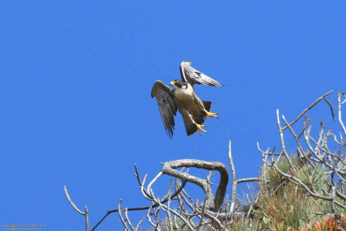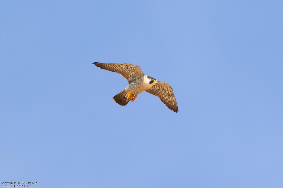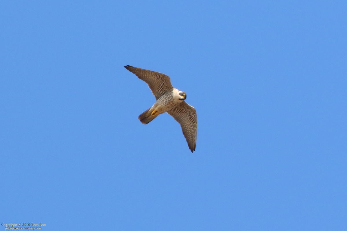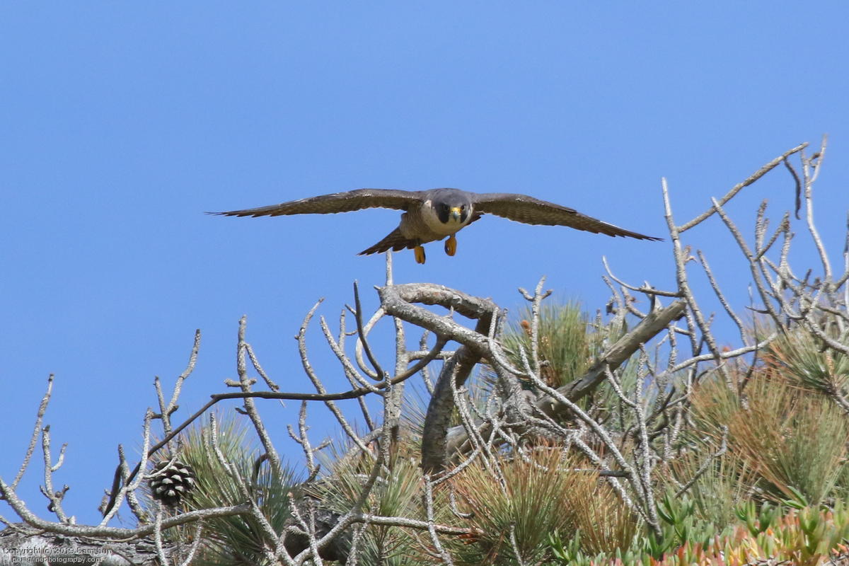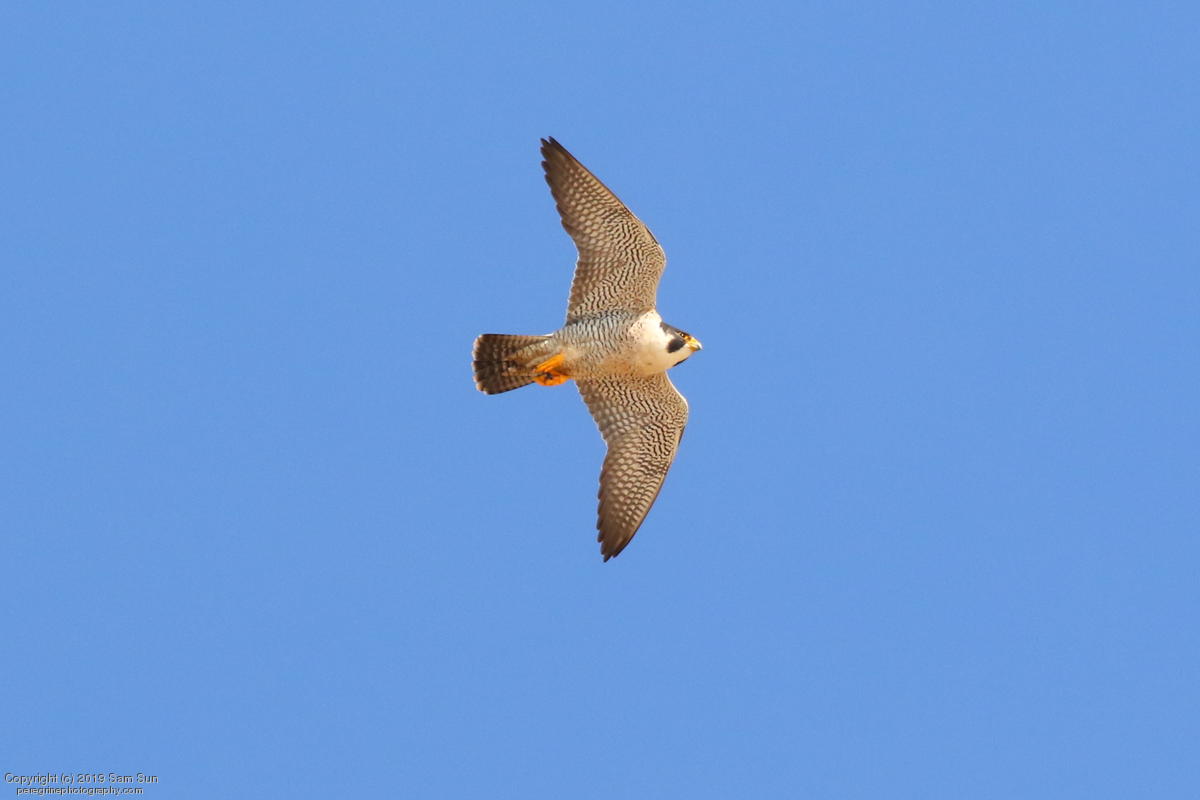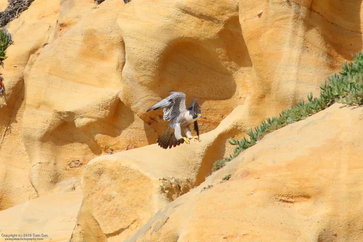 It was a long wait this afternoon. Both adults flew briefly as I arrived. It looked like the female disappeared into the new suspected nest ledge, so I staked it out. Three hours later, the male came by with food and they did an exchange right overhead! Unfortunately, my autofocus decided to lose the handoff shot.