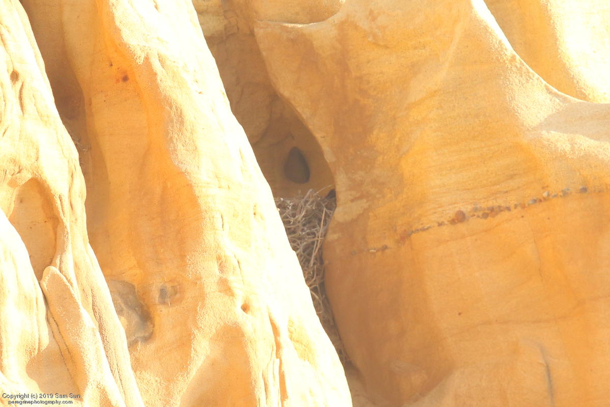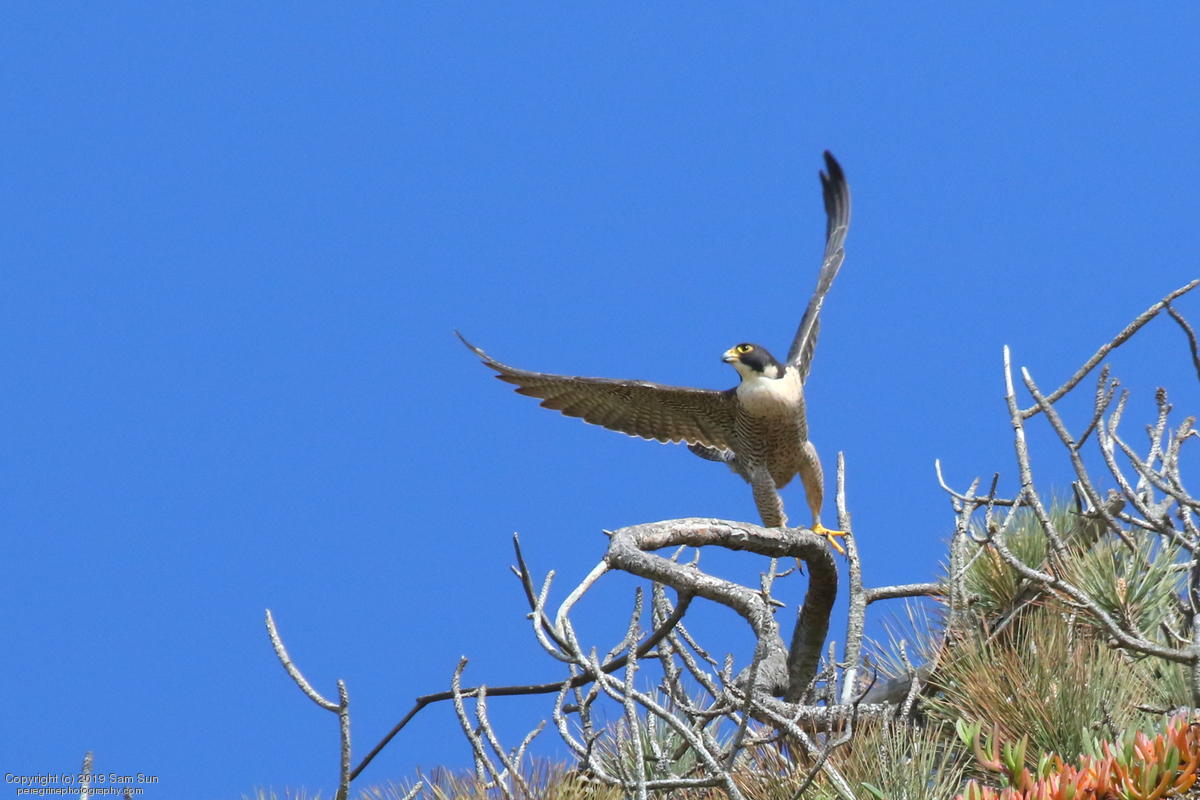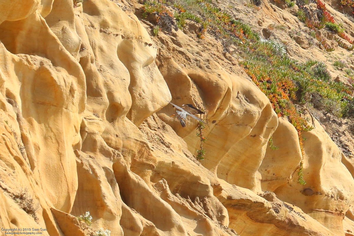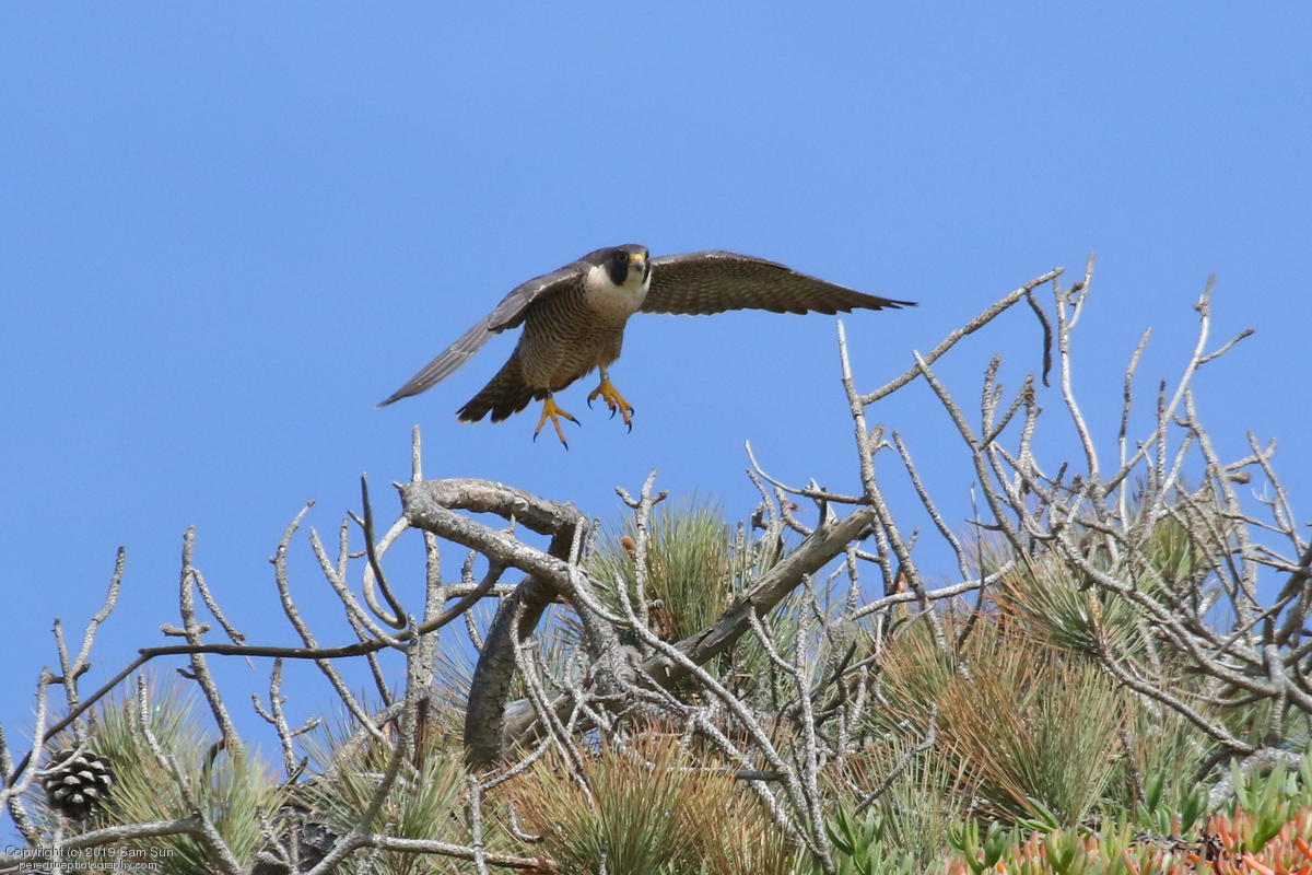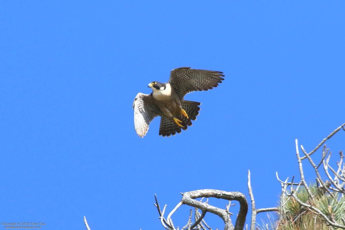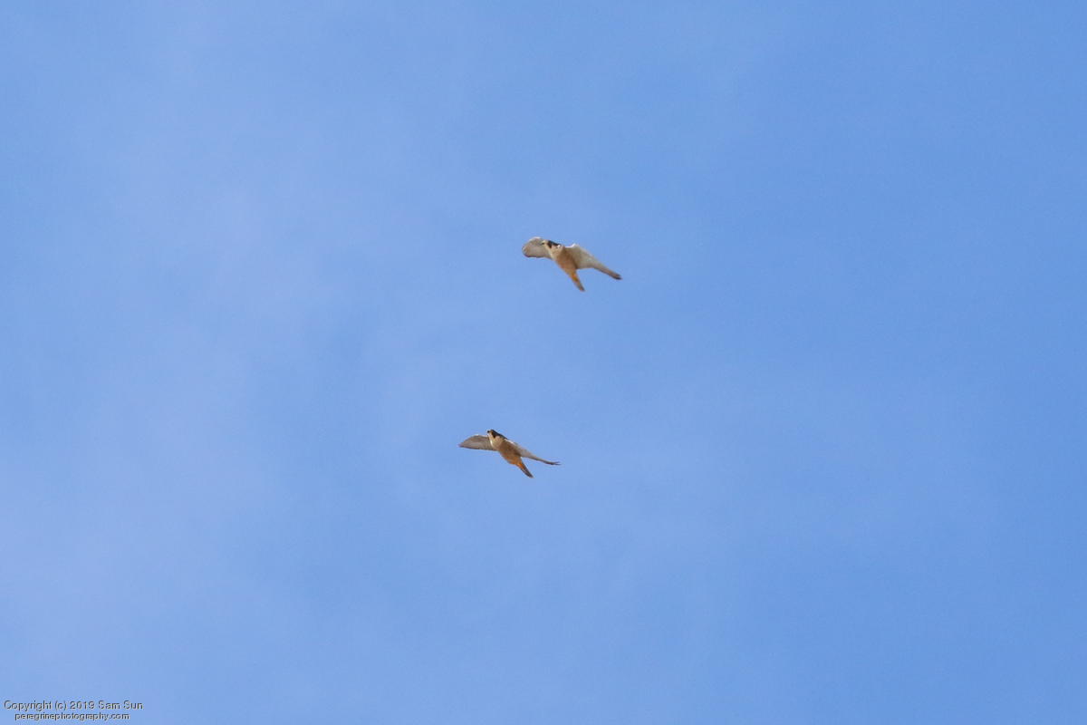 It was a long wait this afternoon. Both adults flew briefly as I arrived. It looked like the female disappeared into the new suspected nest ledge, so I staked it out. Three hours later, the male came by with food and they did an exchange right overhead! Unfortunately, my autofocus decided to lose the handoff shot.