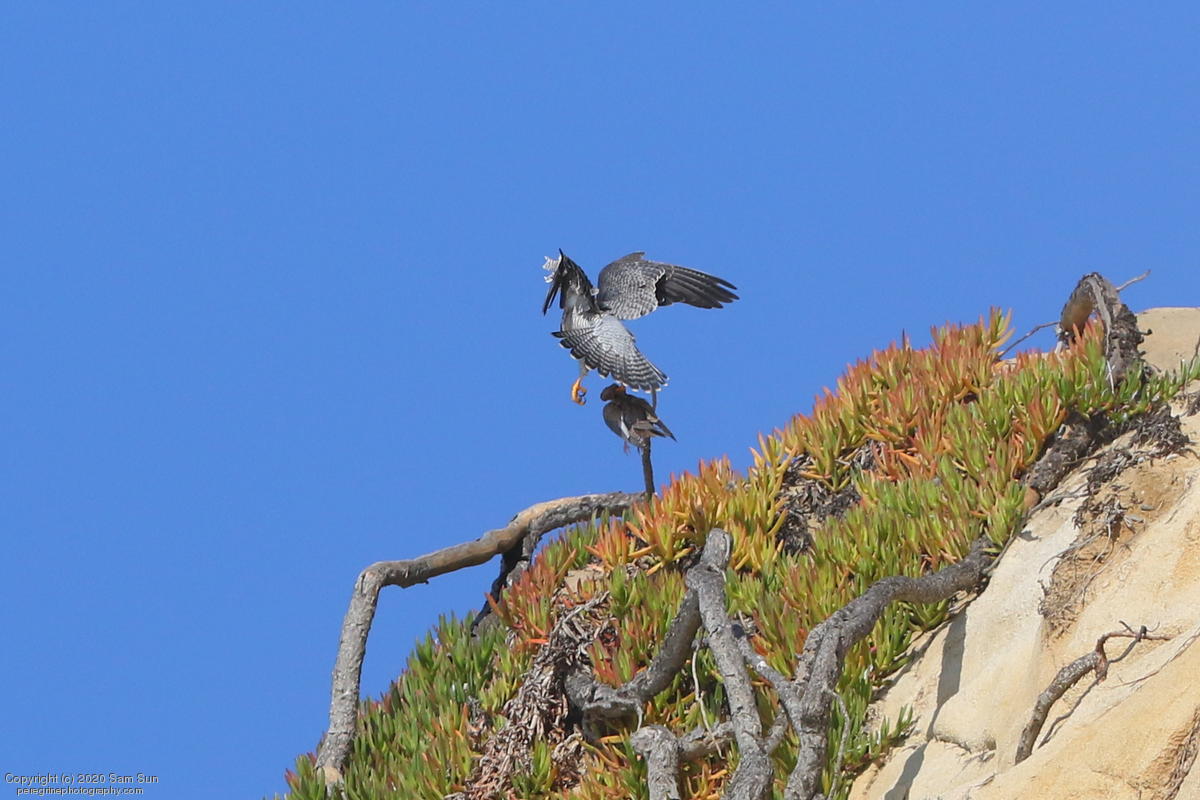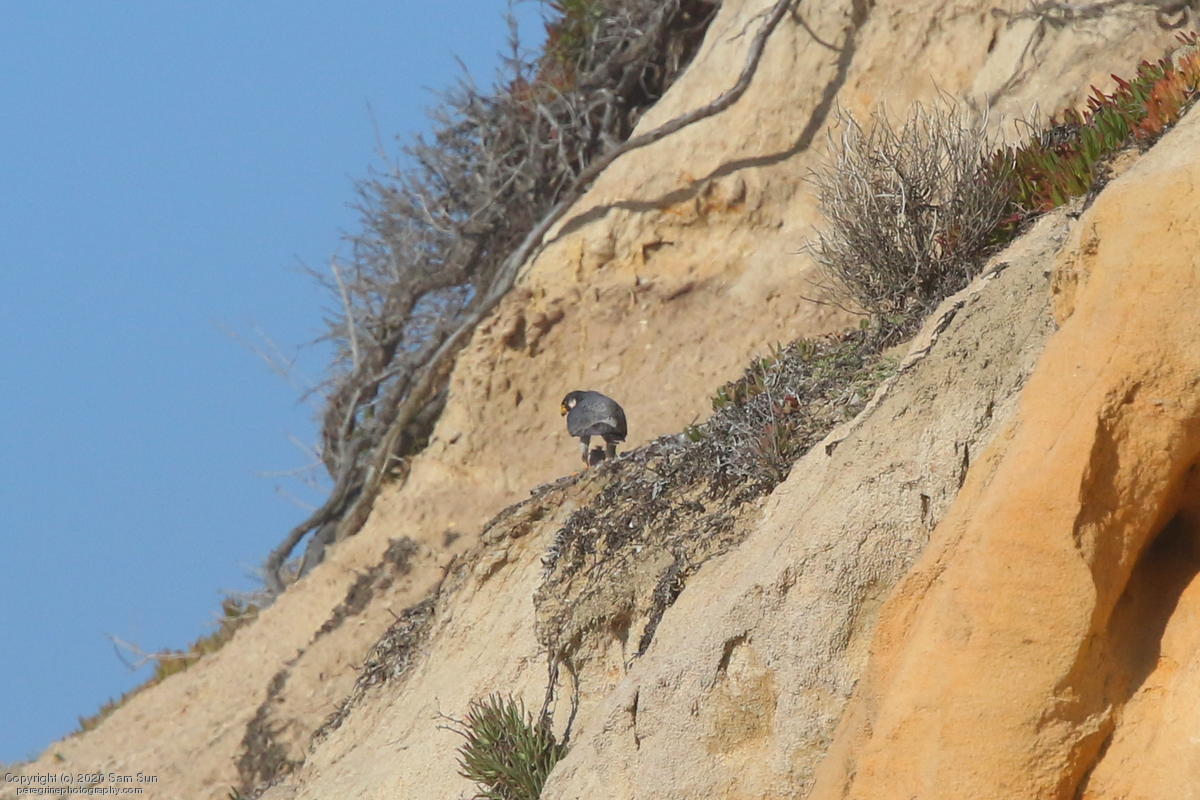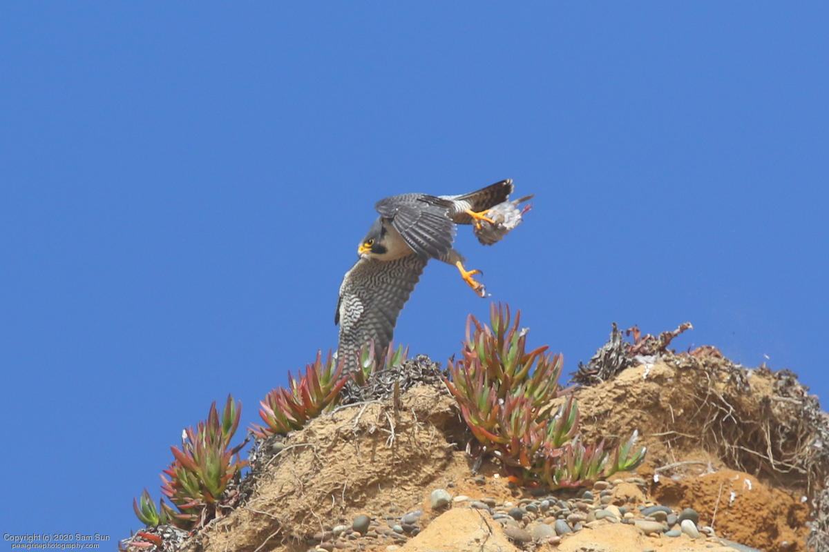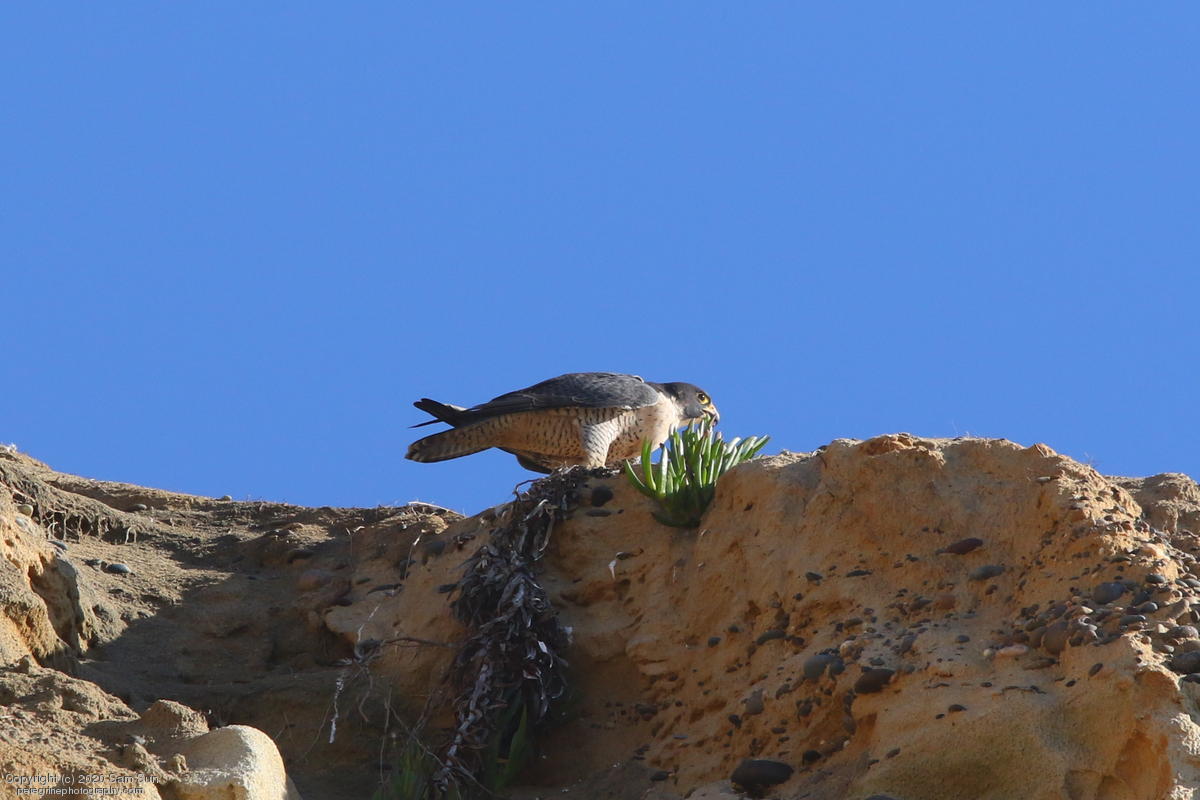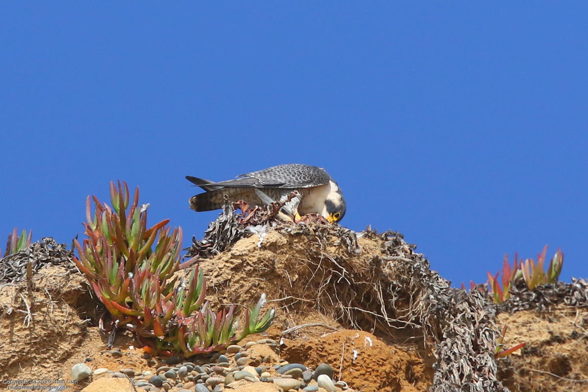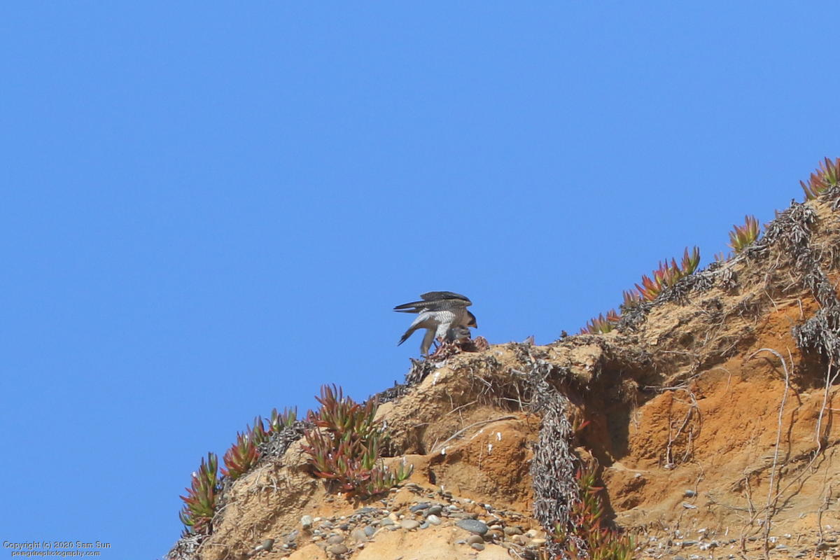 The male brought in some food and played keep away from the female for a bit, then went towards the north end of the cliff to eat. He eventually transfered the leftovers to the female, then went to preen. After a long wait, they mated twice in about half an hour (~3:55, 4:20p).