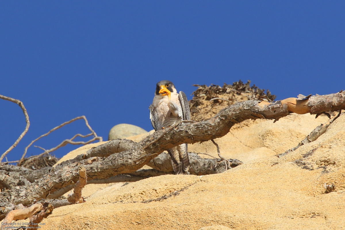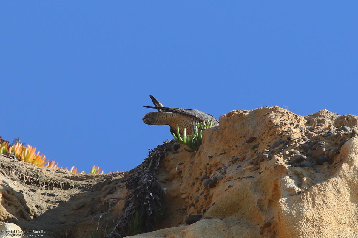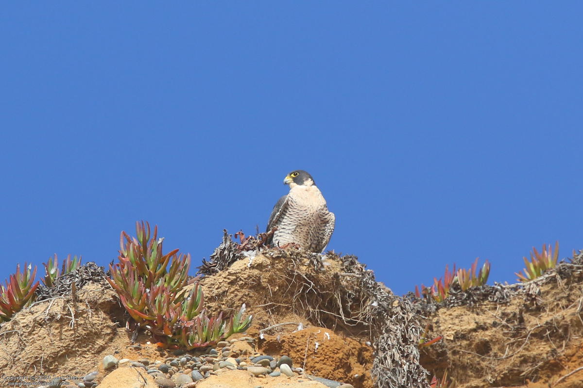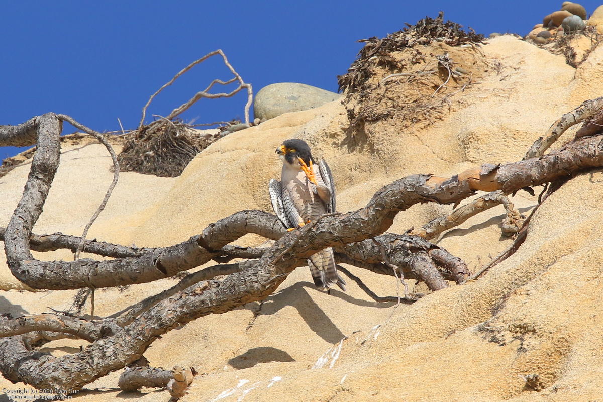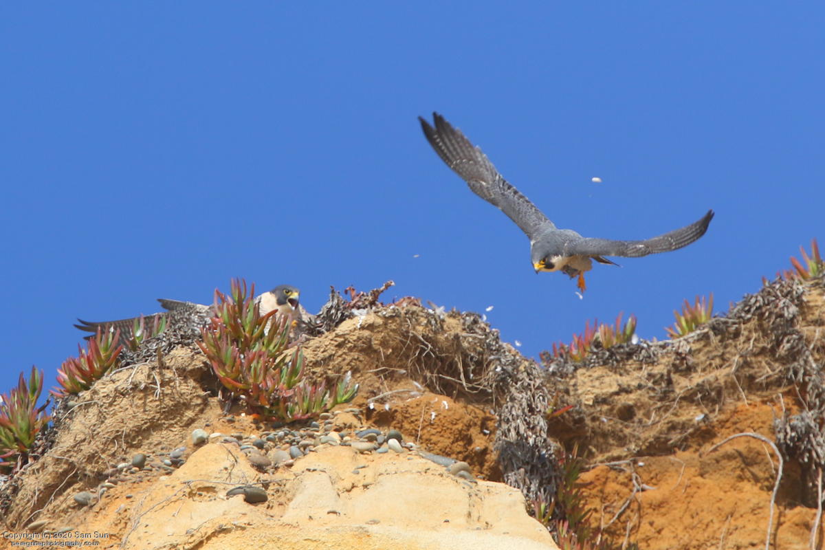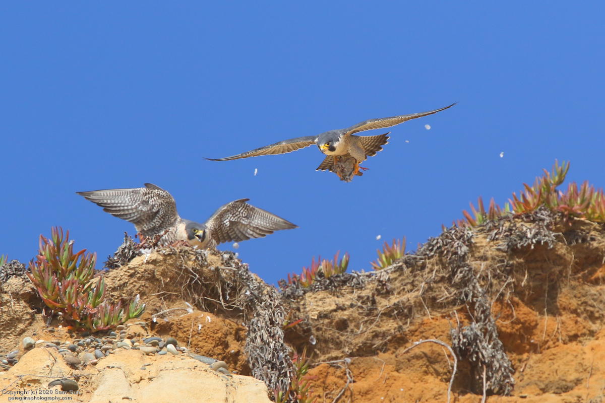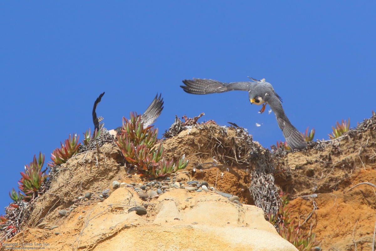 The male brought in some food and played keep away from the female for a bit, then went towards the north end of the cliff to eat. He eventually transfered the leftovers to the female, then went to preen. After a long wait, they mated twice in about half an hour (~3:55, 4:20p).