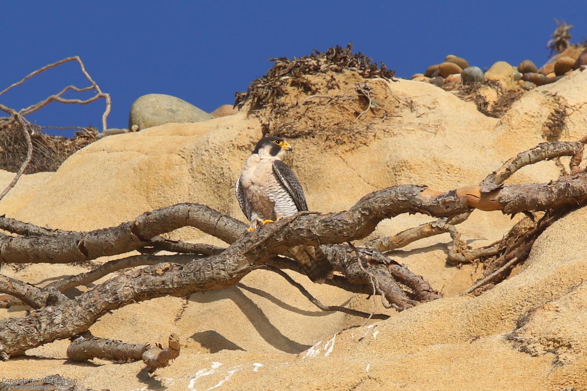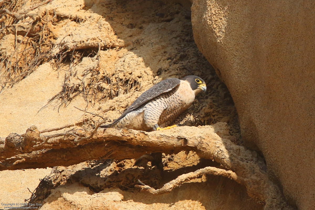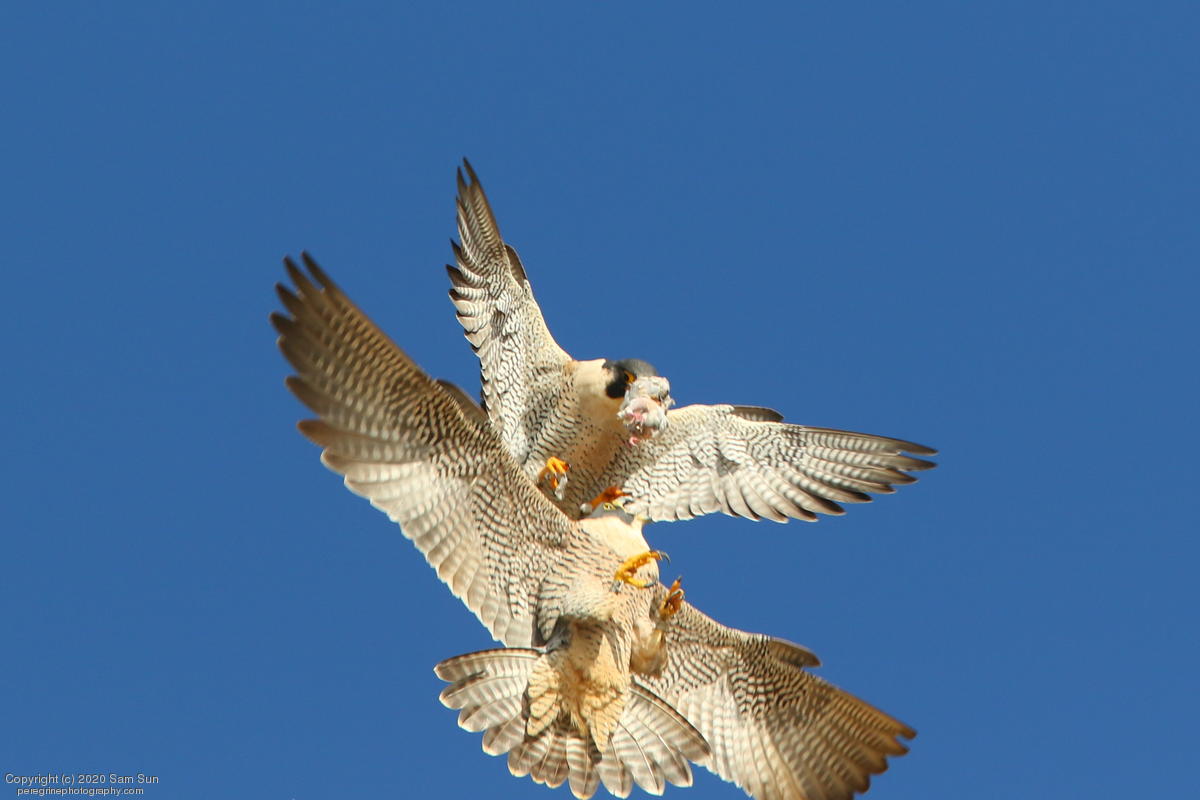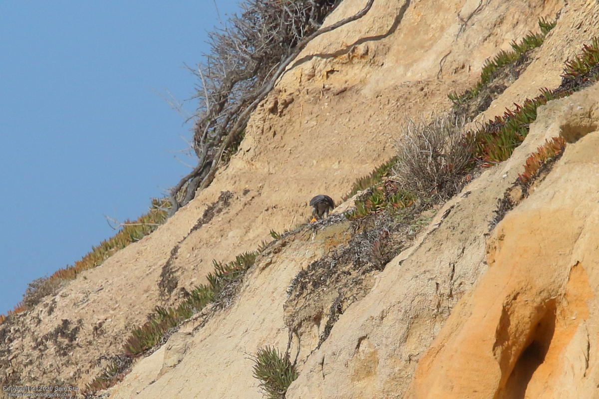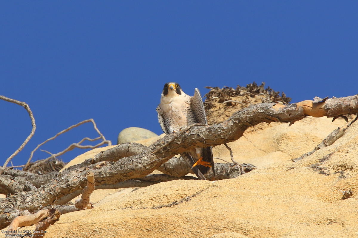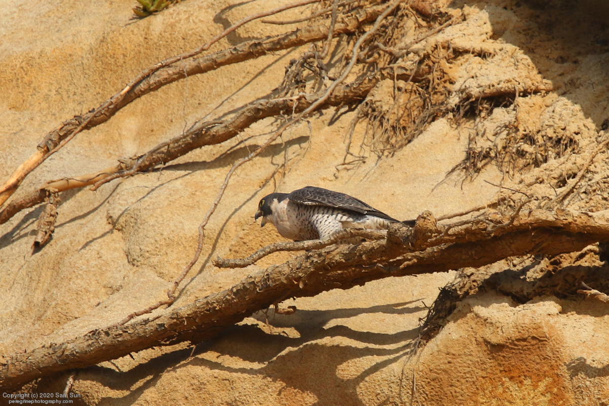 The male brought in some food and played keep away from the female for a bit, then went towards the north end of the cliff to eat. He eventually transfered the leftovers to the female, then went to preen. After a long wait, they mated twice in about half an hour (~3:55, 4:20p).