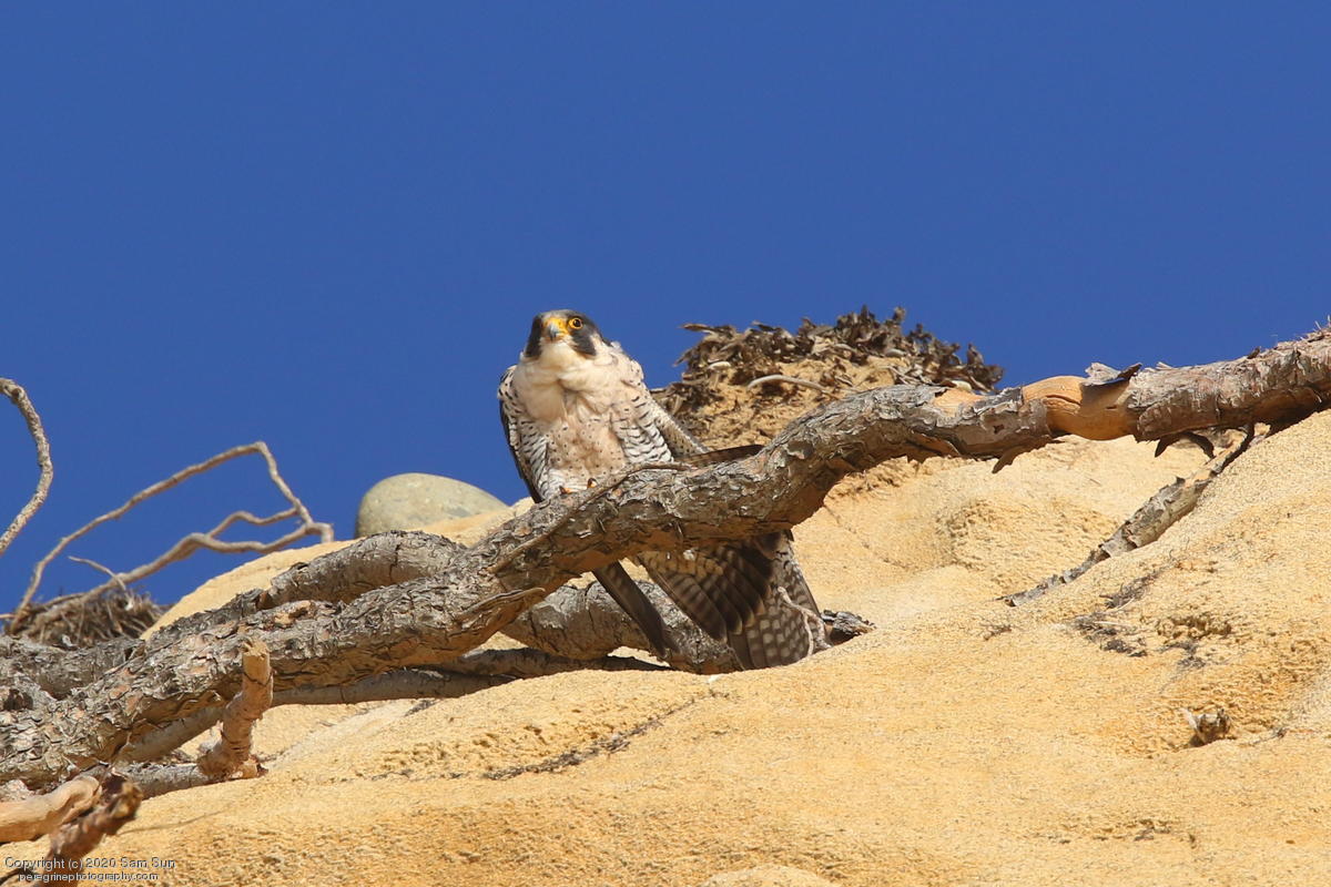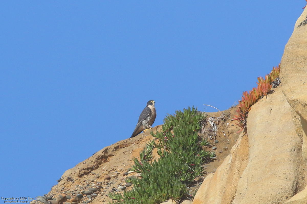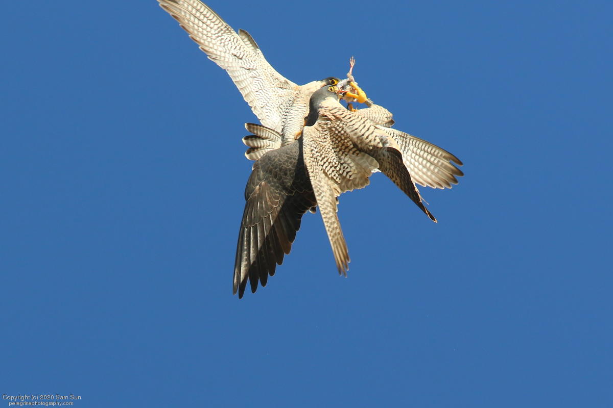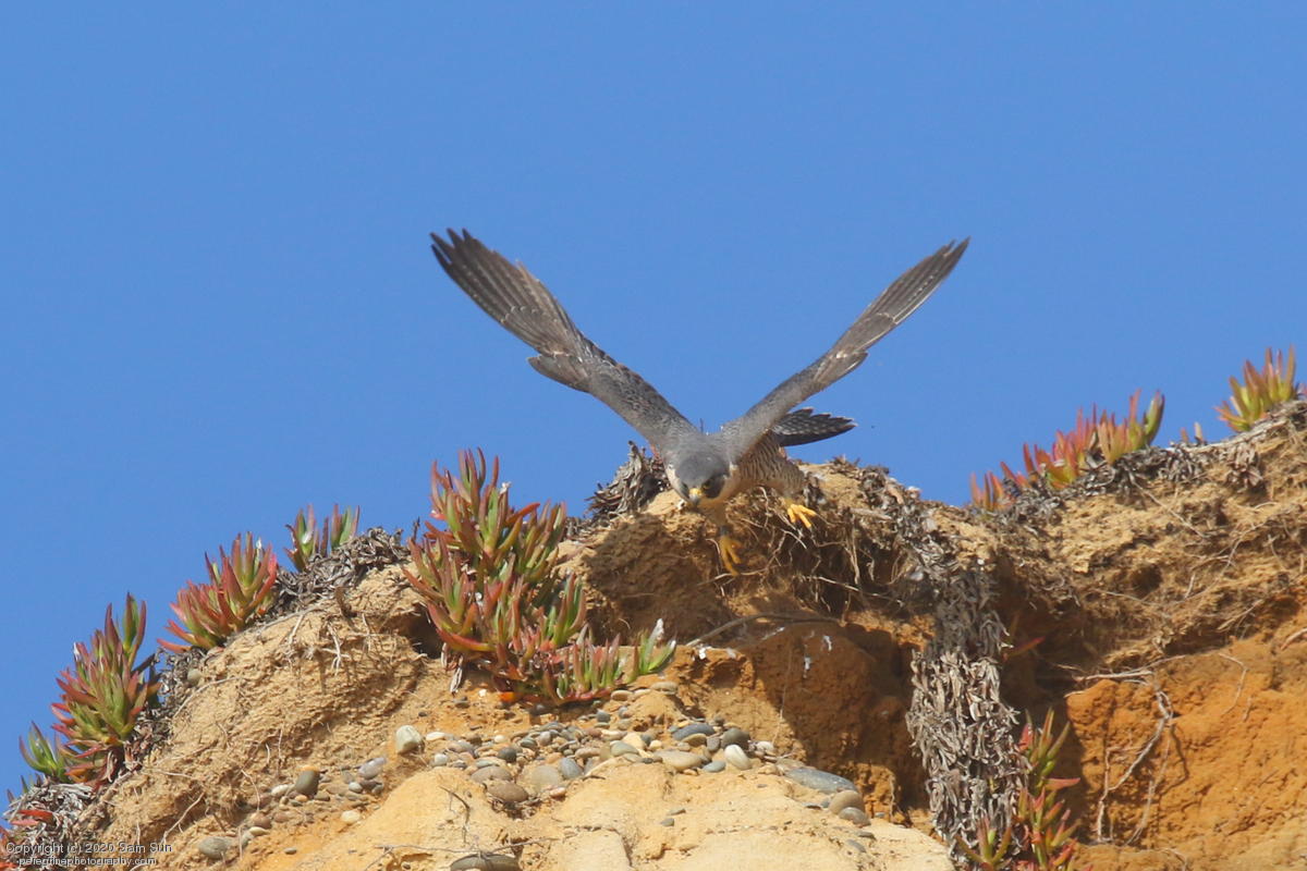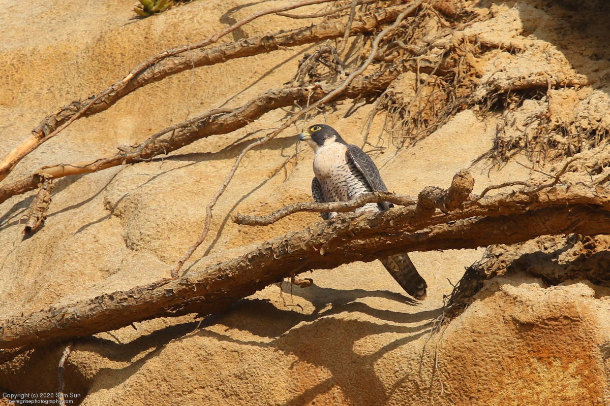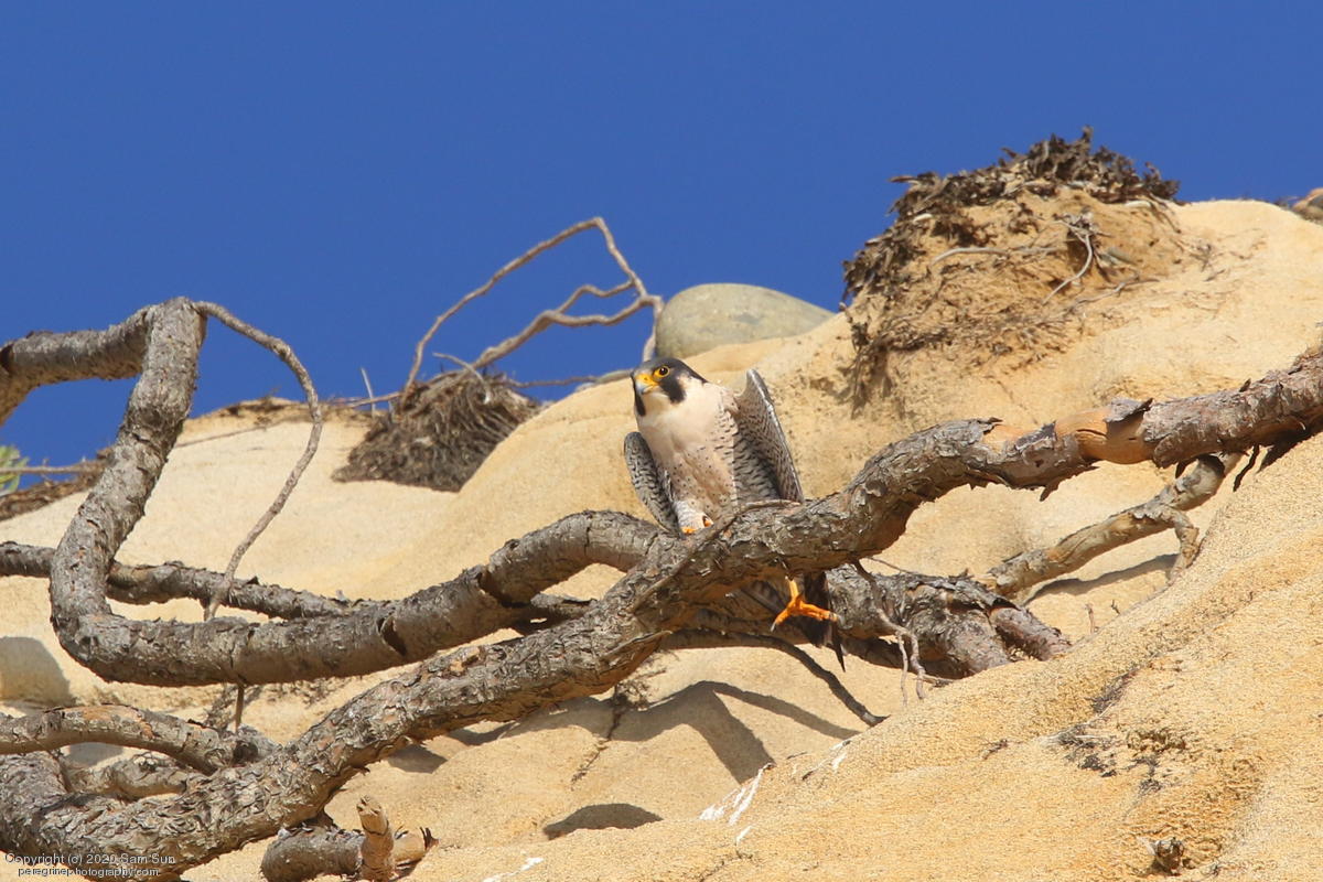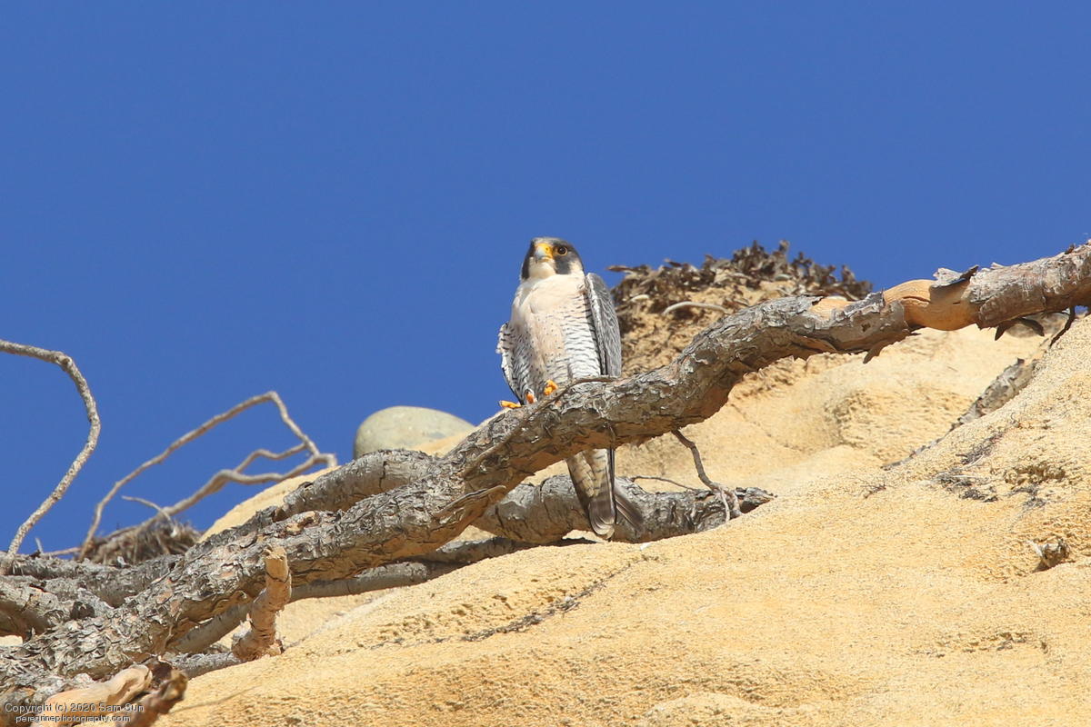 The male brought in some food and played keep away from the female for a bit, then went towards the north end of the cliff to eat. He eventually transfered the leftovers to the female, then went to preen. After a long wait, they mated twice in about half an hour (~3:55, 4:20p).