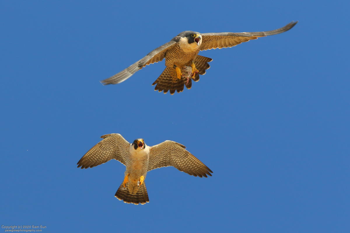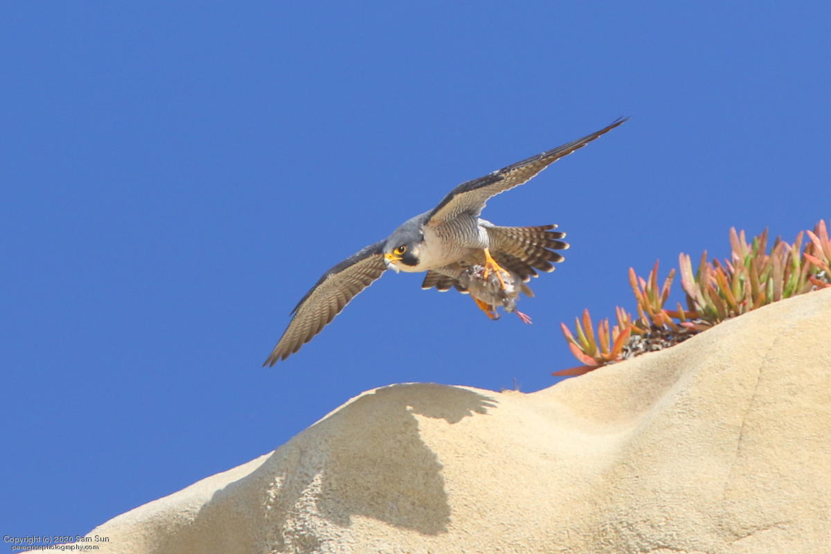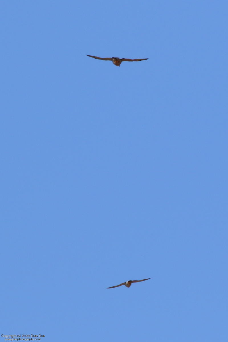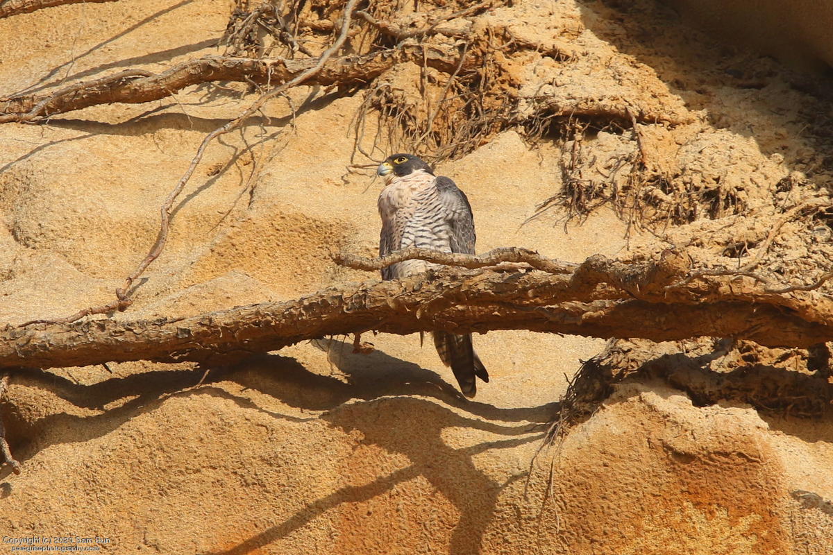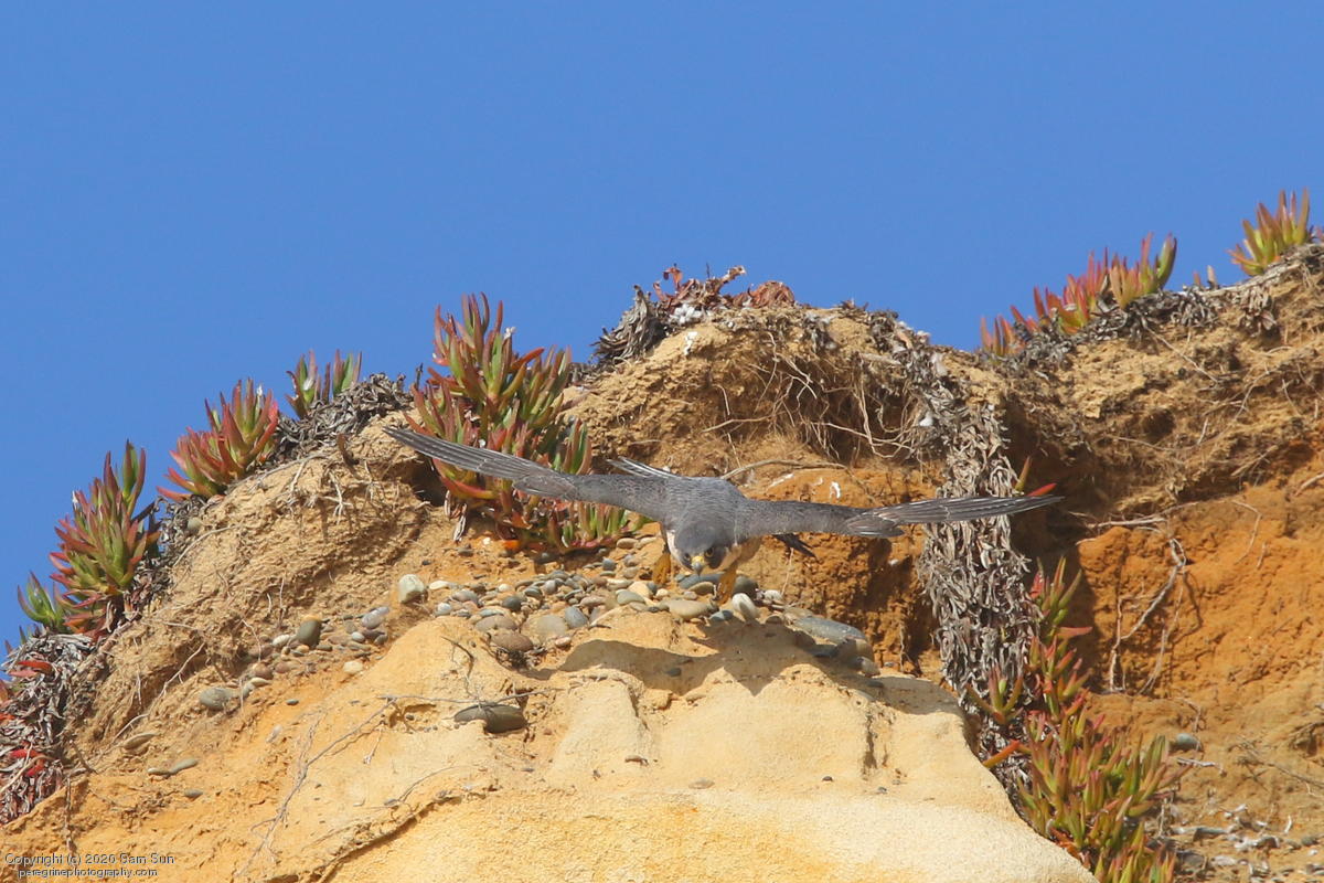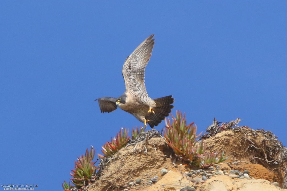 The male brought in some food and played keep away from the female for a bit, then went towards the north end of the cliff to eat. He eventually transfered the leftovers to the female, then went to preen. After a long wait, they mated twice in about half an hour (~3:55, 4:20p).