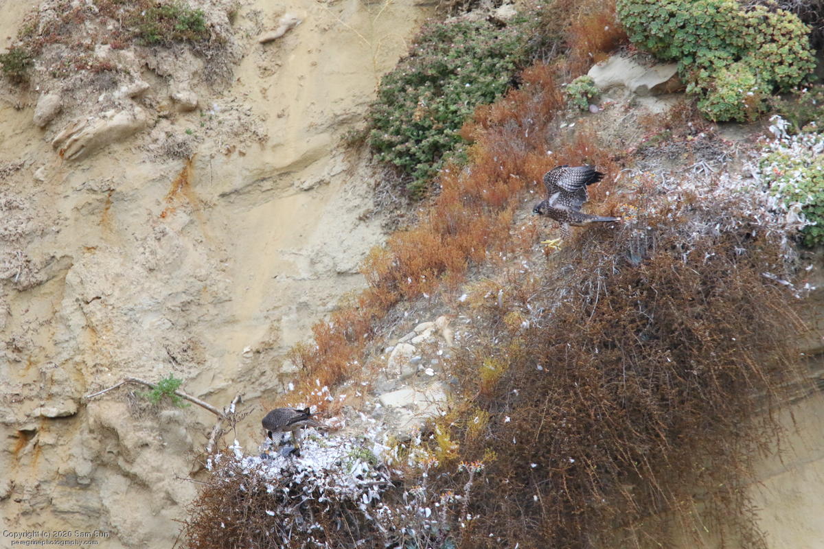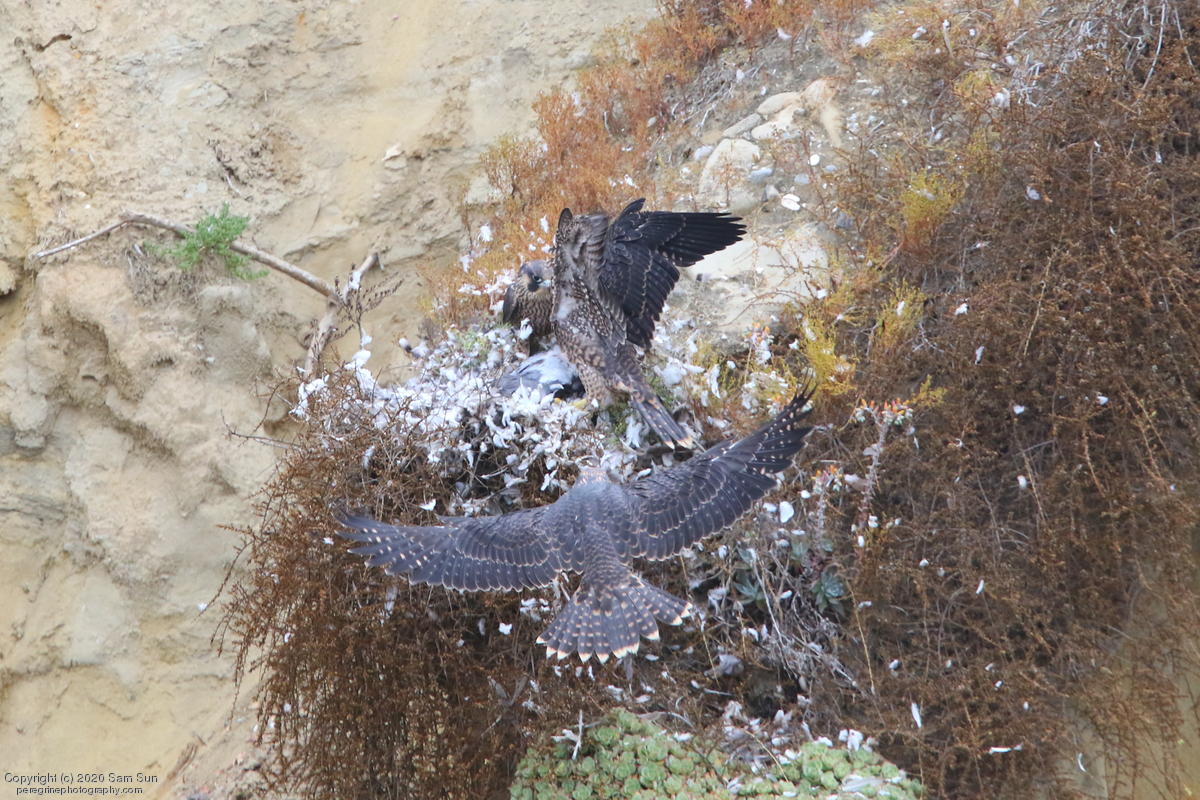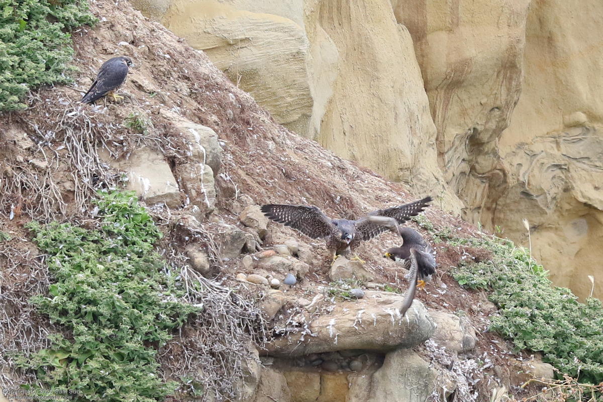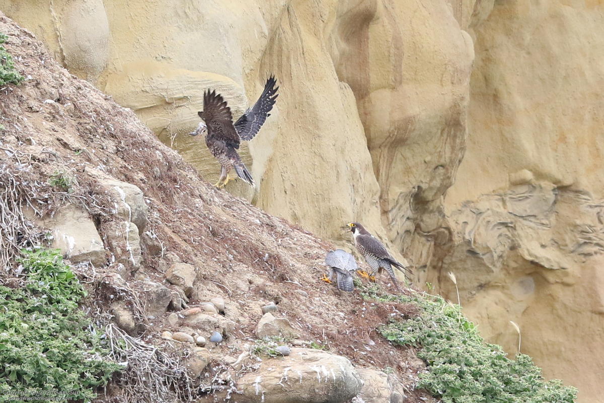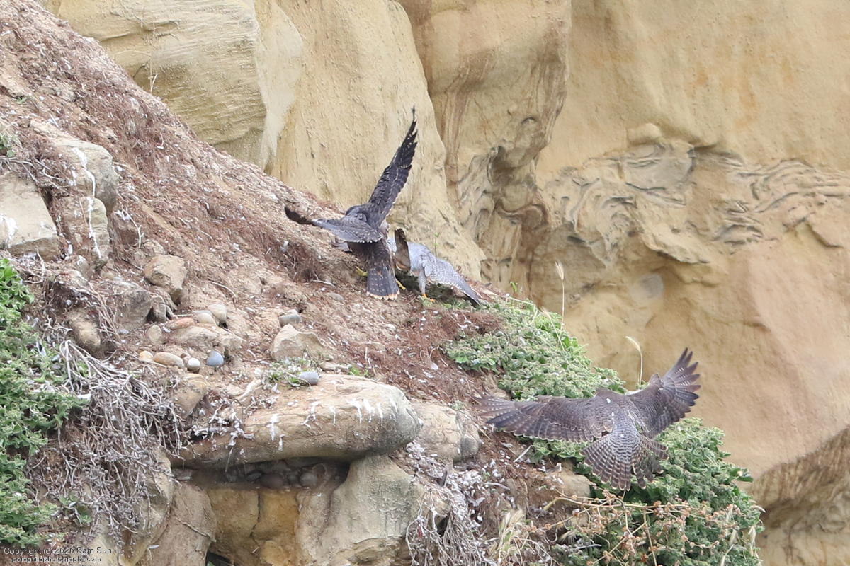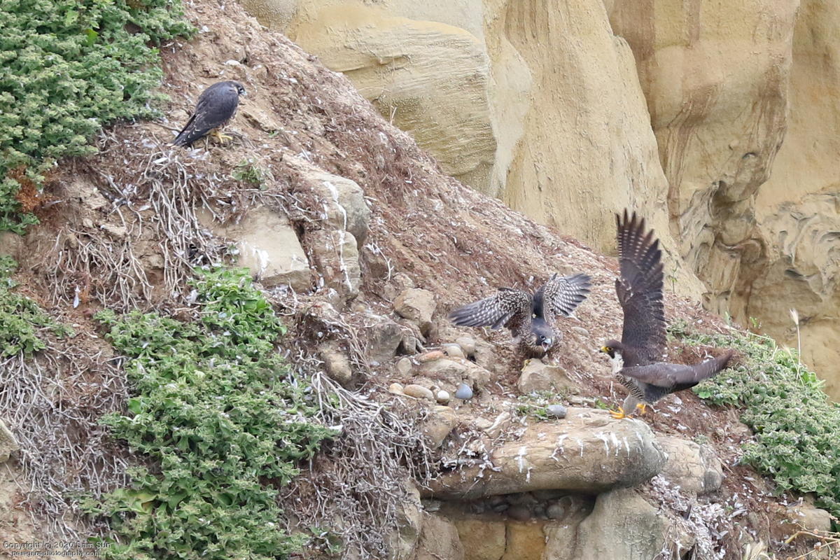 Three chicks at La Jolla have fledged - about 2-3 days ago according to other photographers. They were making some short flights today. The parents made two food deliveries during the afternoon.