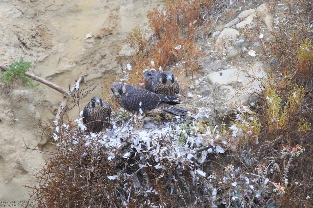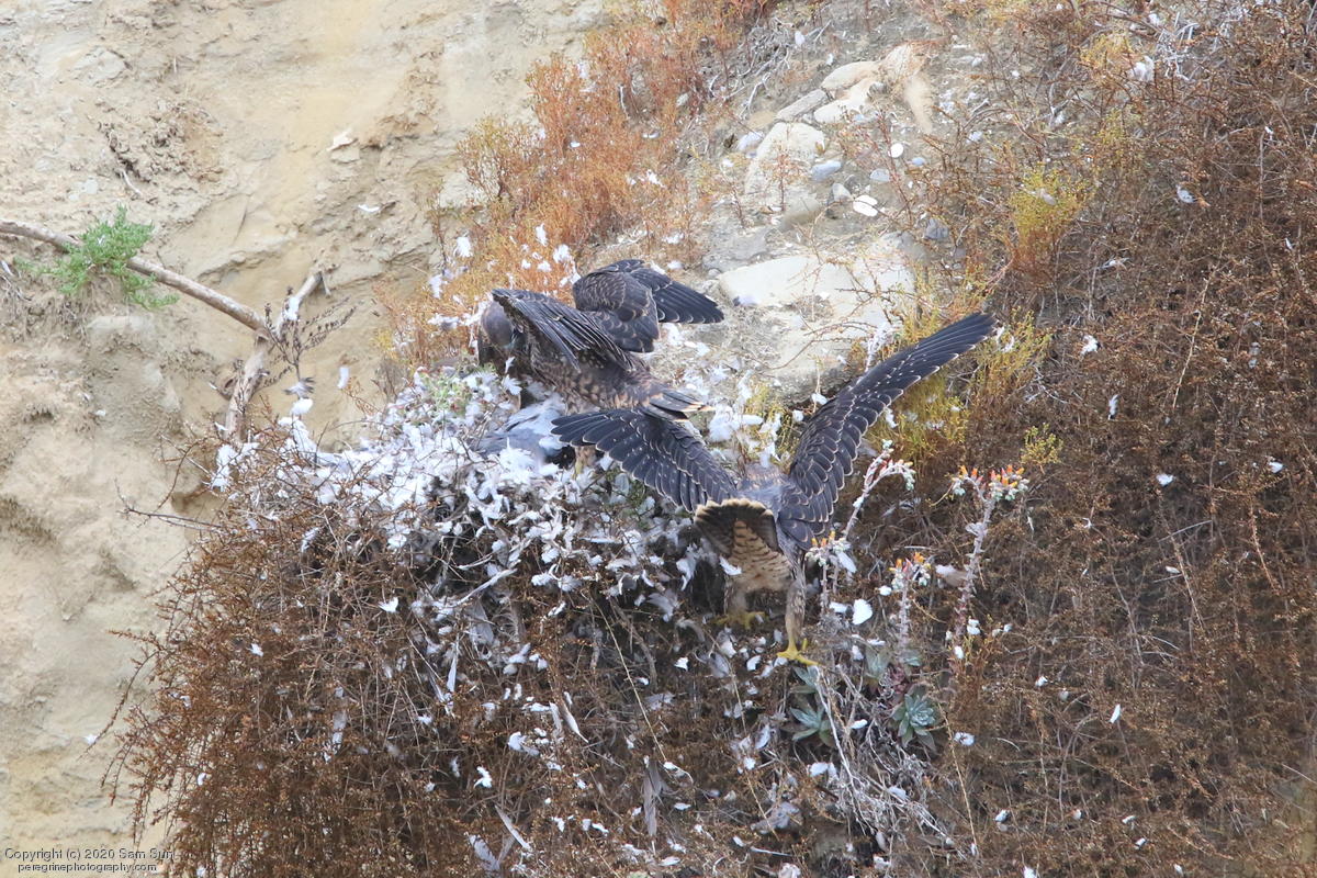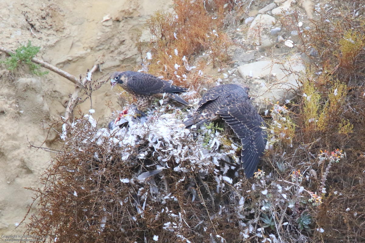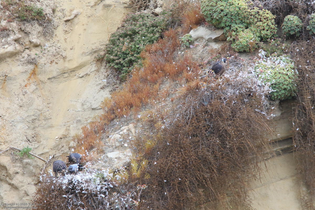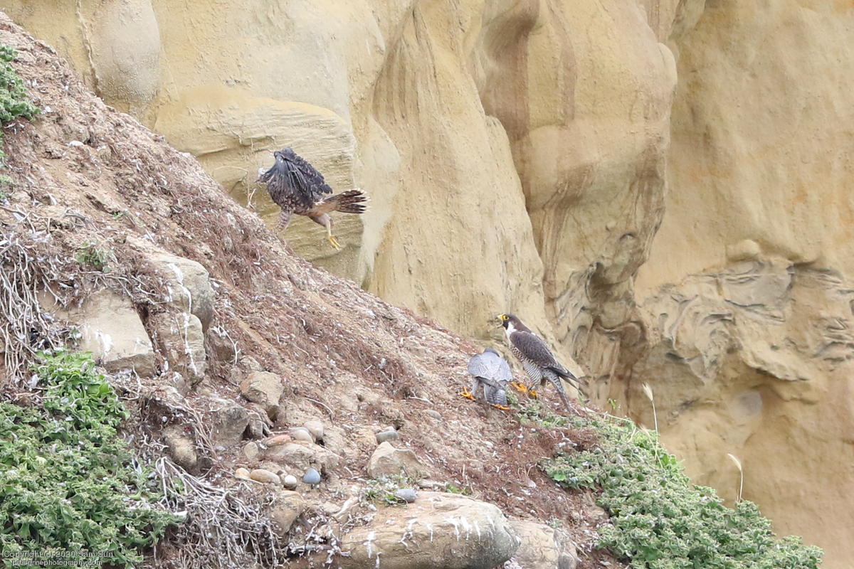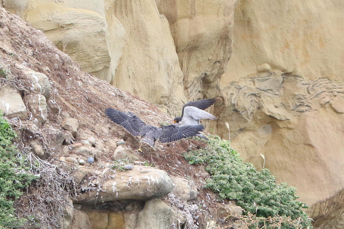 Three chicks at La Jolla have fledged - about 2-3 days ago according to other photographers. They were making some short flights today. The parents made two food deliveries during the afternoon.