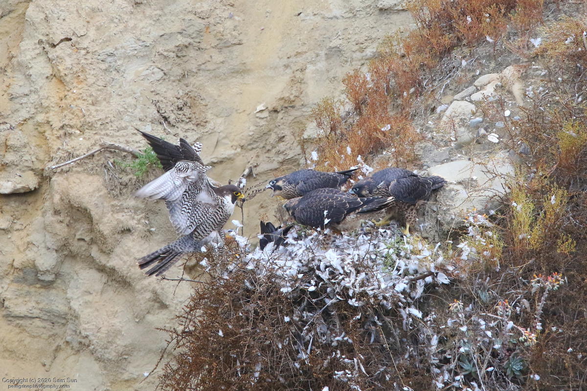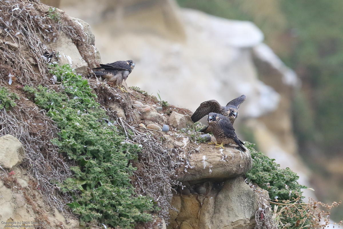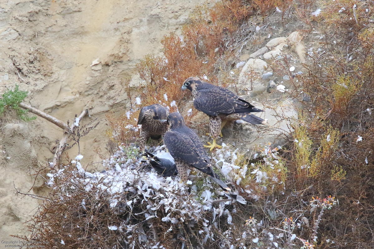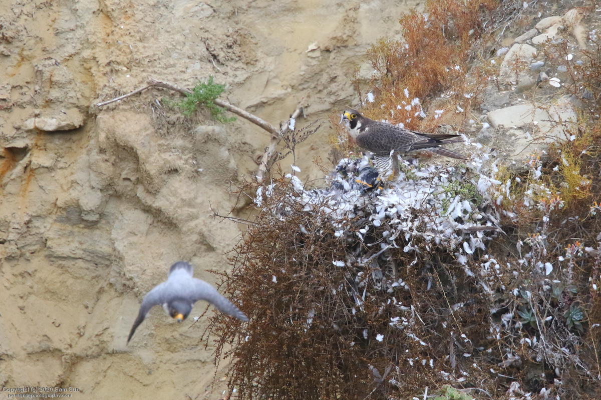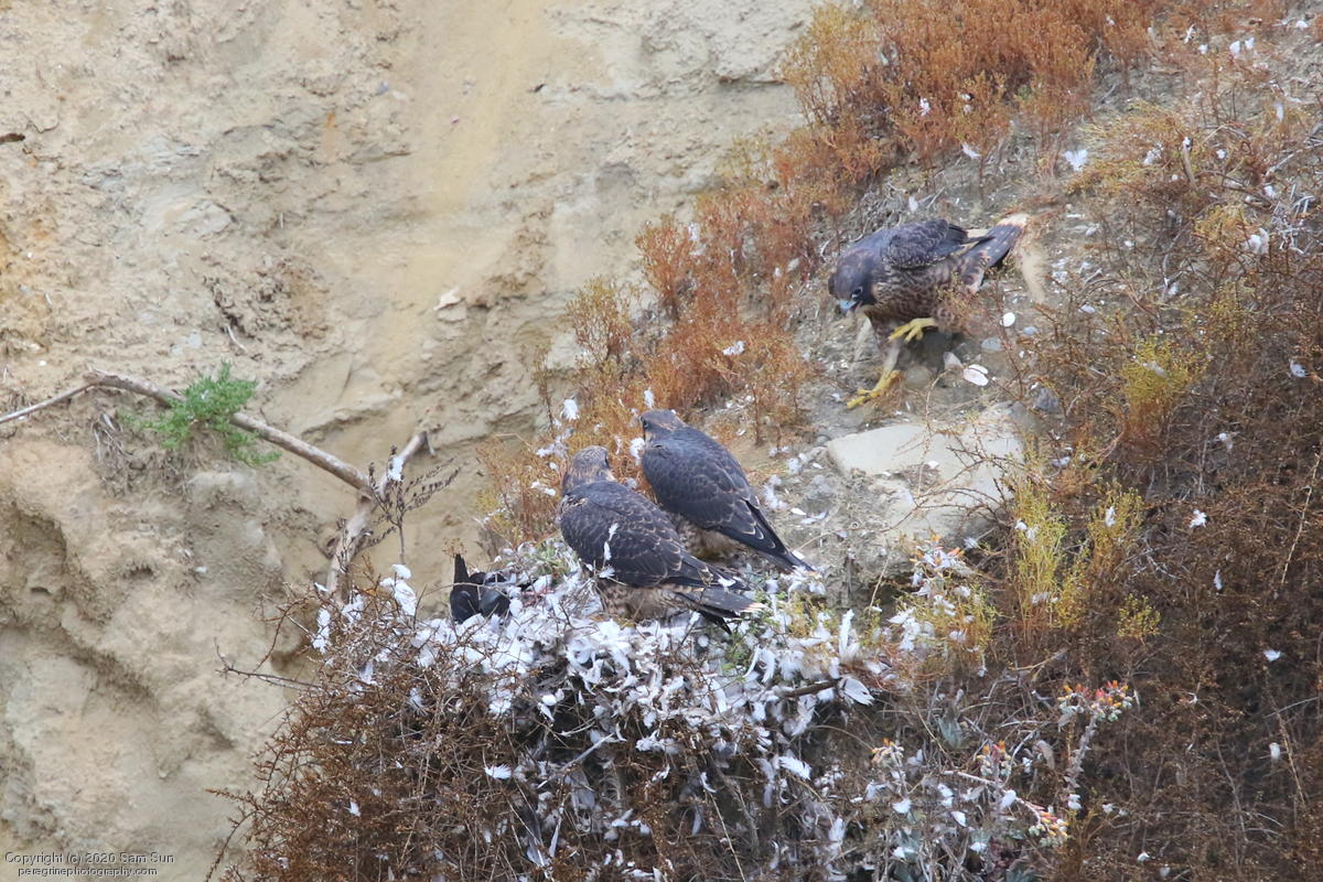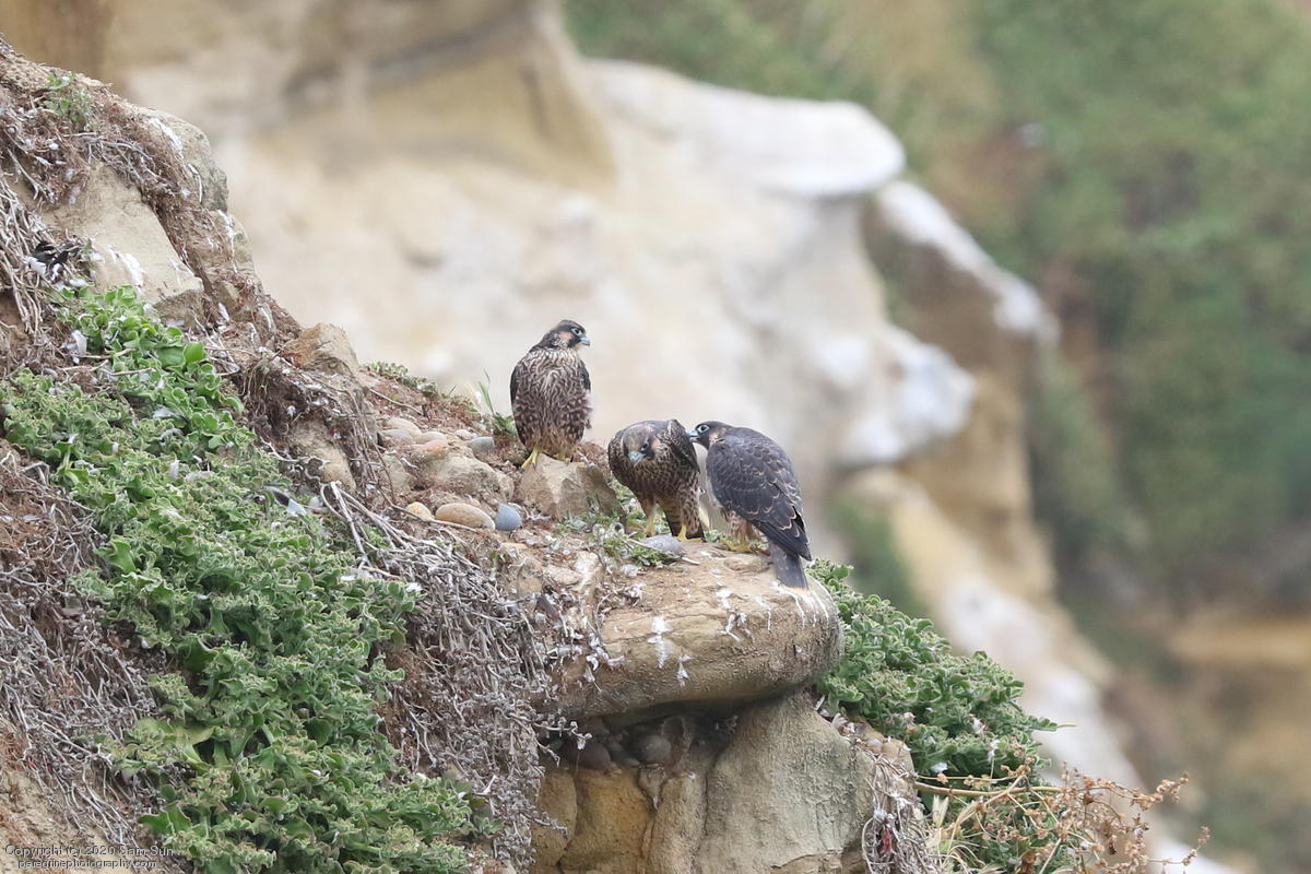 Three chicks at La Jolla have fledged - about 2-3 days ago according to other photographers. They were making some short flights today. The parents made two food deliveries during the afternoon.