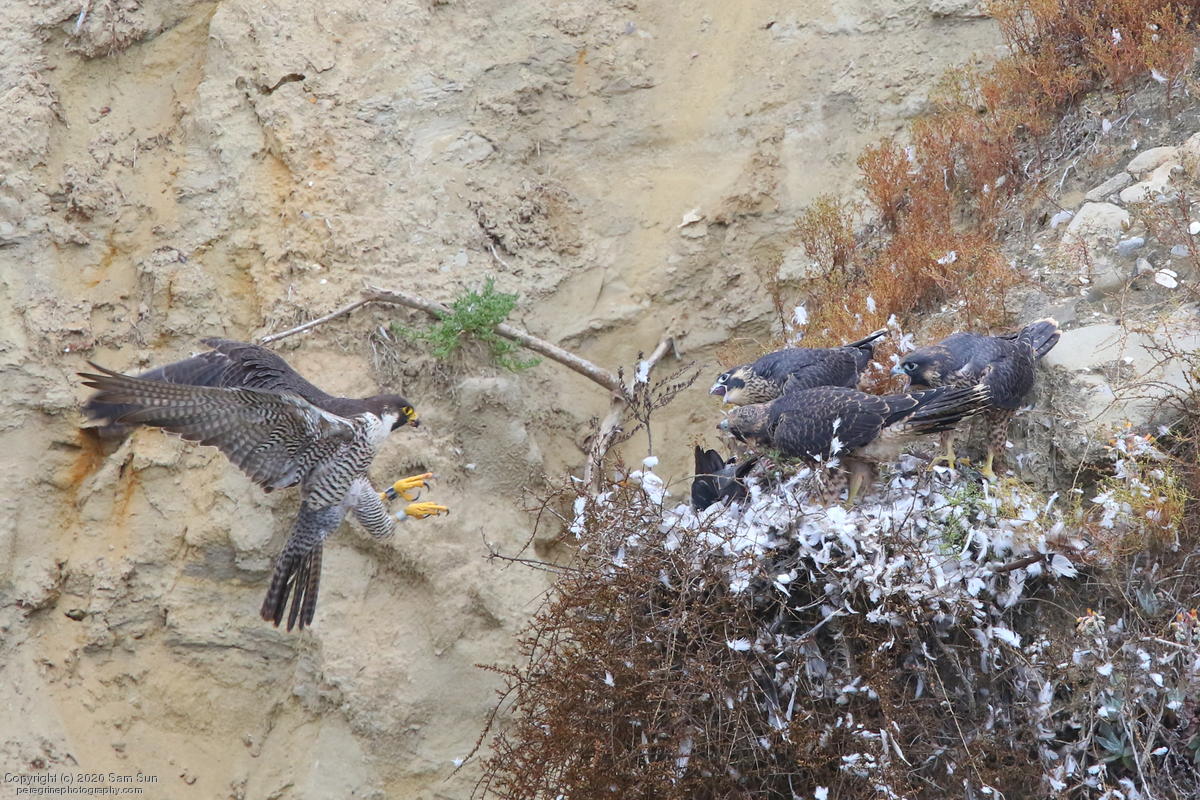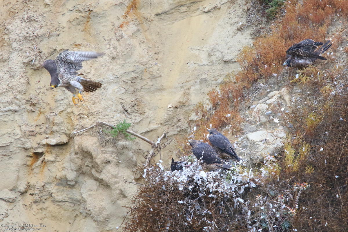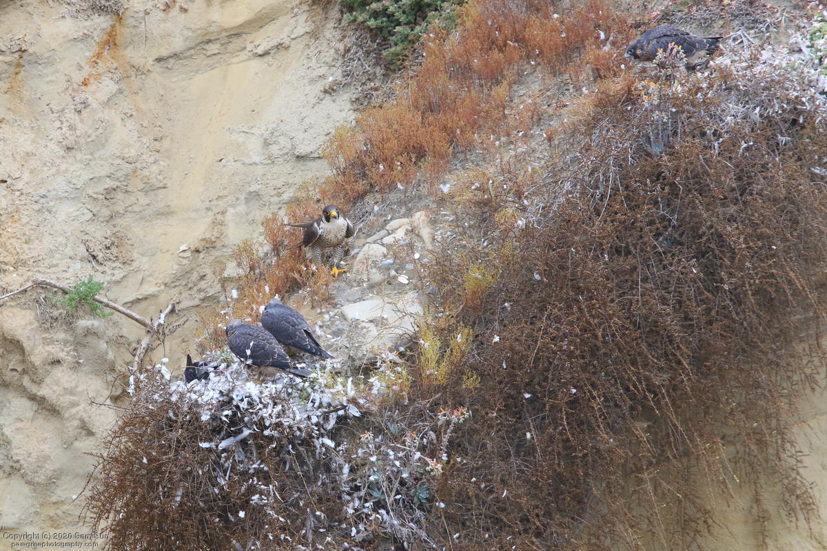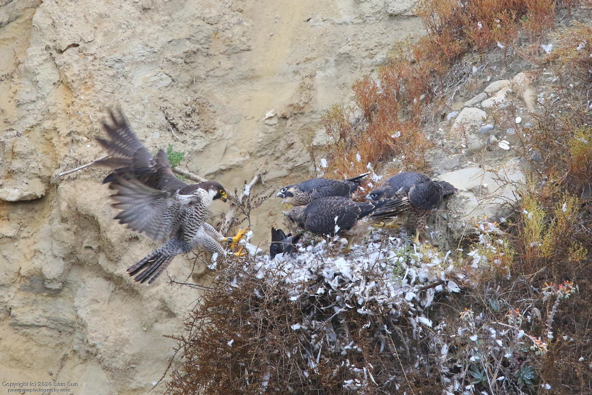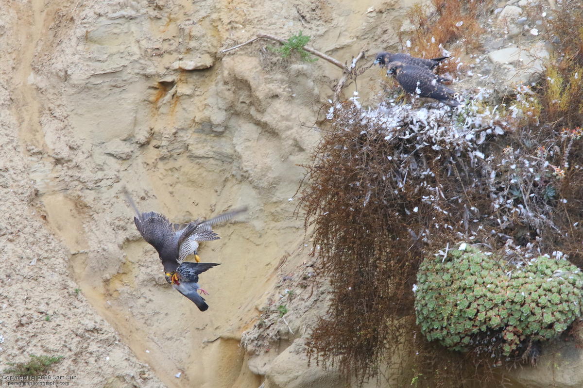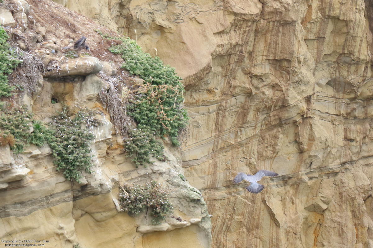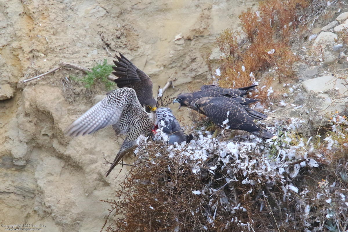 Three chicks at La Jolla have fledged - about 2-3 days ago according to other photographers. They were making some short flights today. The parents made two food deliveries during the afternoon.