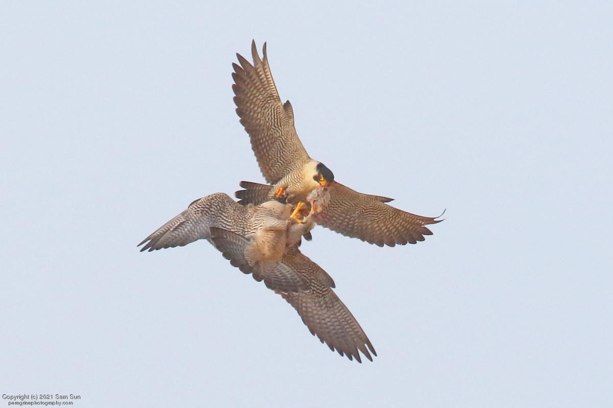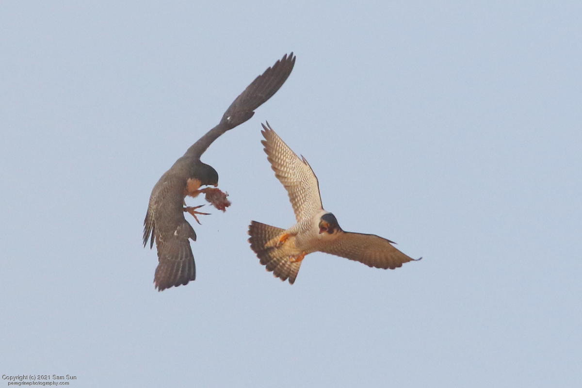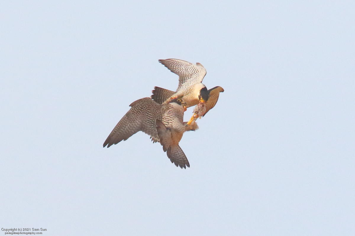 A sub-adult peregrine wandered by and the male chased him off. Later on, he brought in a kill and did a food transfer.