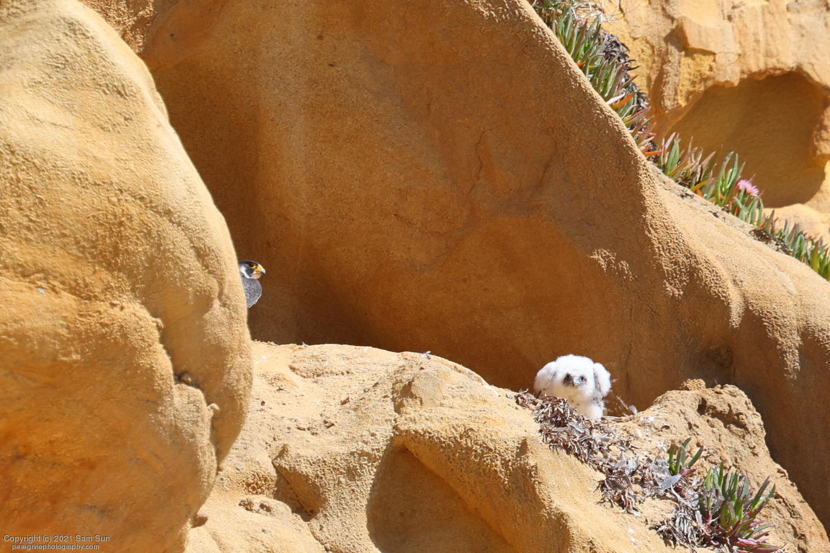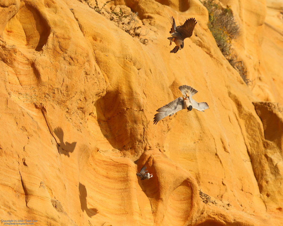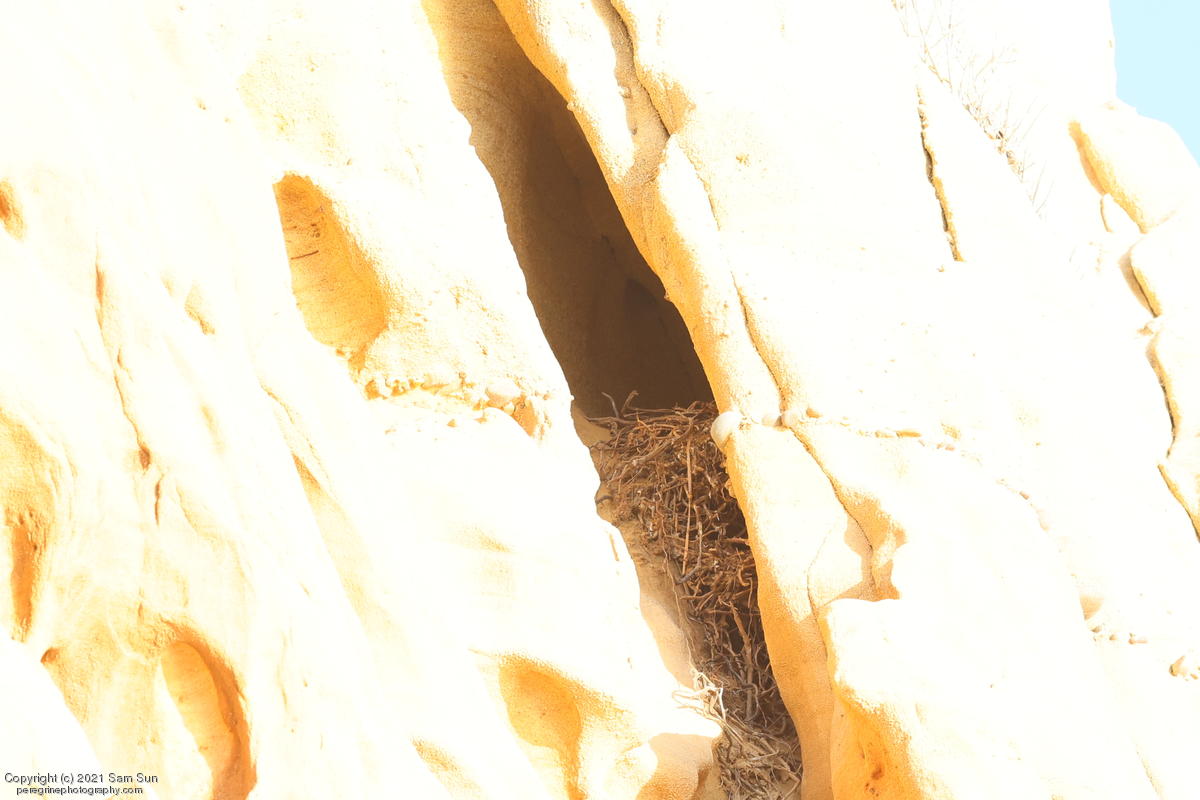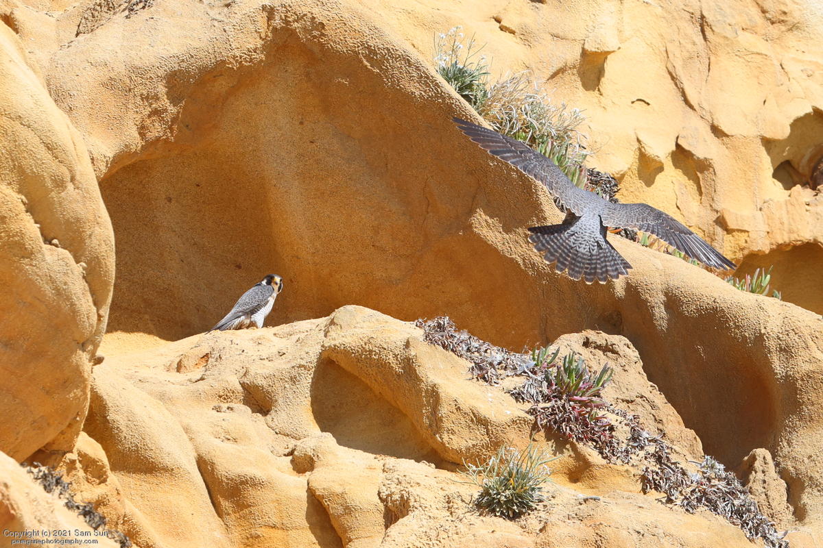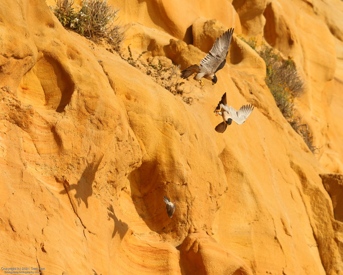 Food exchange sequence. Mom drops the first attempt, and misses grabbing it as it bounces off a cliff ledge. Dad retrieved it (out of the frame, unfortunately) and they did another transfer. Total time elapsed in this sequence - 7 seconds!