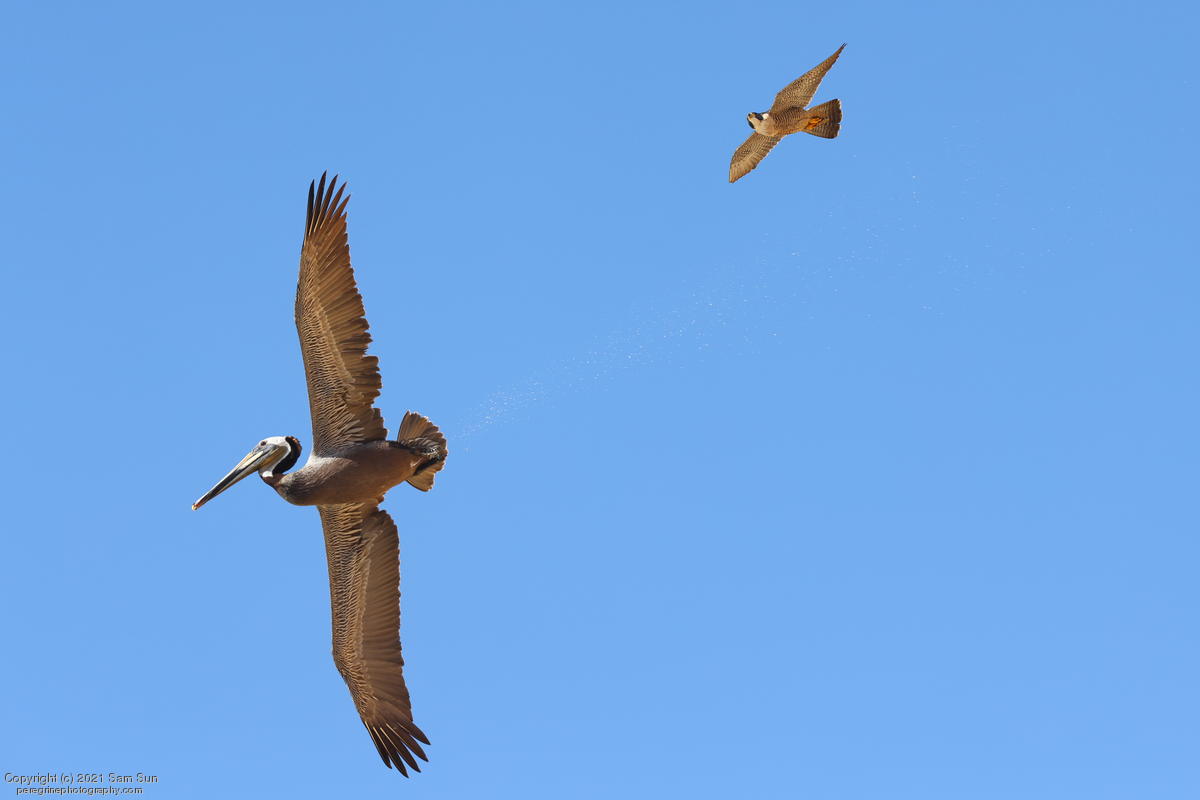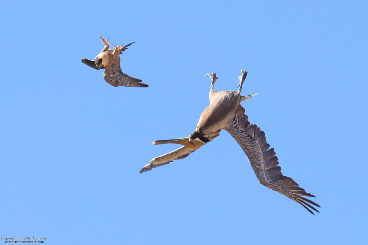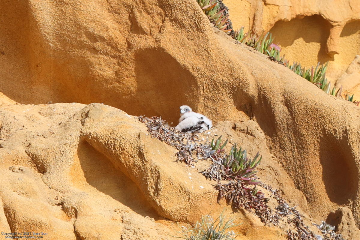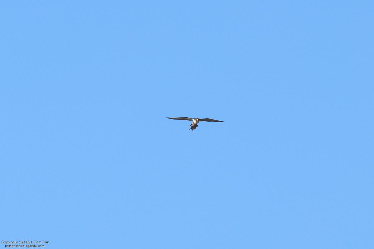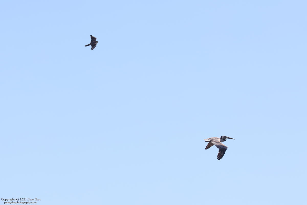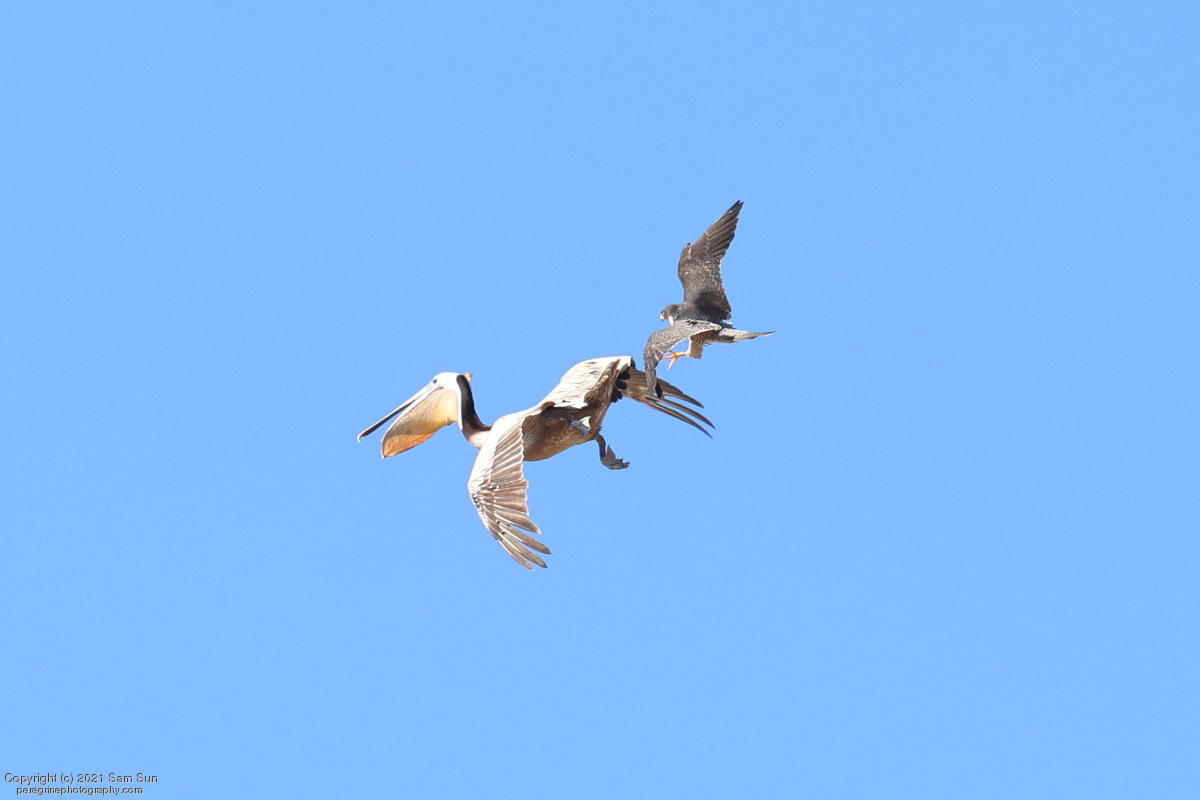 The chick posed for the cameras today separately with Dad and then Mom. There were a couple pelican chases, but the winds were pretty calm and not many came by. Dad brought in food for an exchange at 6:04p. Mom dropped it, and they both dove to recover it. I missed the recovery, but Dad apparently got it off the beach and they did another transfer within seconds.