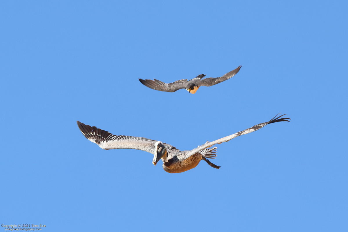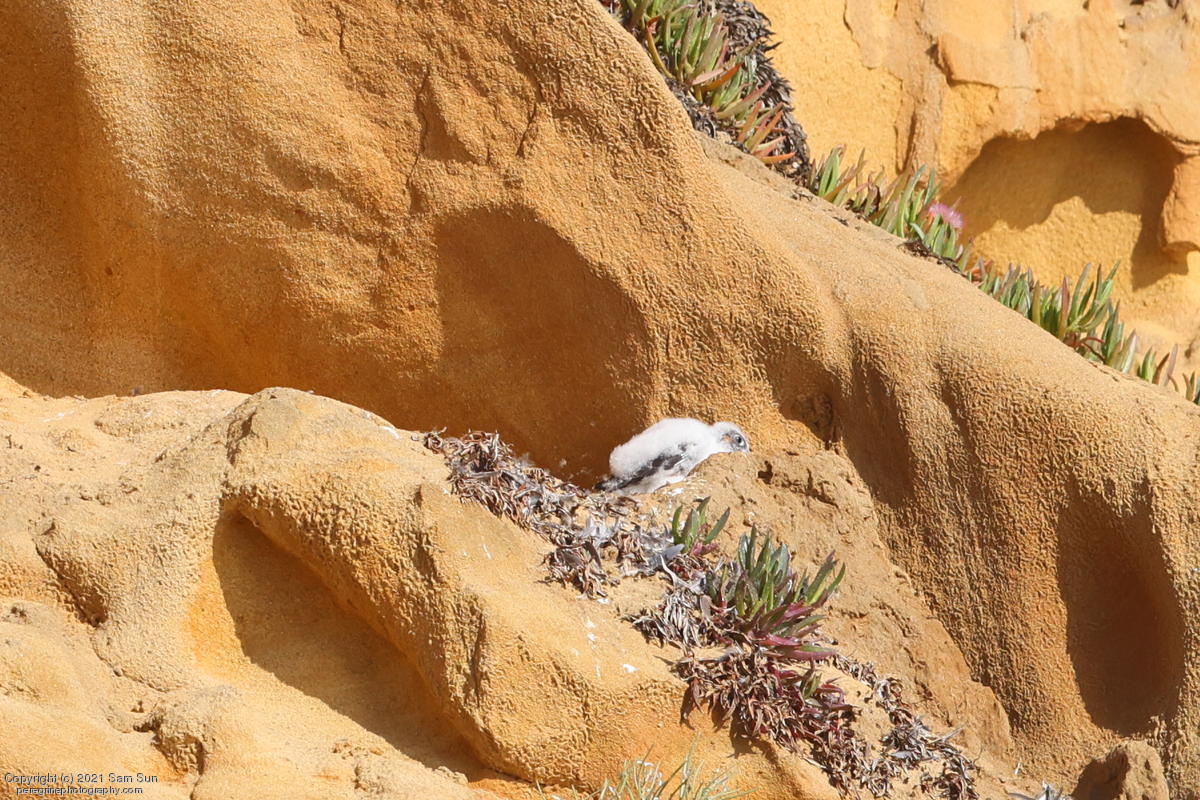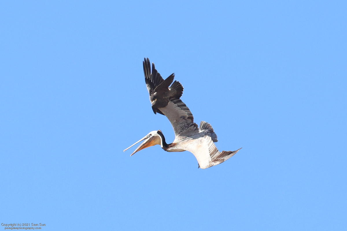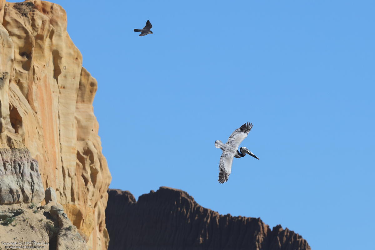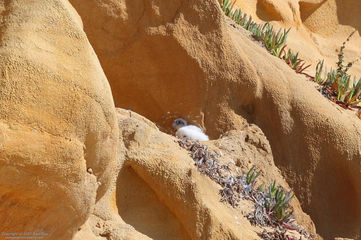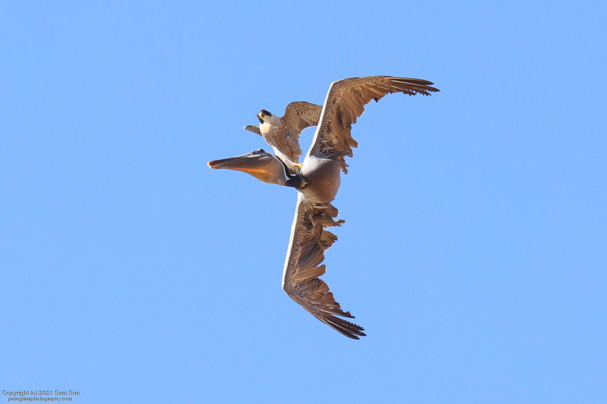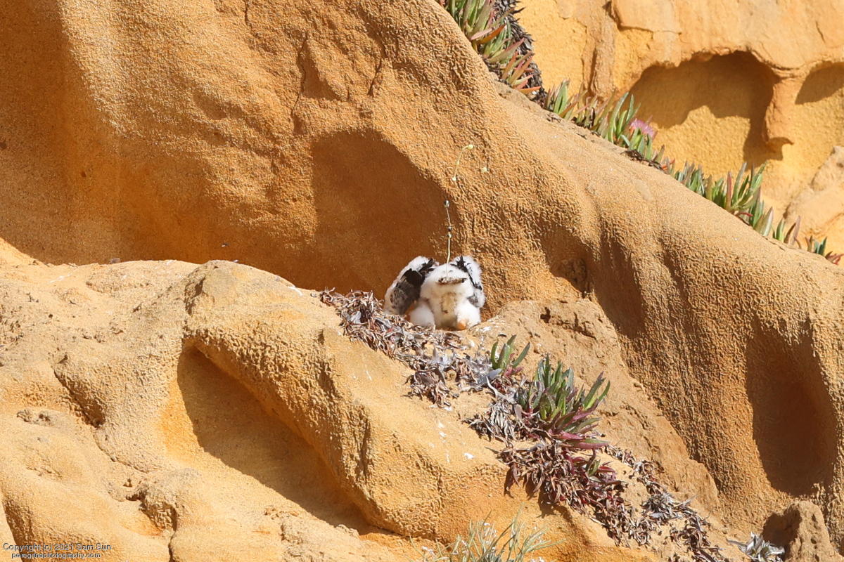 The chick posed for the cameras today separately with Dad and then Mom. There were a couple pelican chases, but the winds were pretty calm and not many came by. Dad brought in food for an exchange at 6:04p. Mom dropped it, and they both dove to recover it. I missed the recovery, but Dad apparently got it off the beach and they did another transfer within seconds.
