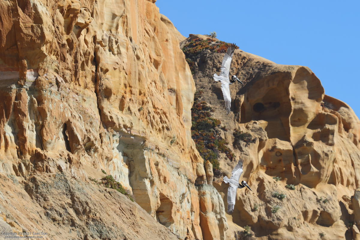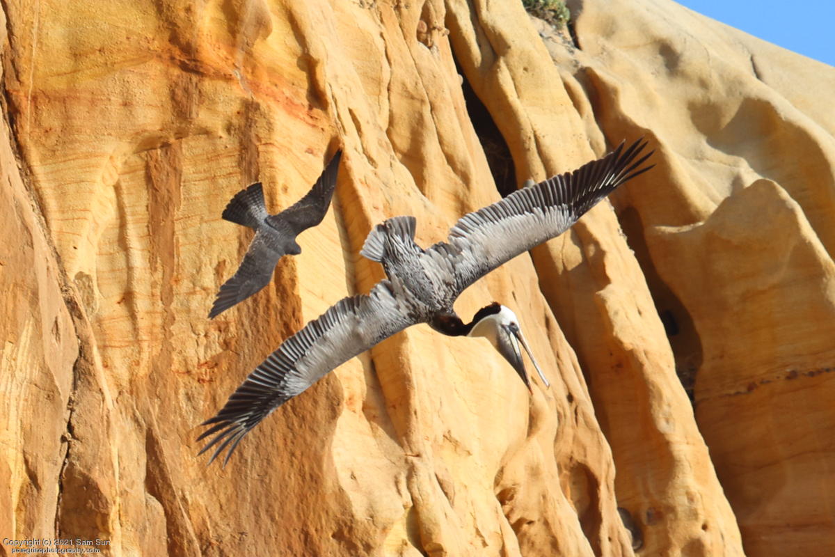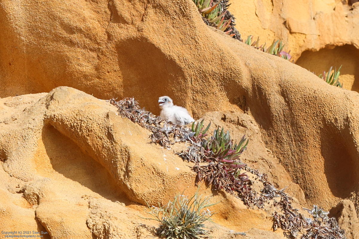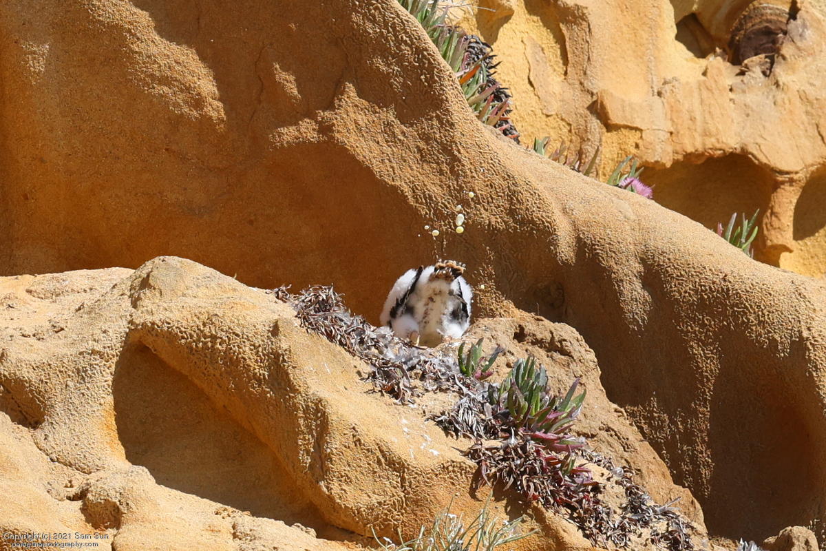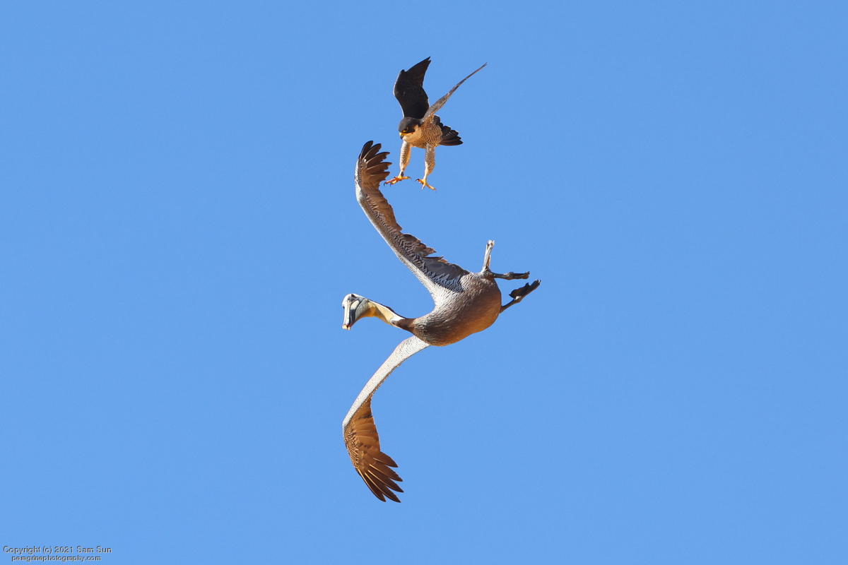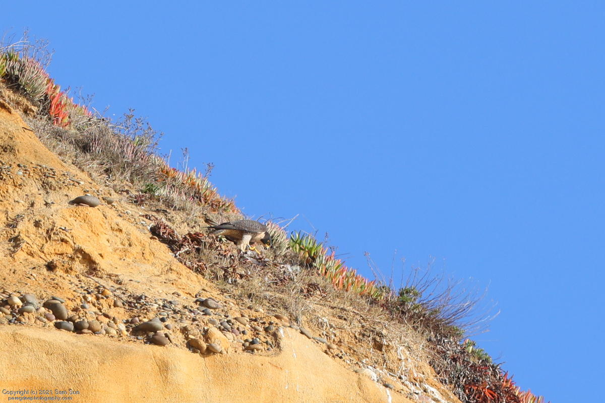 The chick posed for the cameras today separately with Dad and then Mom. There were a couple pelican chases, but the winds were pretty calm and not many came by. Dad brought in food for an exchange at 6:04p. Mom dropped it, and they both dove to recover it. I missed the recovery, but Dad apparently got it off the beach and they did another transfer within seconds.