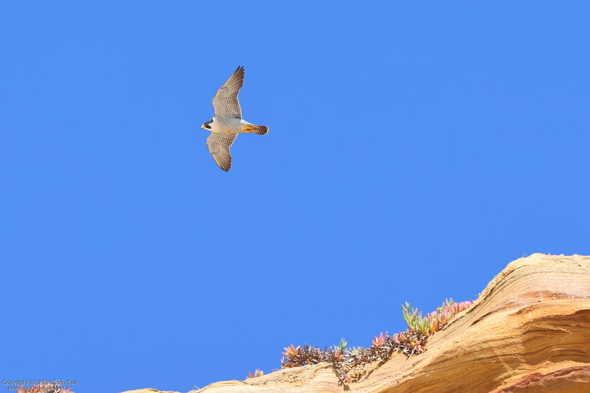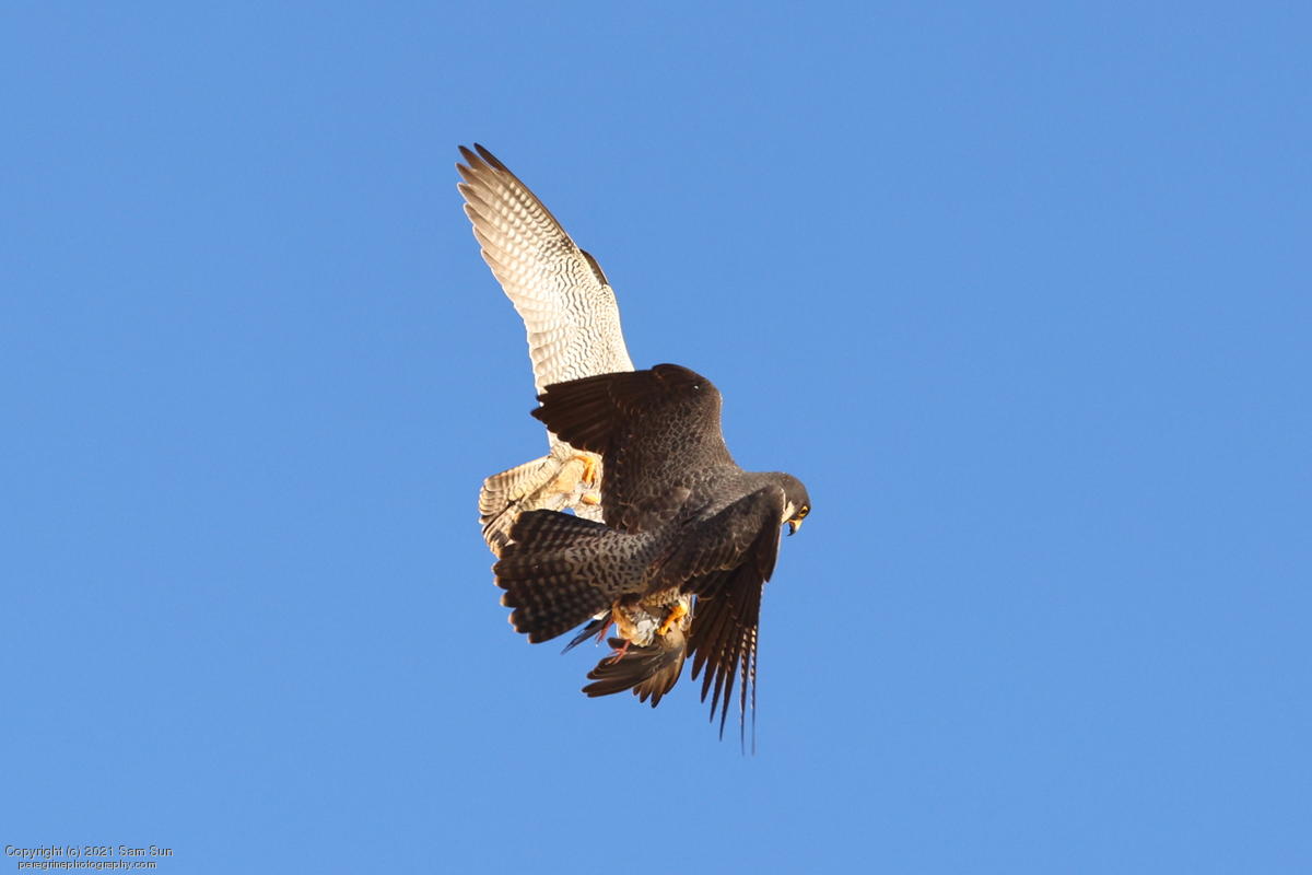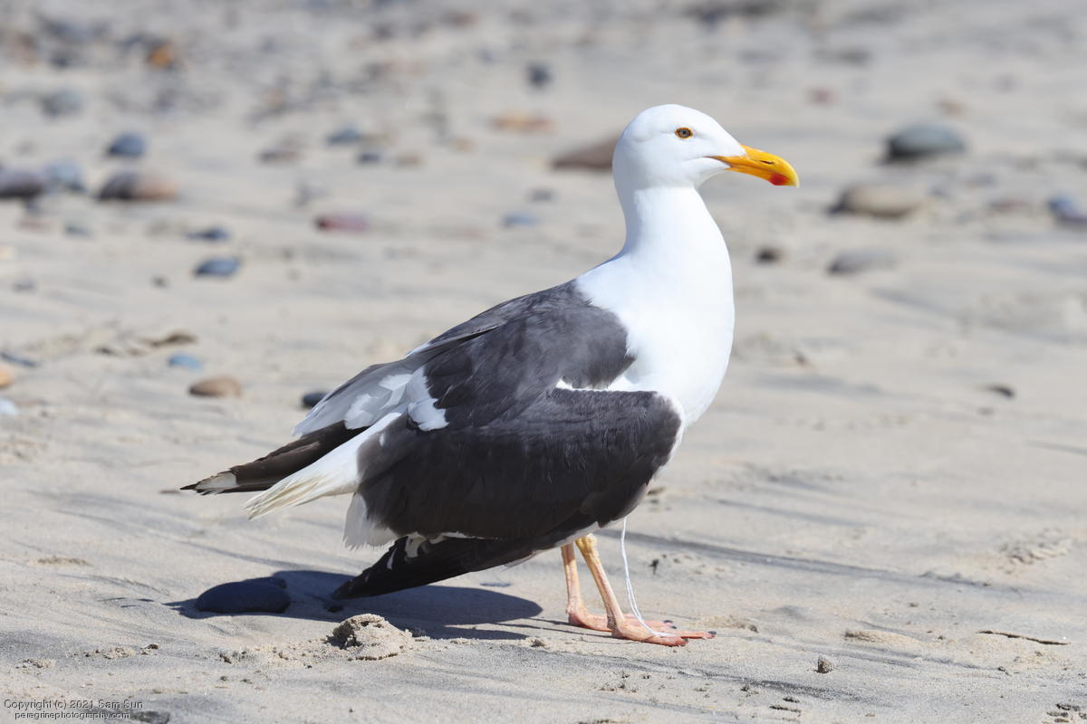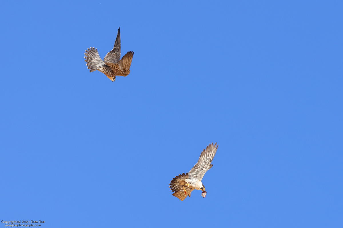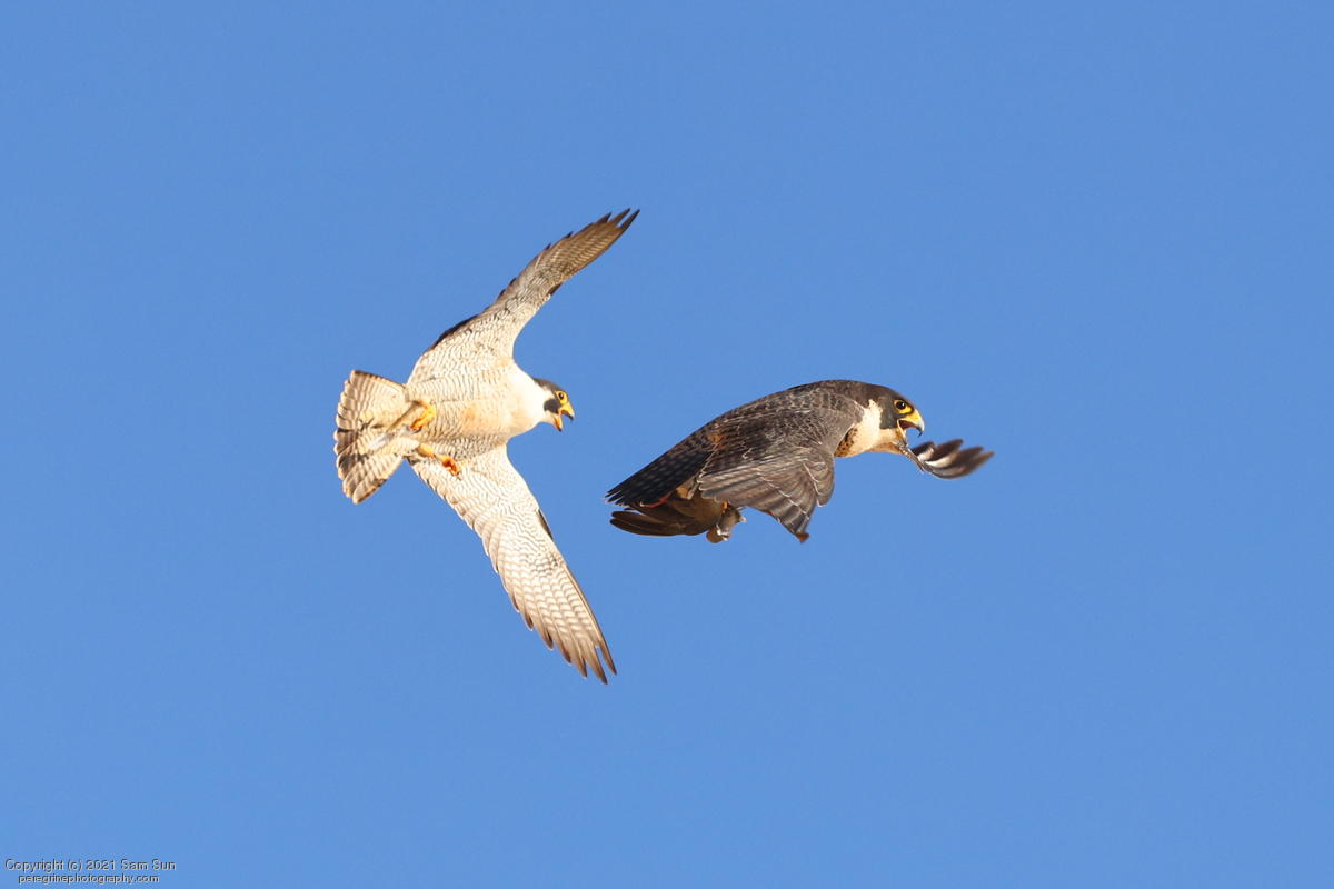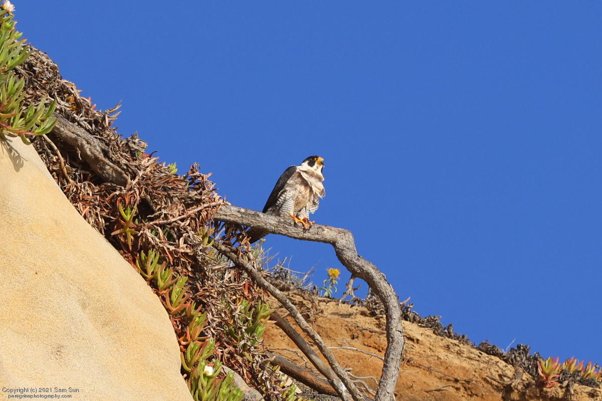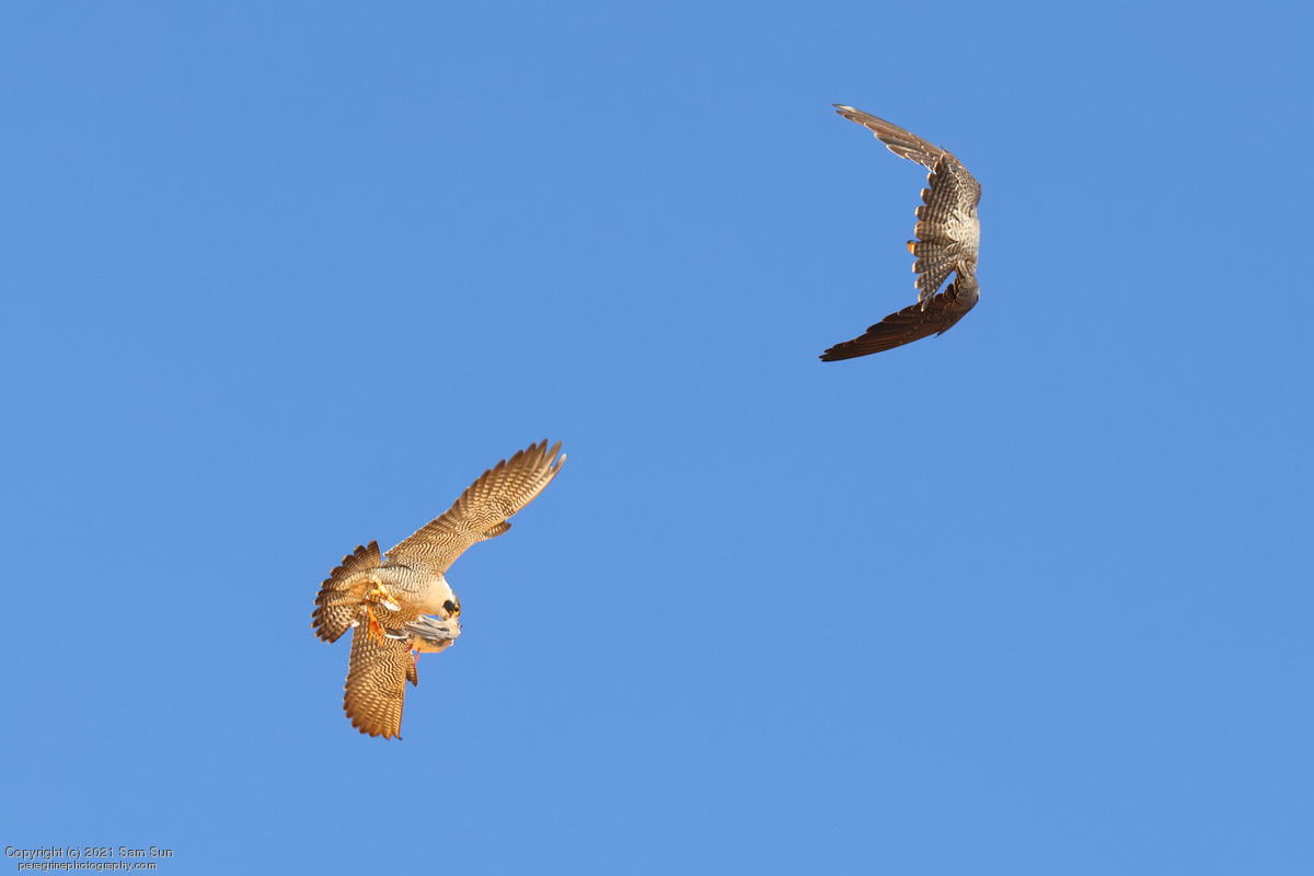 The chick posed for the cameras today separately with Dad and then Mom. There were a couple pelican chases, but the winds were pretty calm and not many came by. Dad brought in food for an exchange at 6:04p. Mom dropped it, and they both dove to recover it. I missed the recovery, but Dad apparently got it off the beach and they did another transfer within seconds.